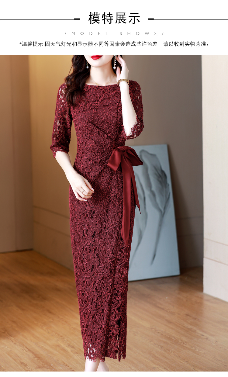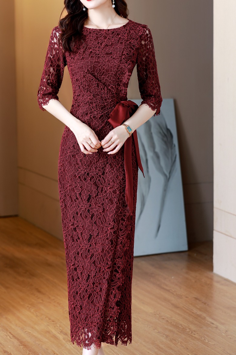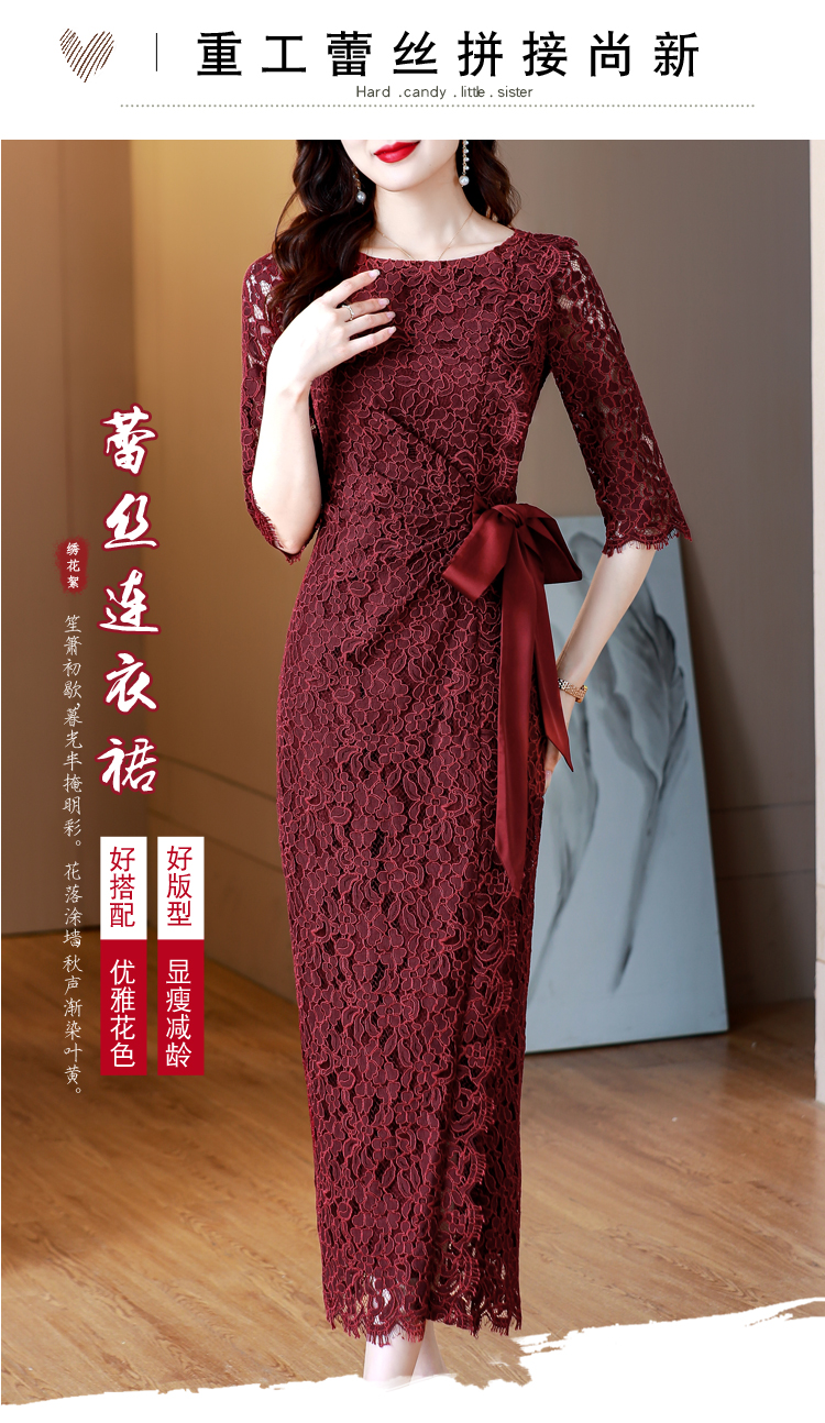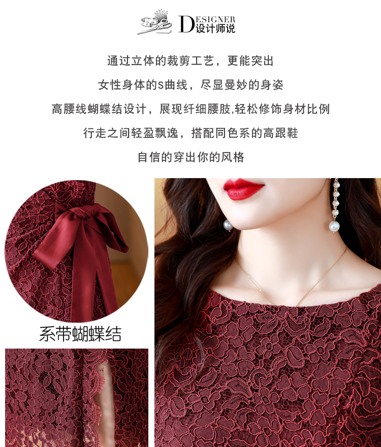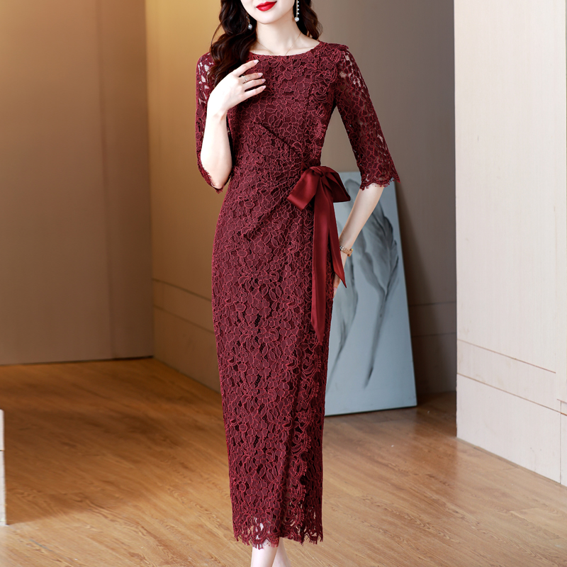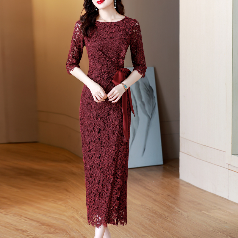 RY1718# 2026复古酒红色洋气蕾丝连衣裙轻熟贵气优雅女神喜宴宴会礼服长裙
