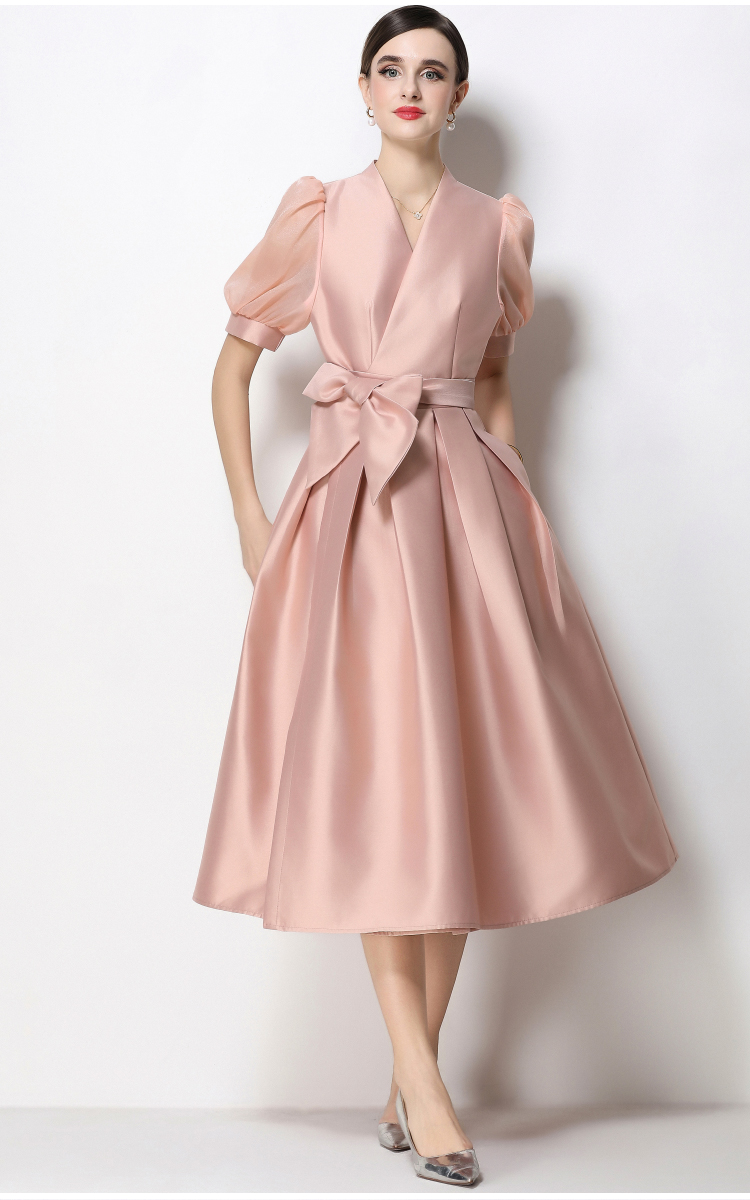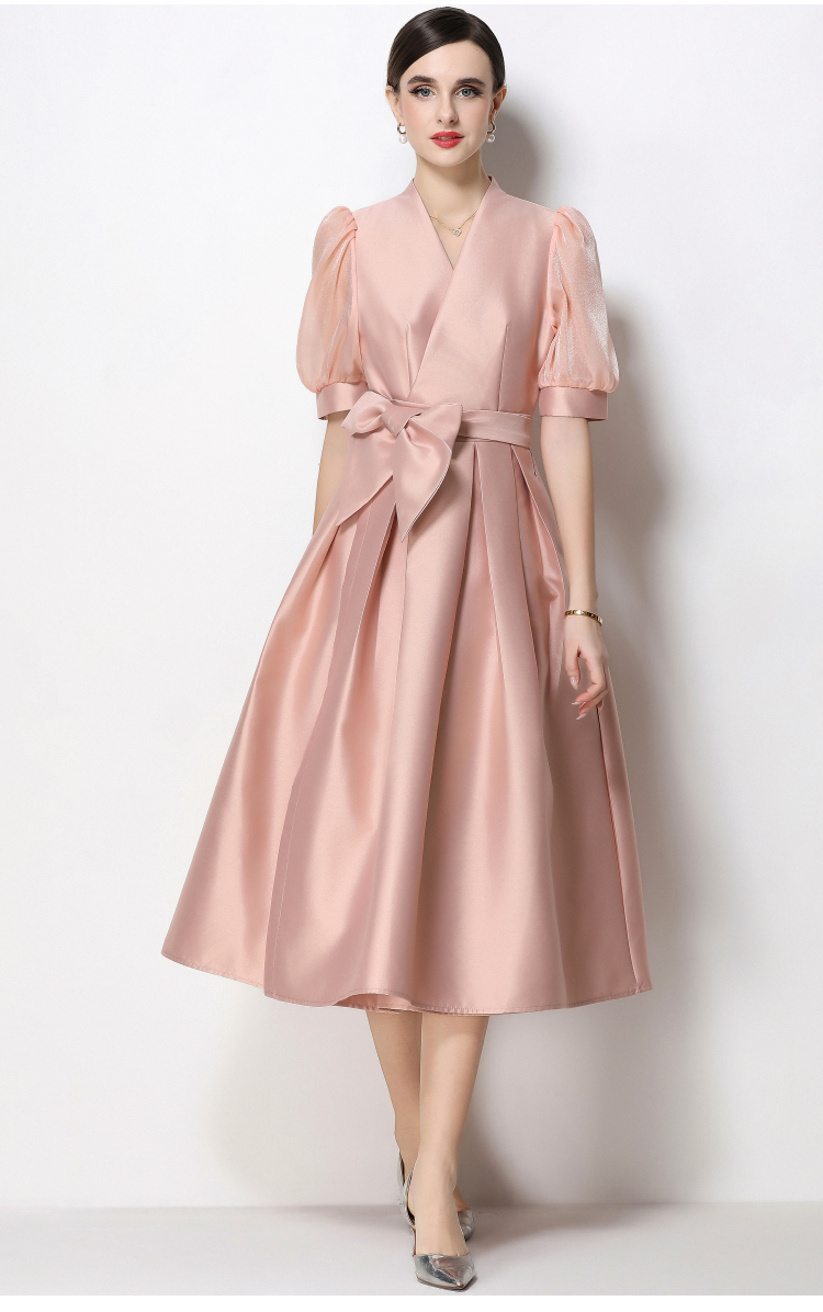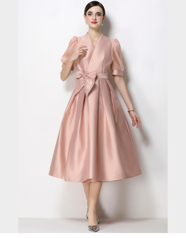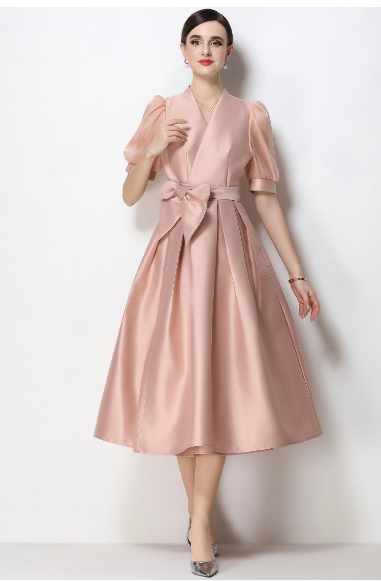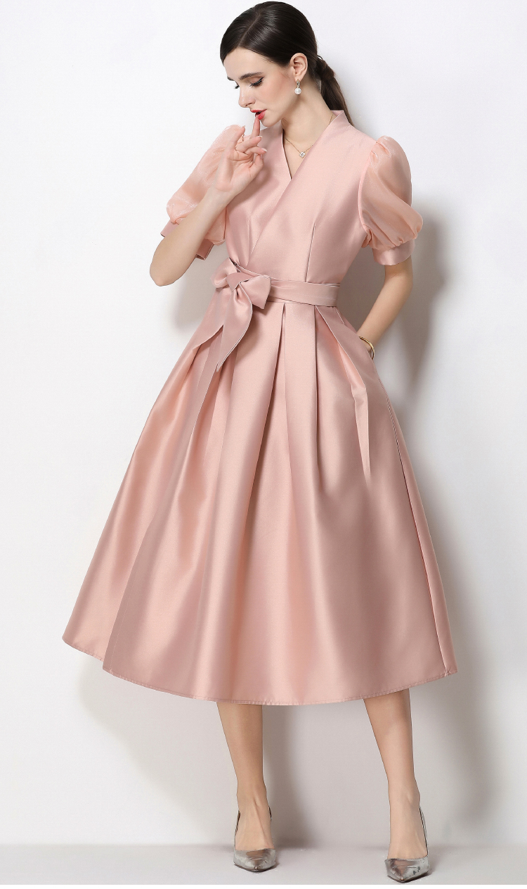 RY1744# 实拍优雅气质缎面V领连衣裙泡泡袖绑带收腰显瘦A字礼服裙配花朵