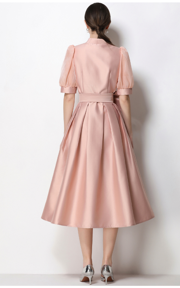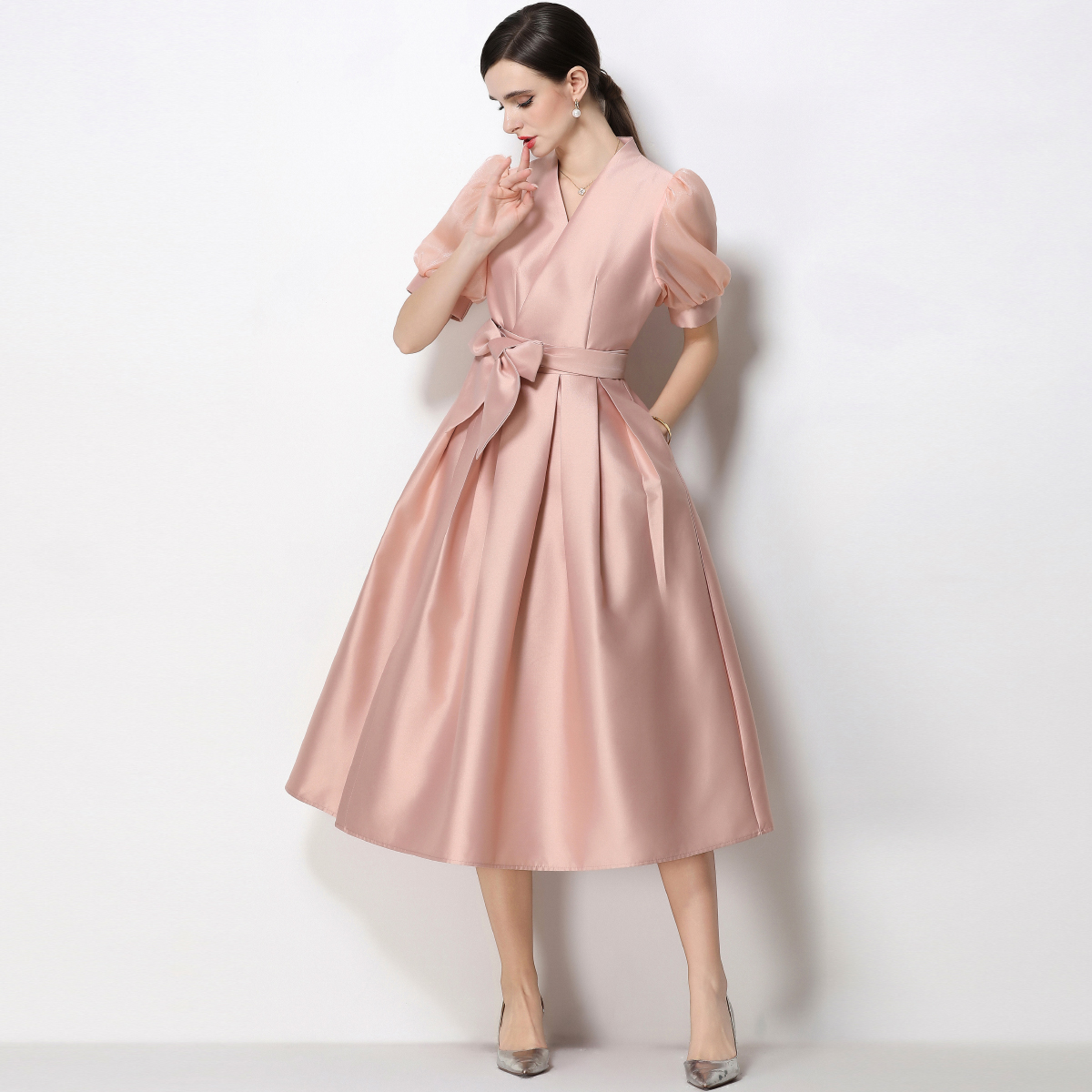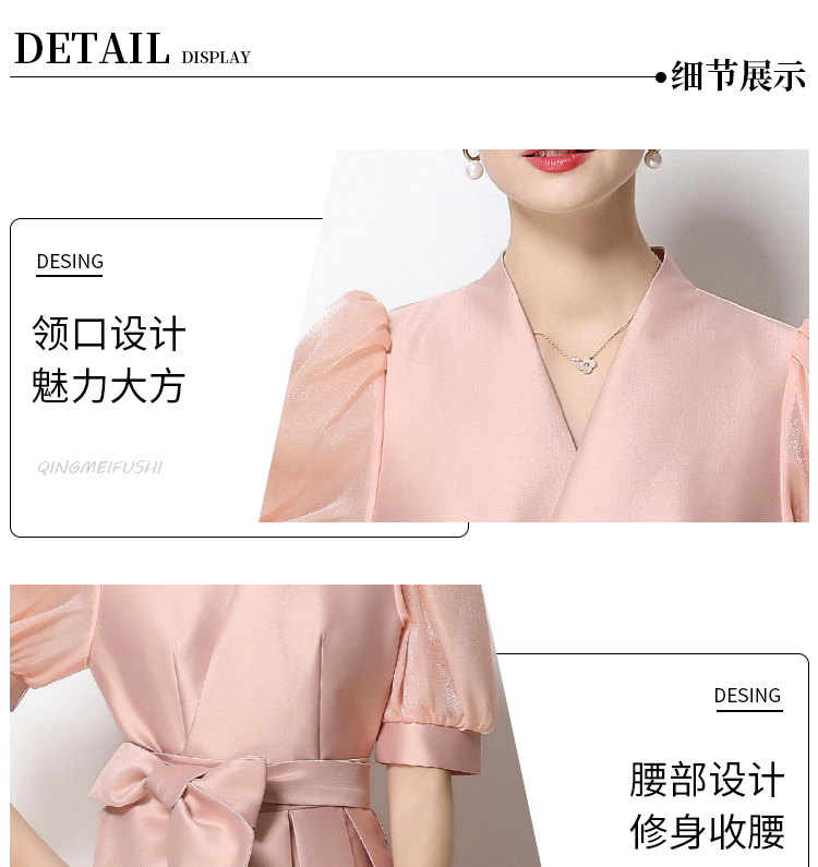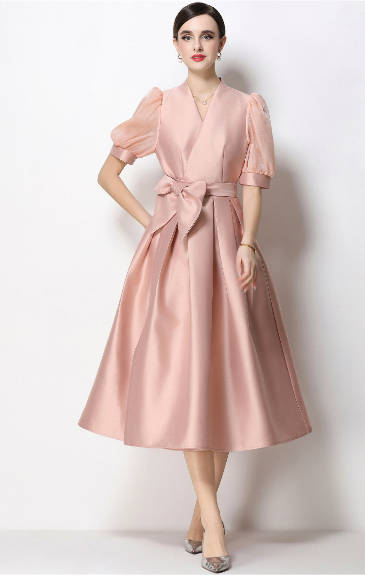 RY1744# 实拍优雅气质缎面V领连衣裙泡泡袖绑带收腰显瘦A字礼服裙配花朵