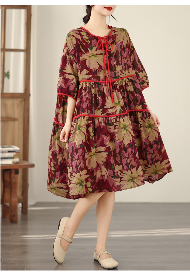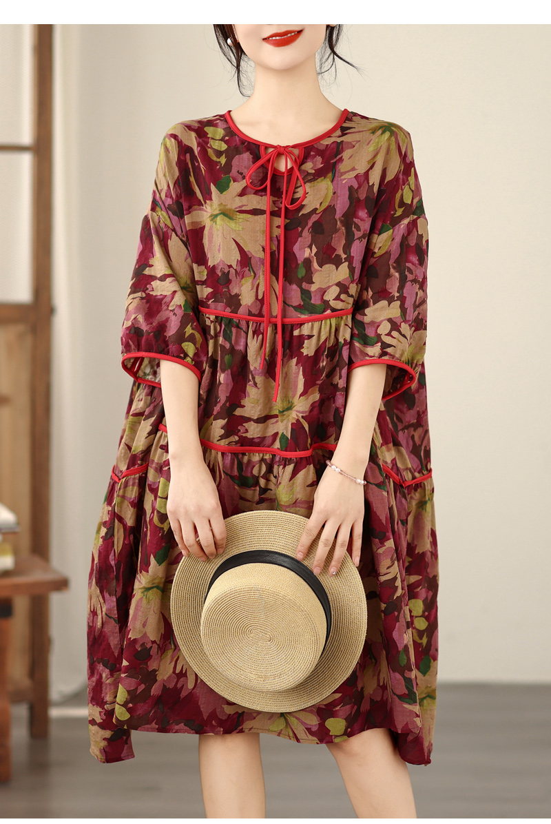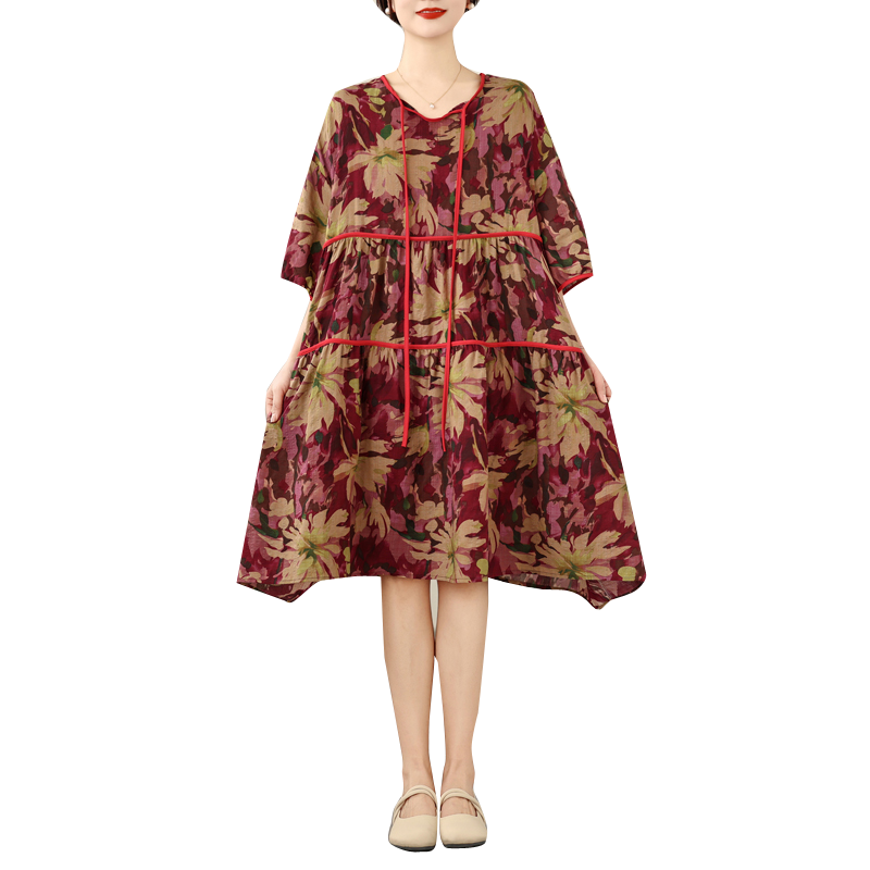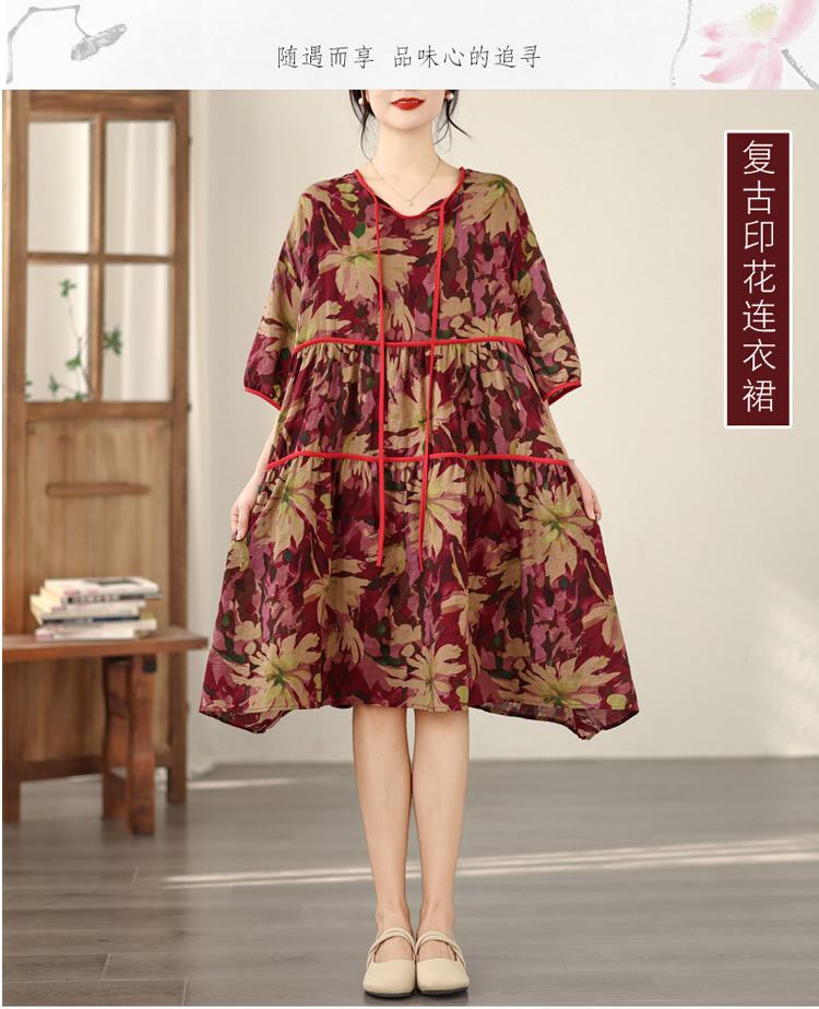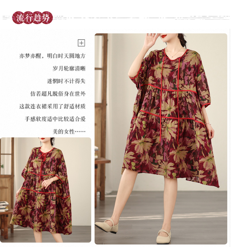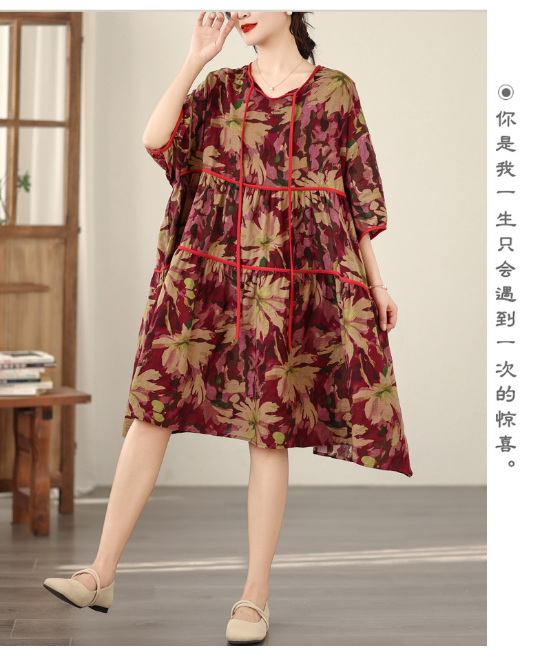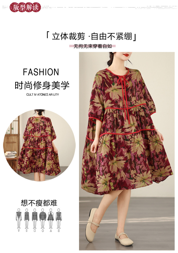 RY1867# 实拍2026新款夏季大码棉麻印花领口系绳宽松气质显瘦百搭连衣裙