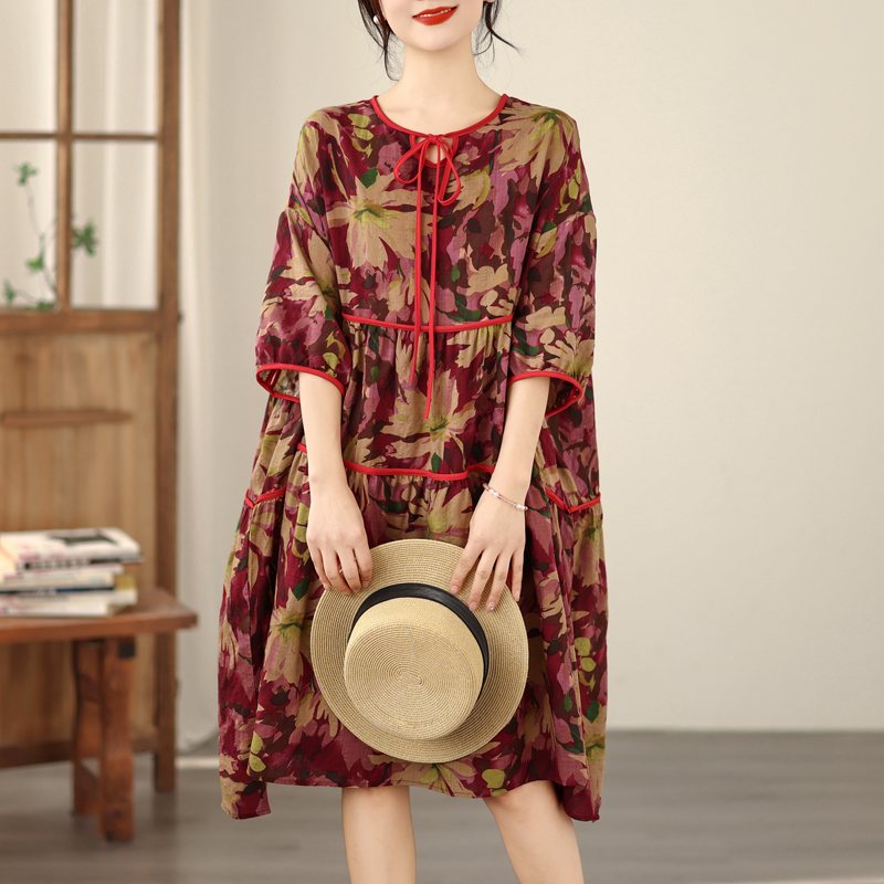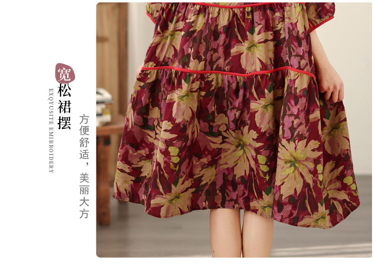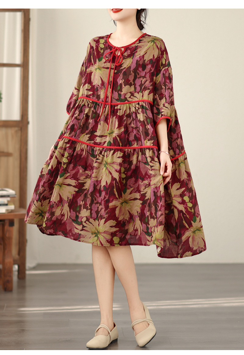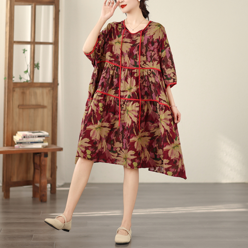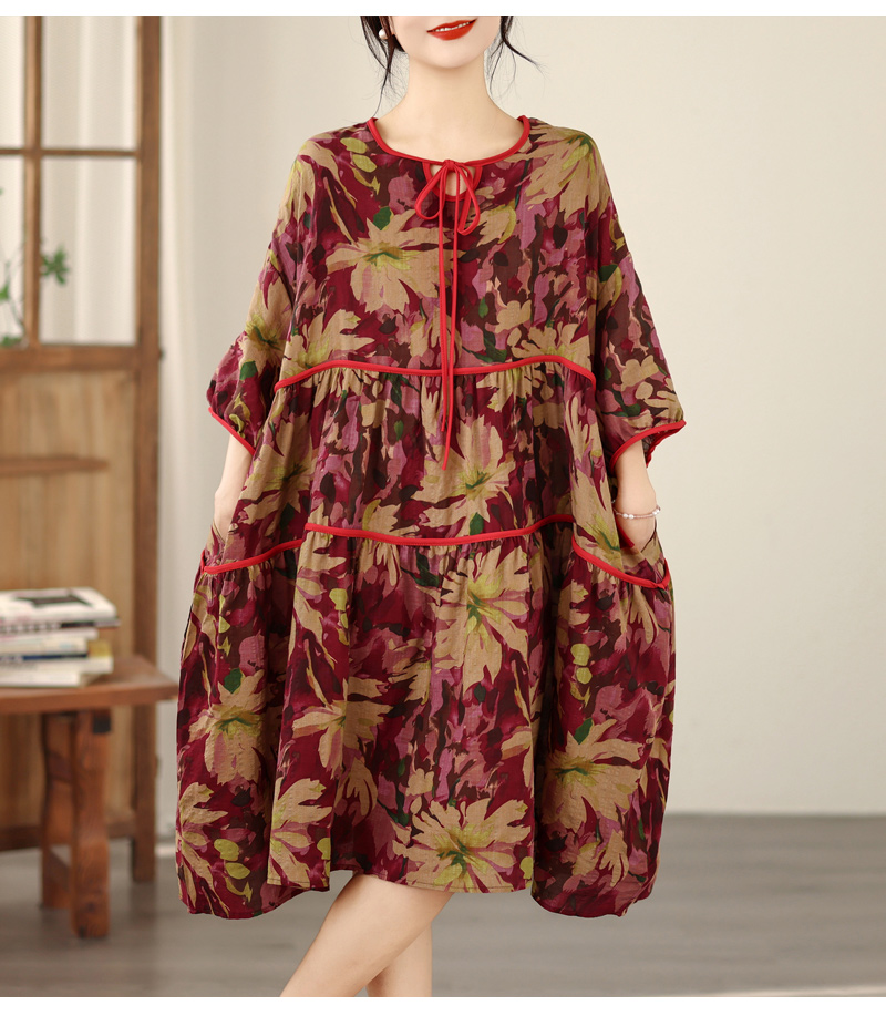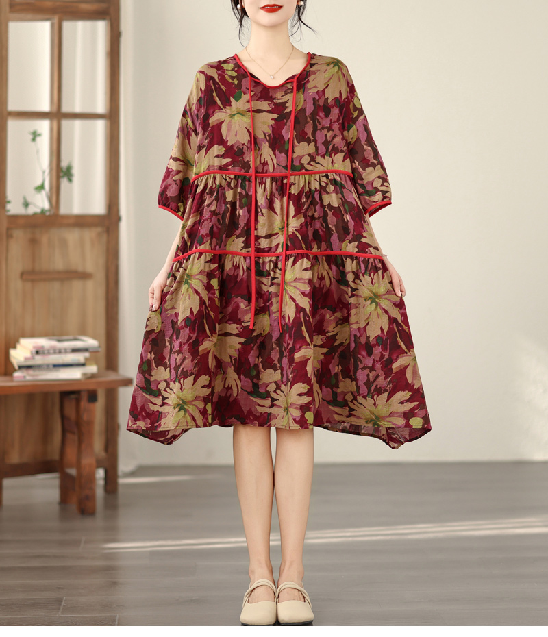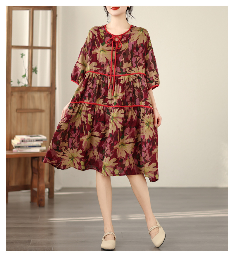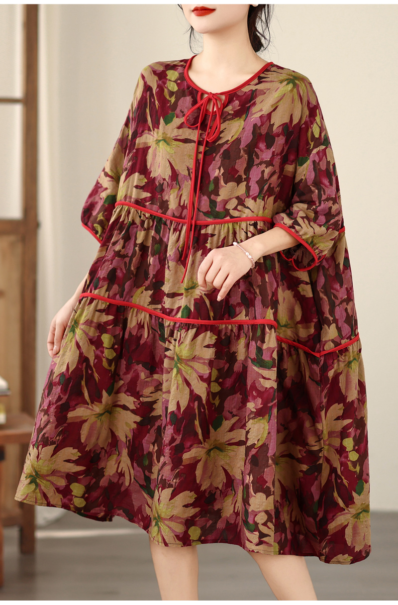 RY1867# 实拍2026新款夏季大码棉麻印花领口系绳宽松气质显瘦百搭连衣裙