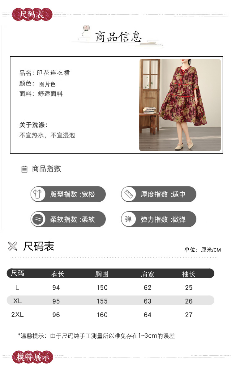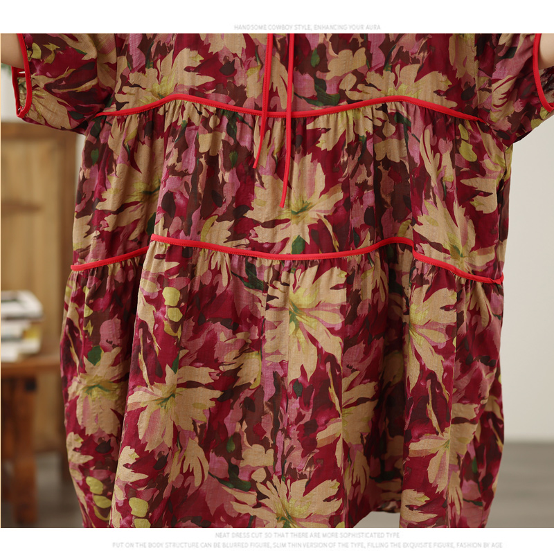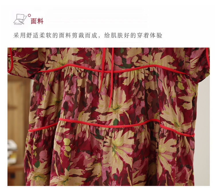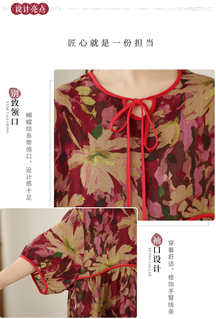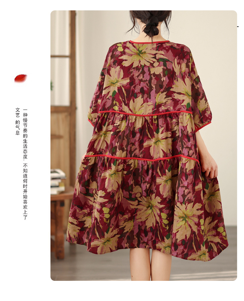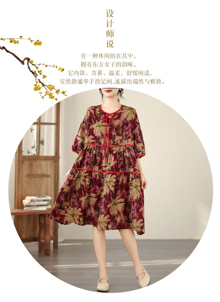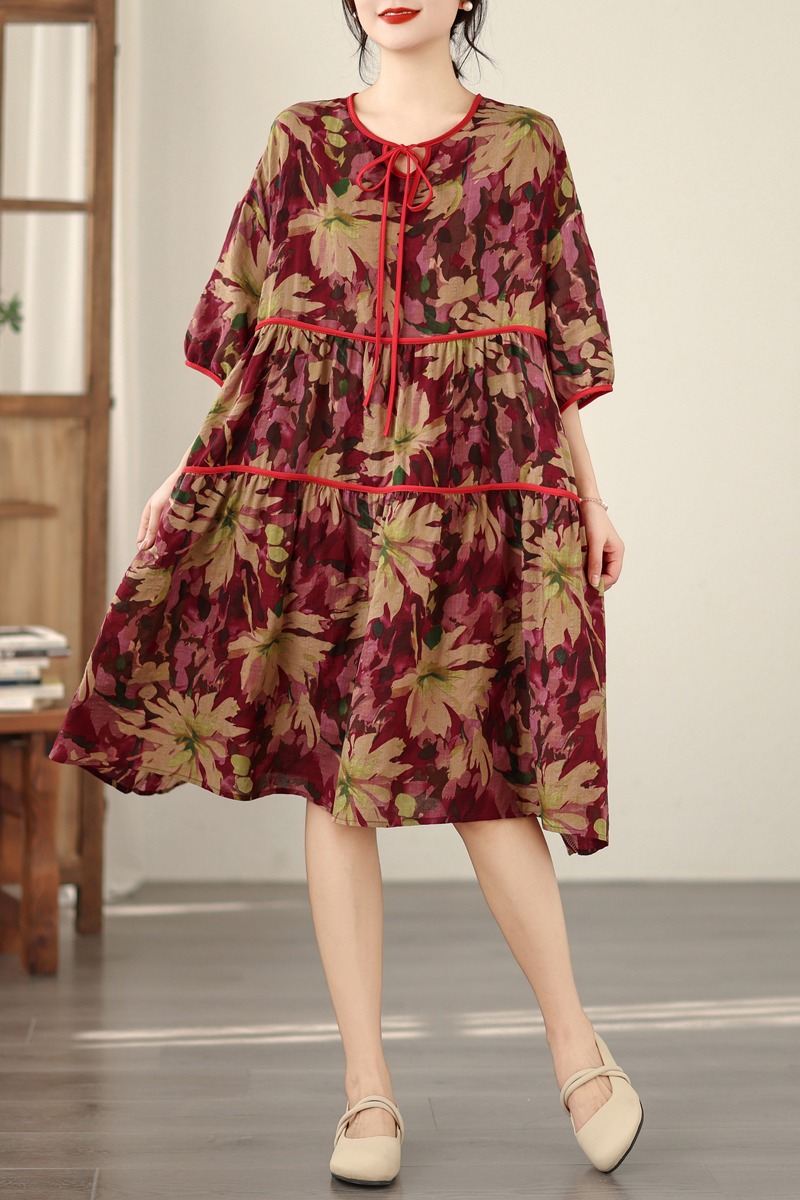 RY1867# 实拍2026新款夏季大码棉麻印花领口系绳宽松气质显瘦百搭连衣裙