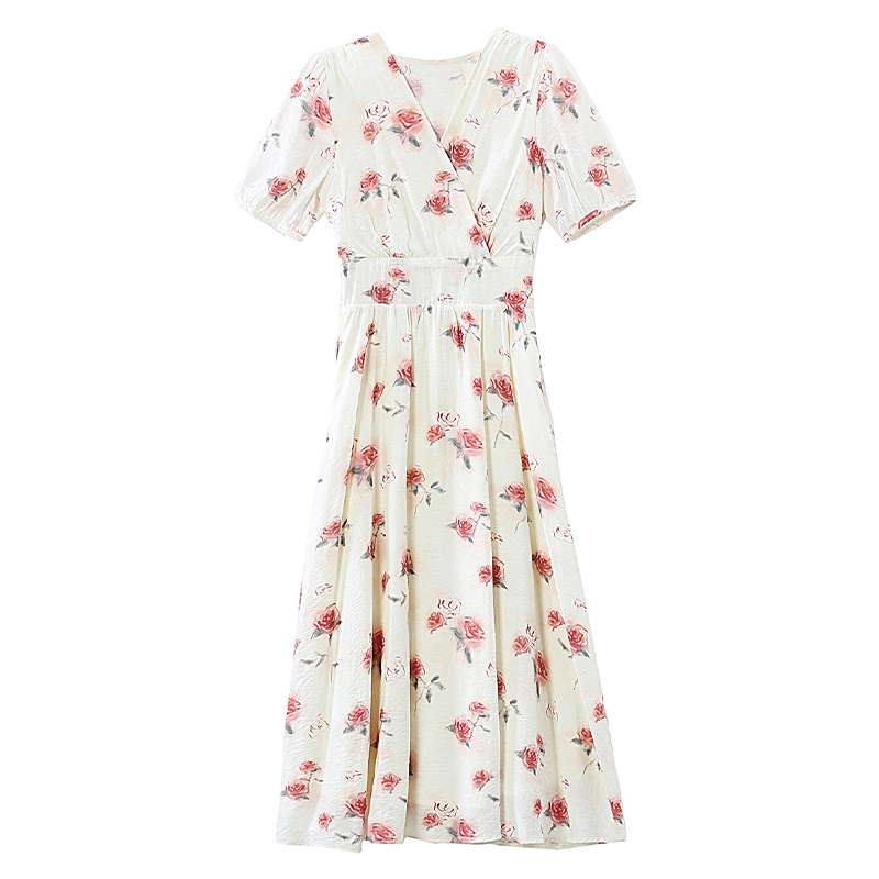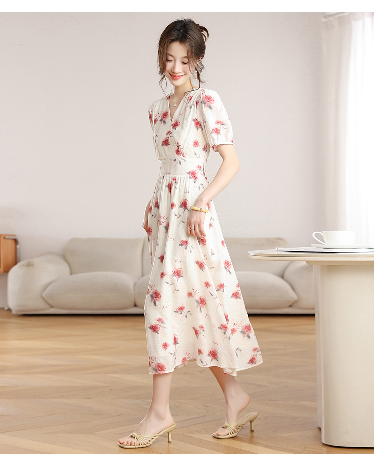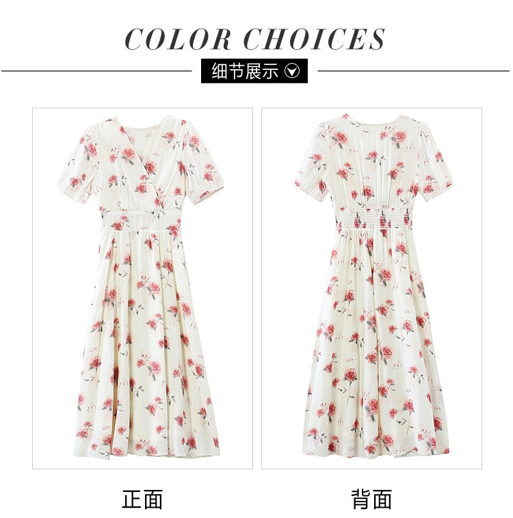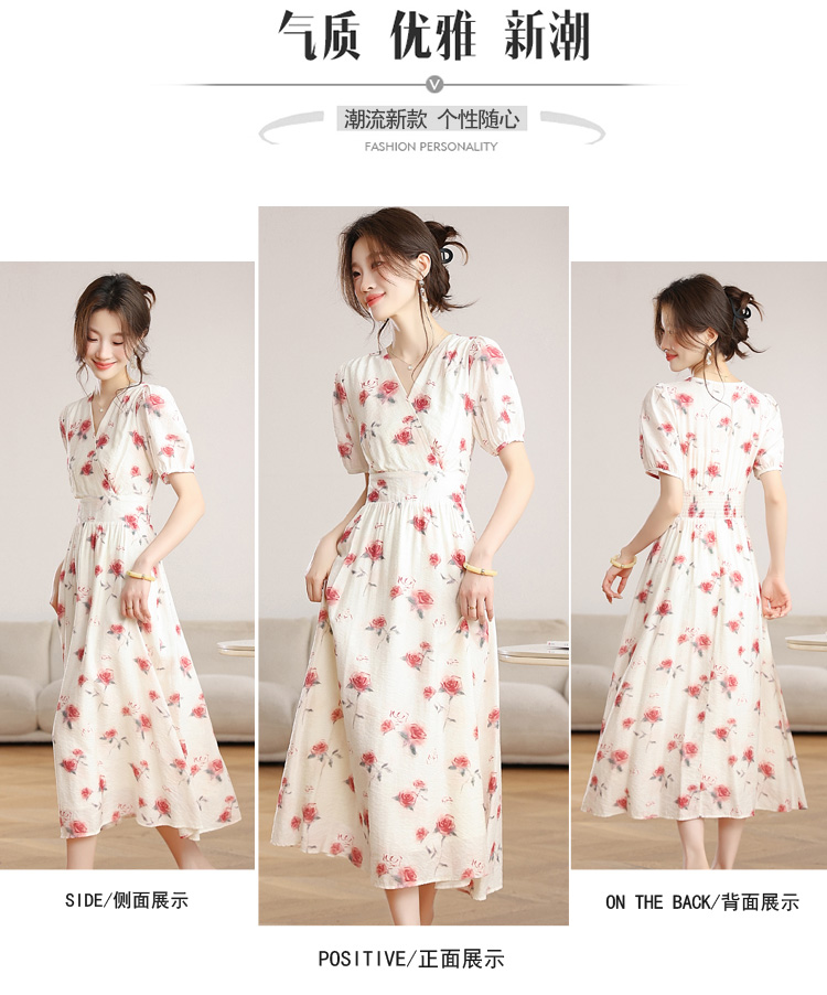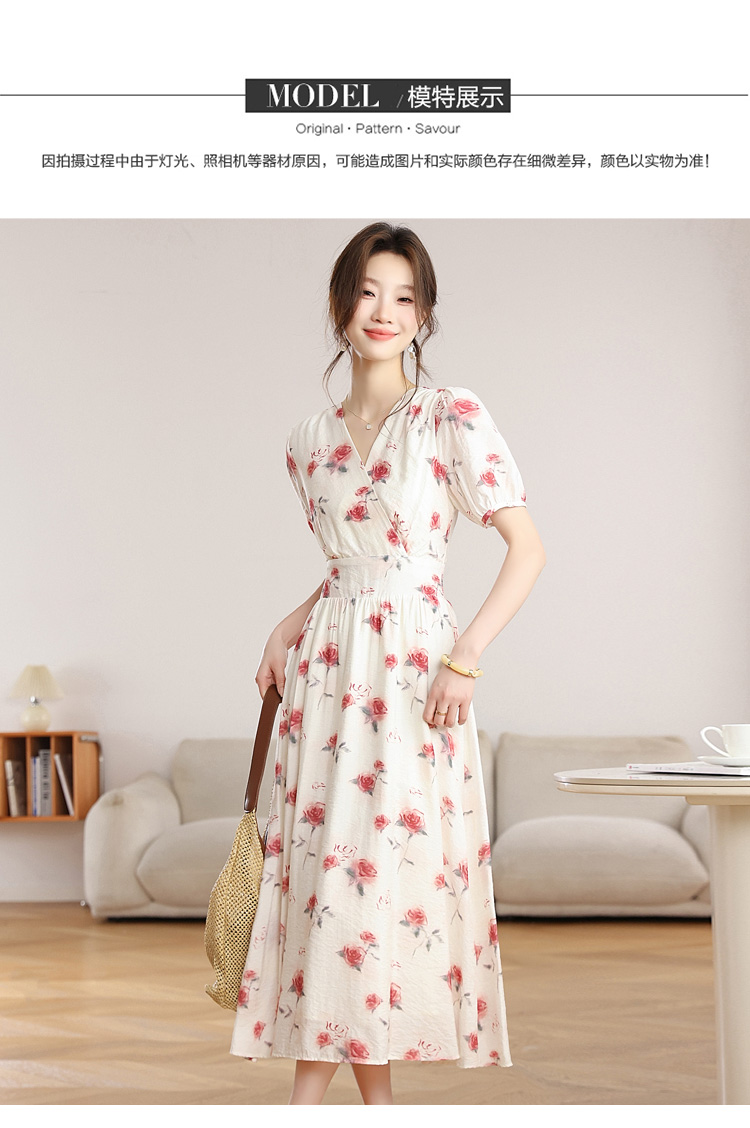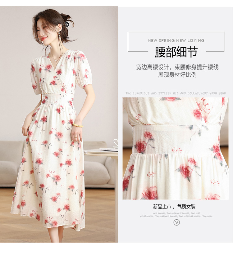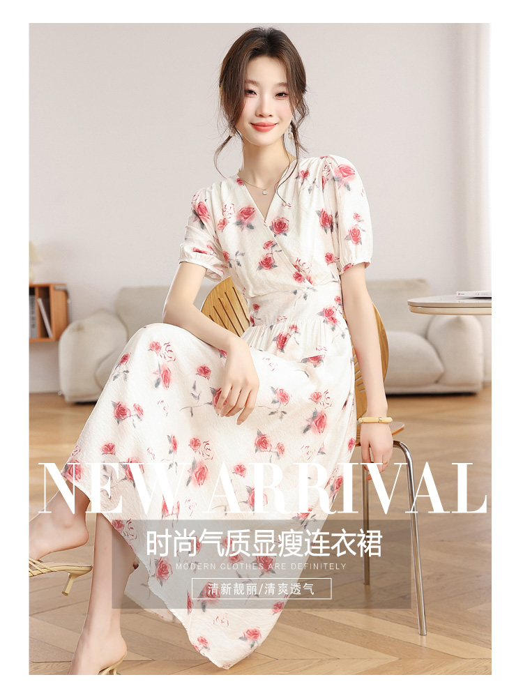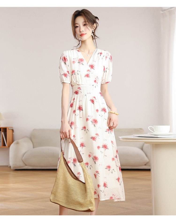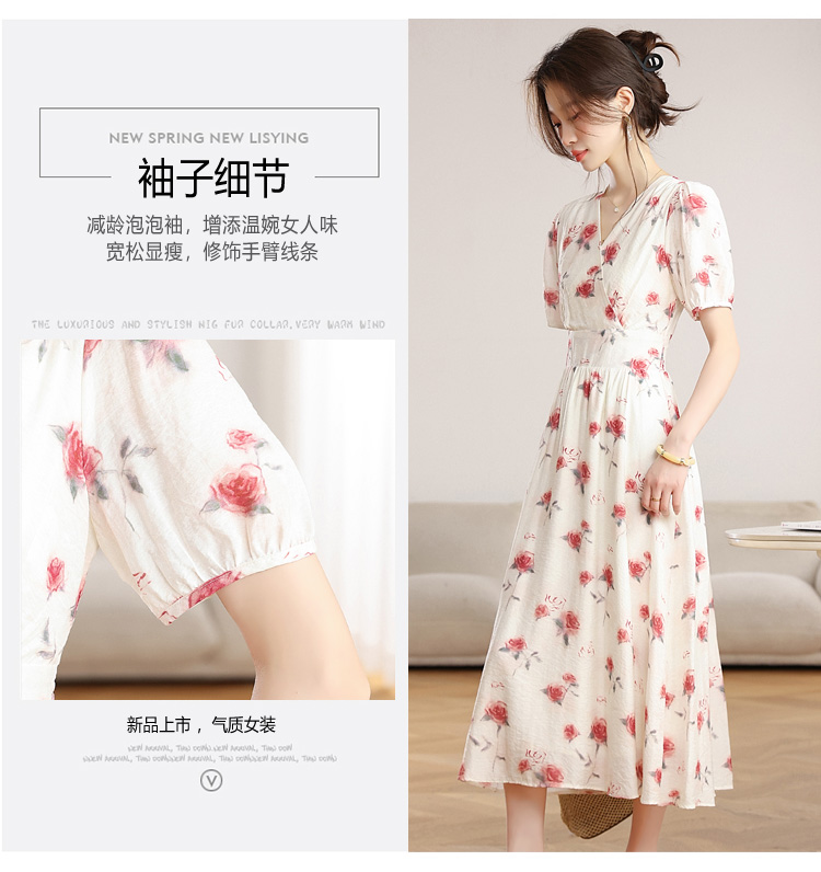 RY1880# 实拍 泡泡袖V领碎花连衣裙女夏季收腰显瘦高级感度假风气质长裙