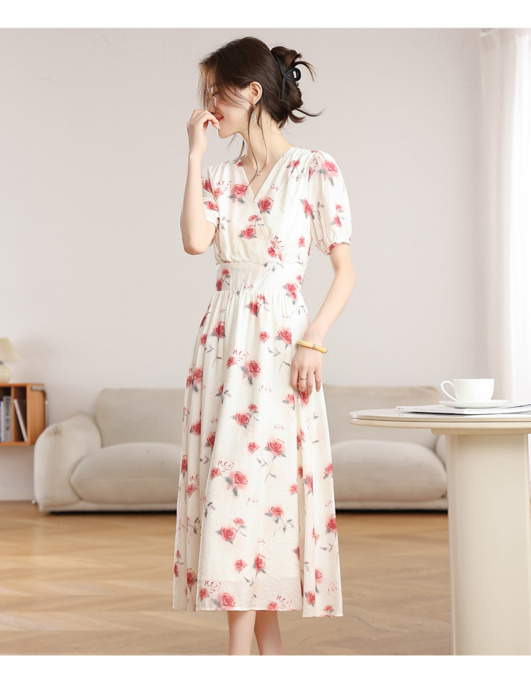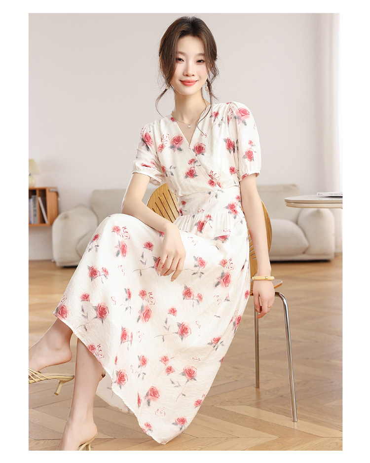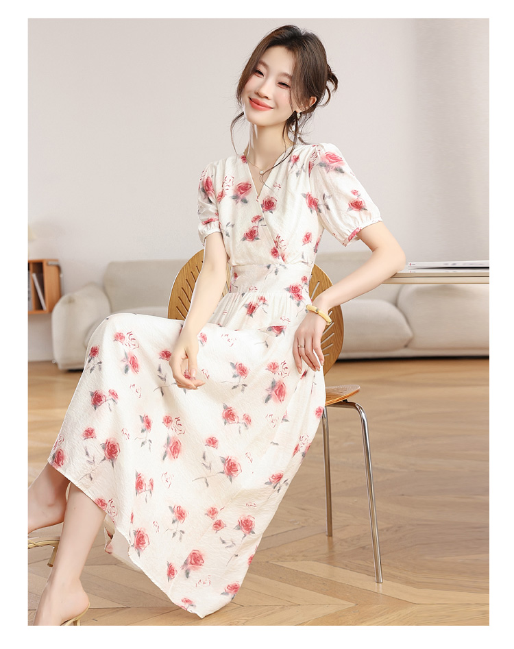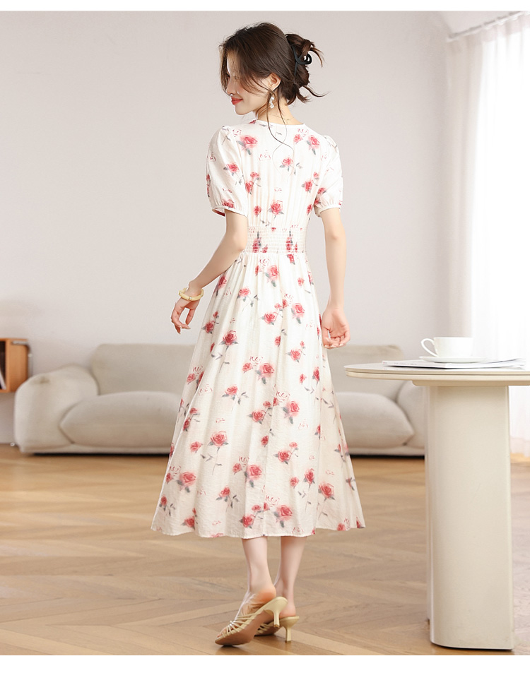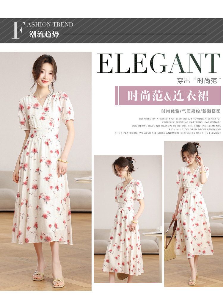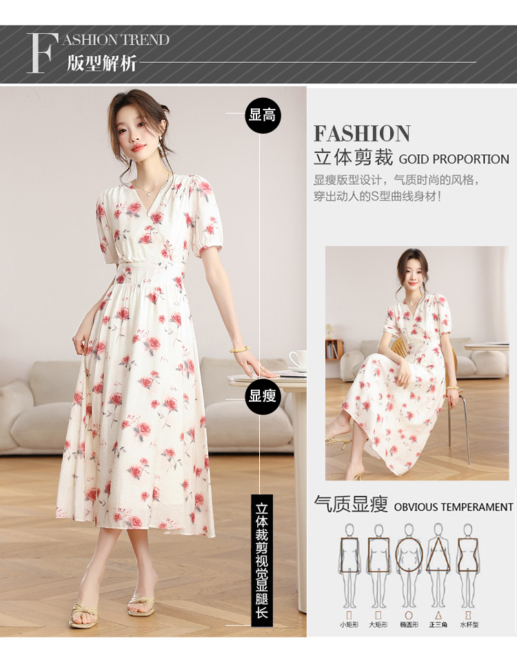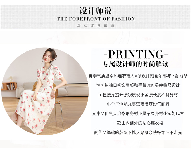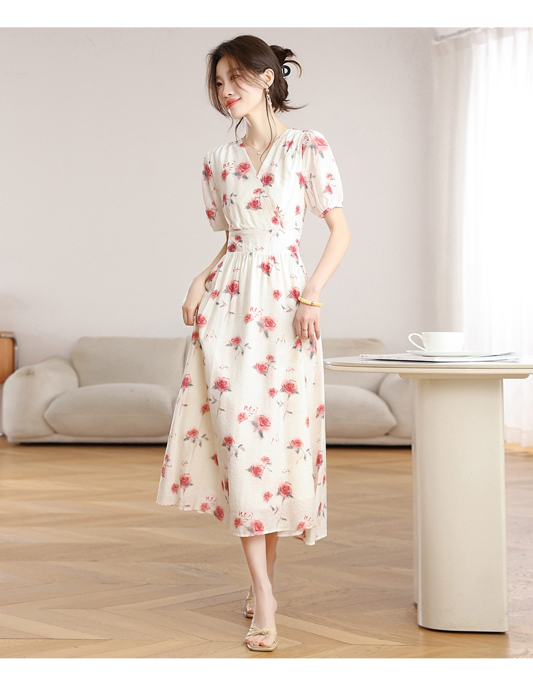 RY1880# 实拍 泡泡袖V领碎花连衣裙女夏季收腰显瘦高级感度假风气质长裙