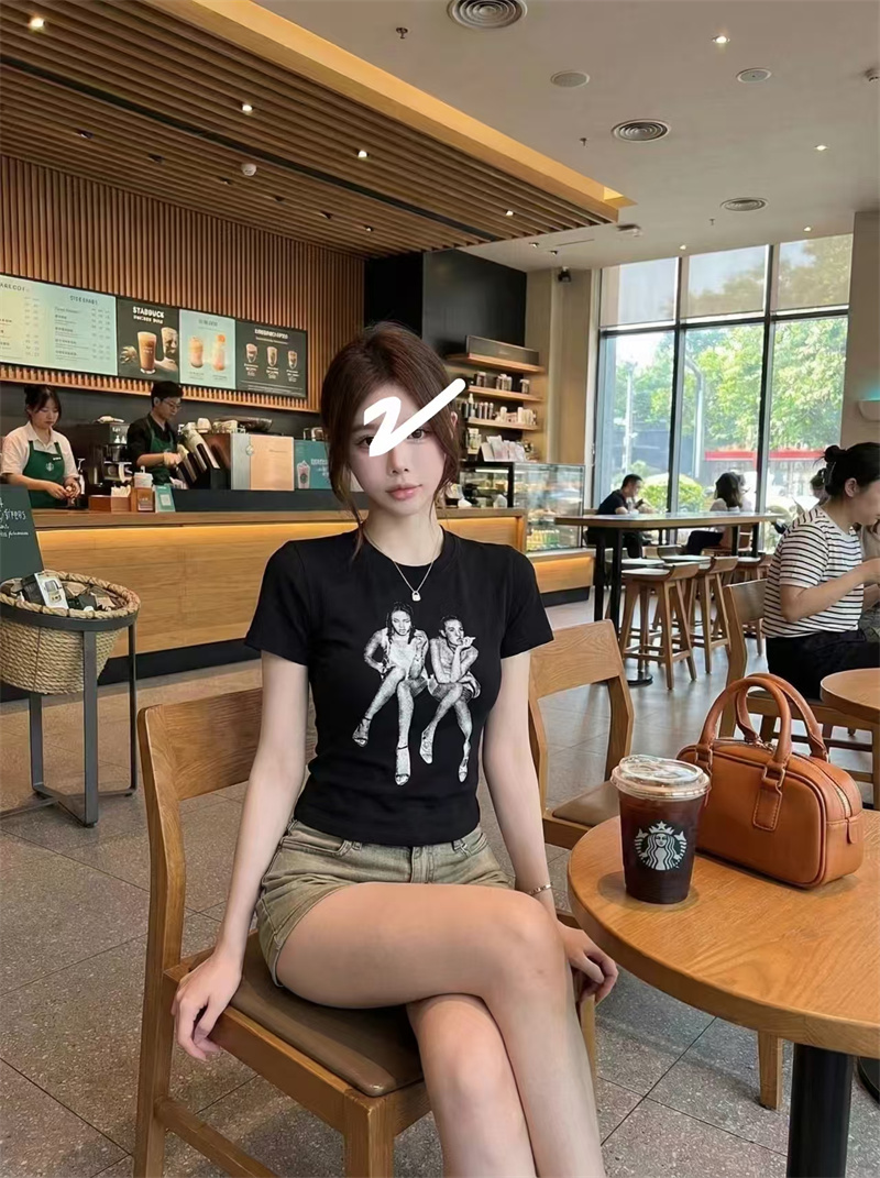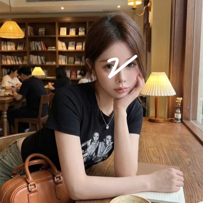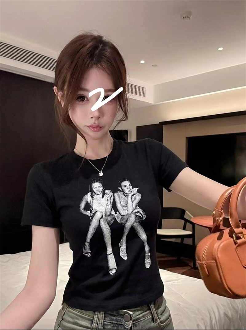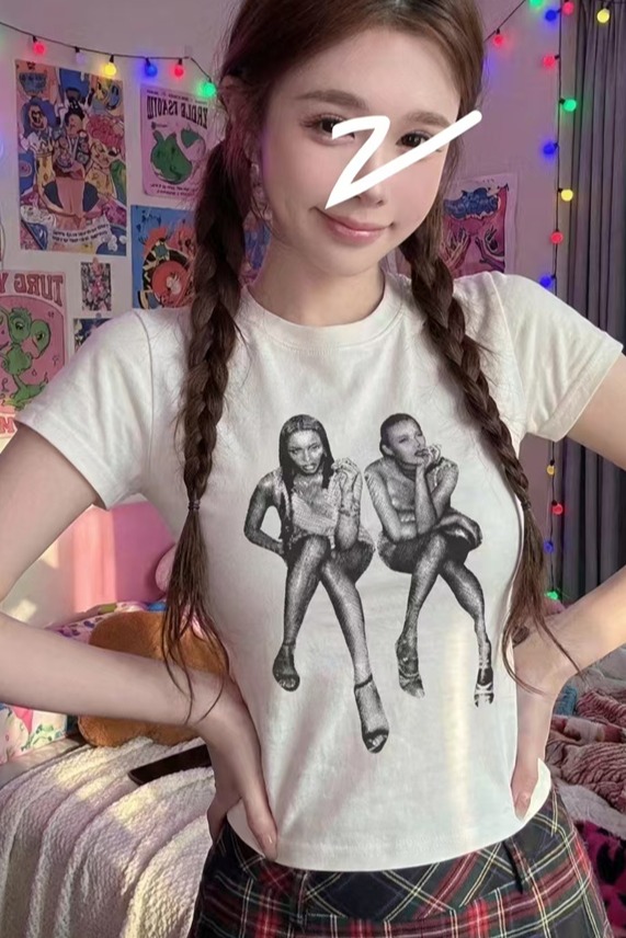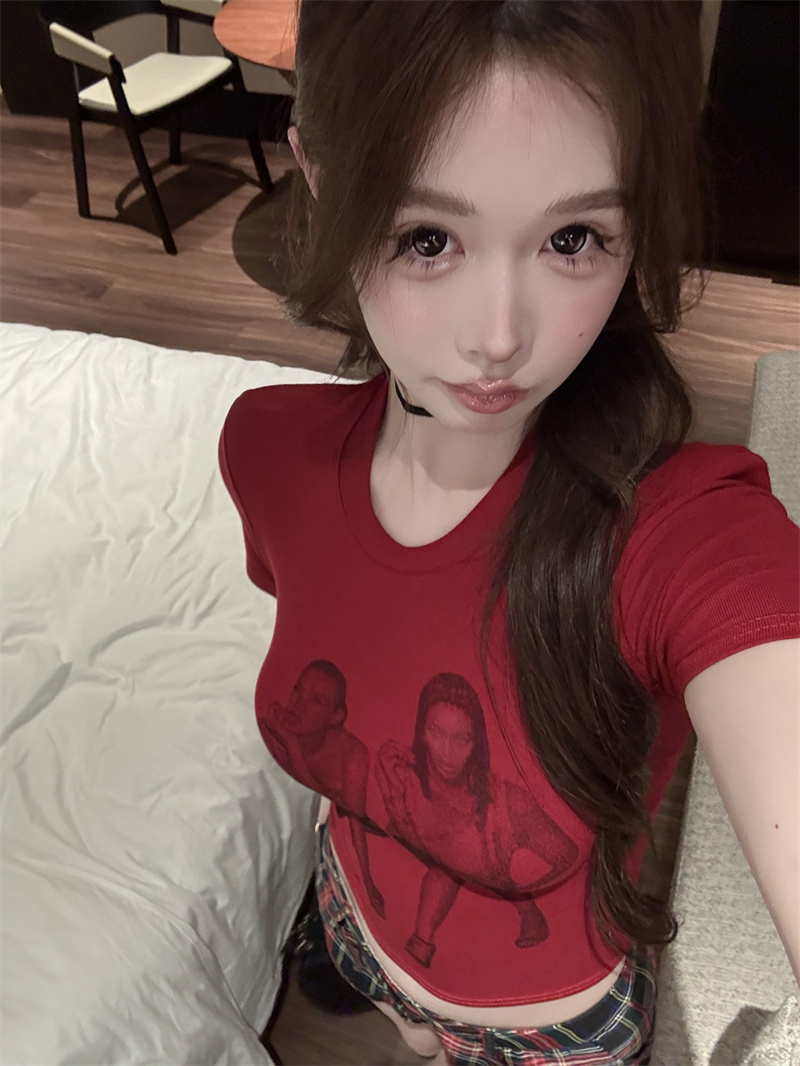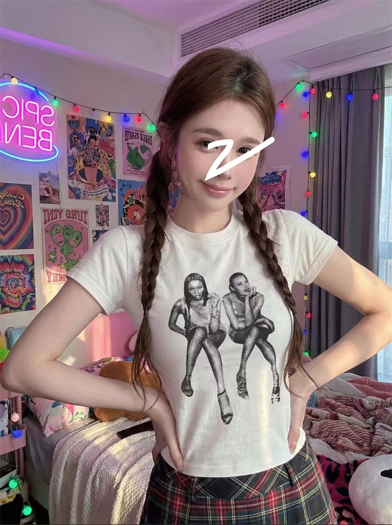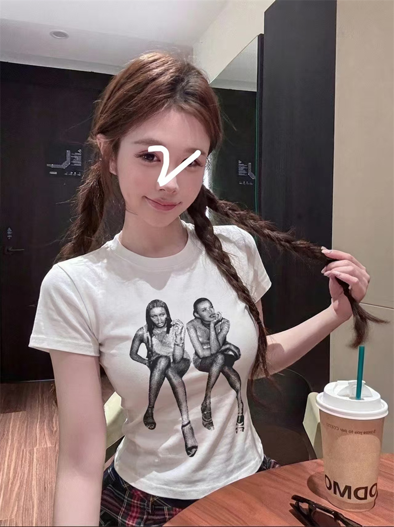 RY1992# 实价实拍~美式正肩T恤女夏季辣妹人像印花修身短袖收腰短款圆领衫