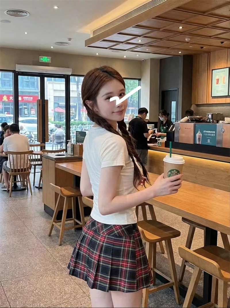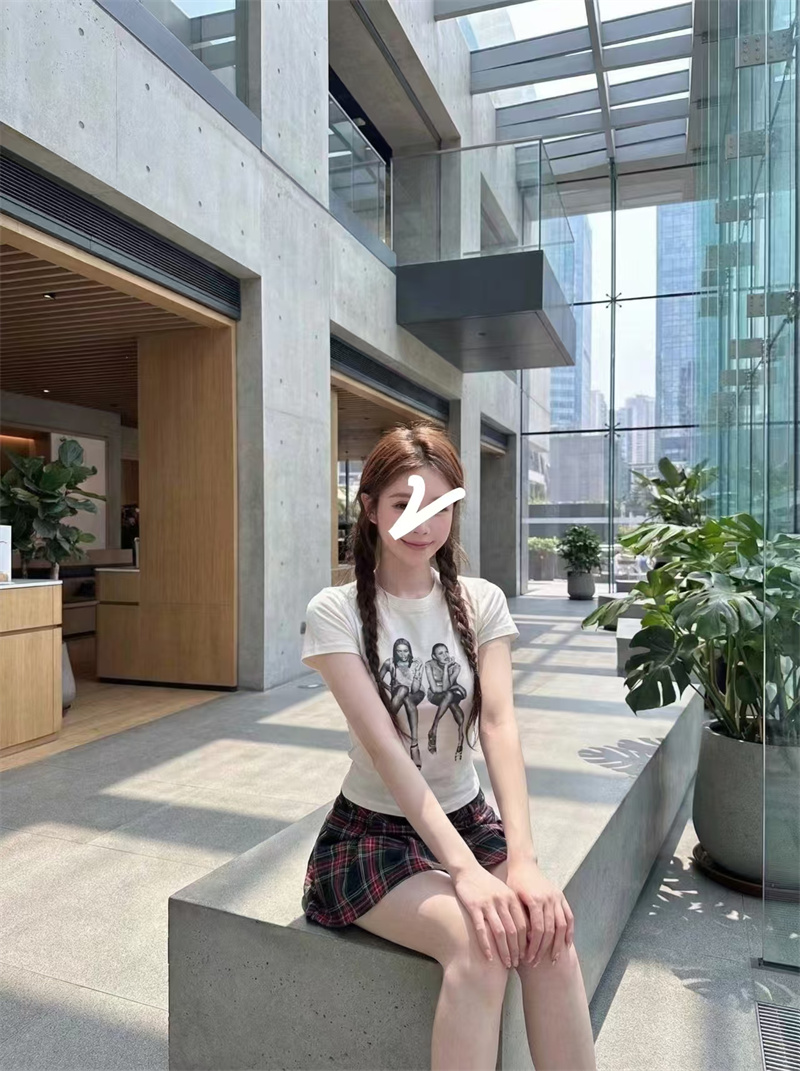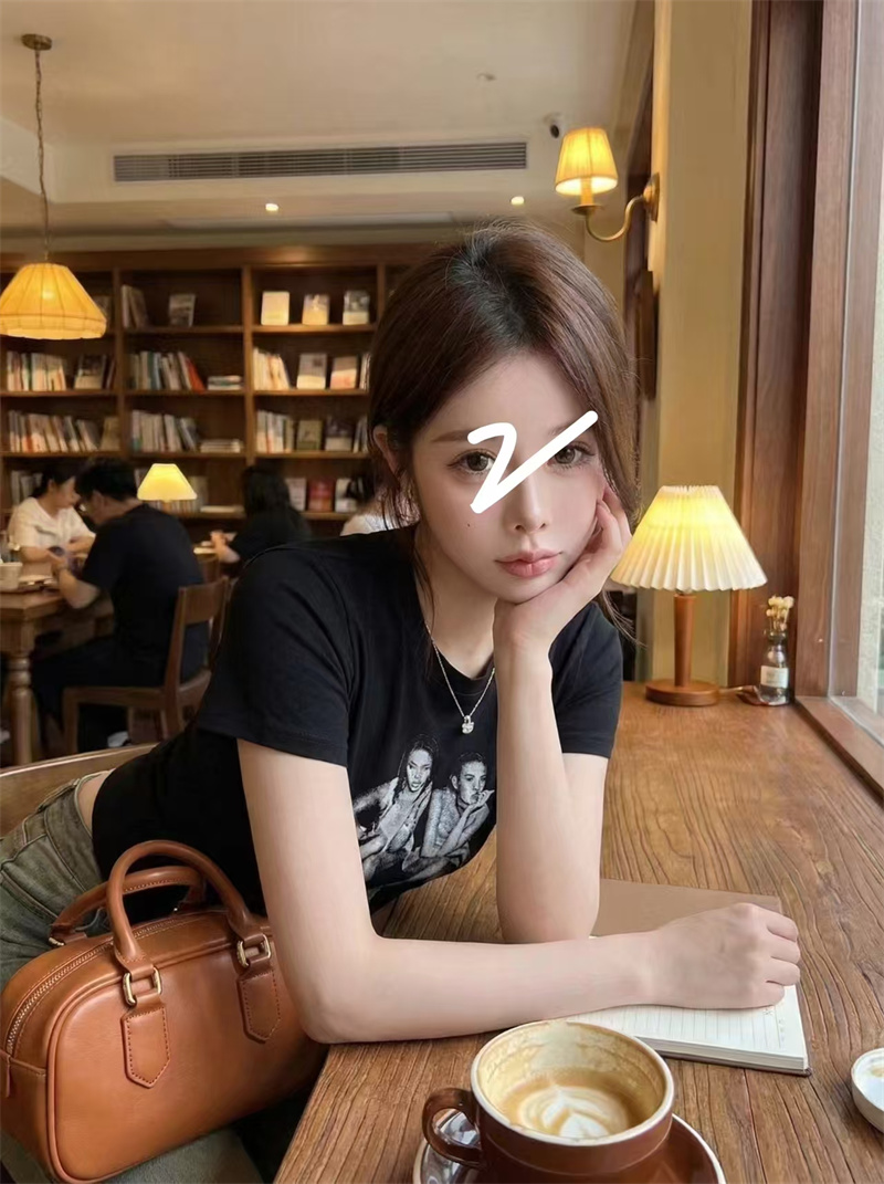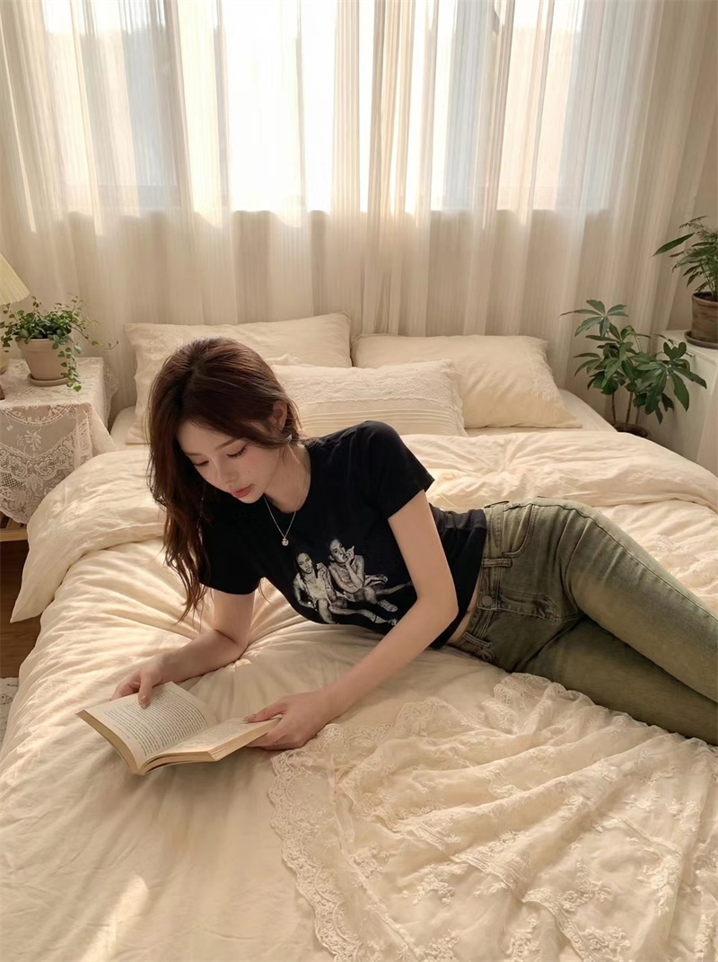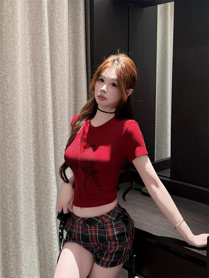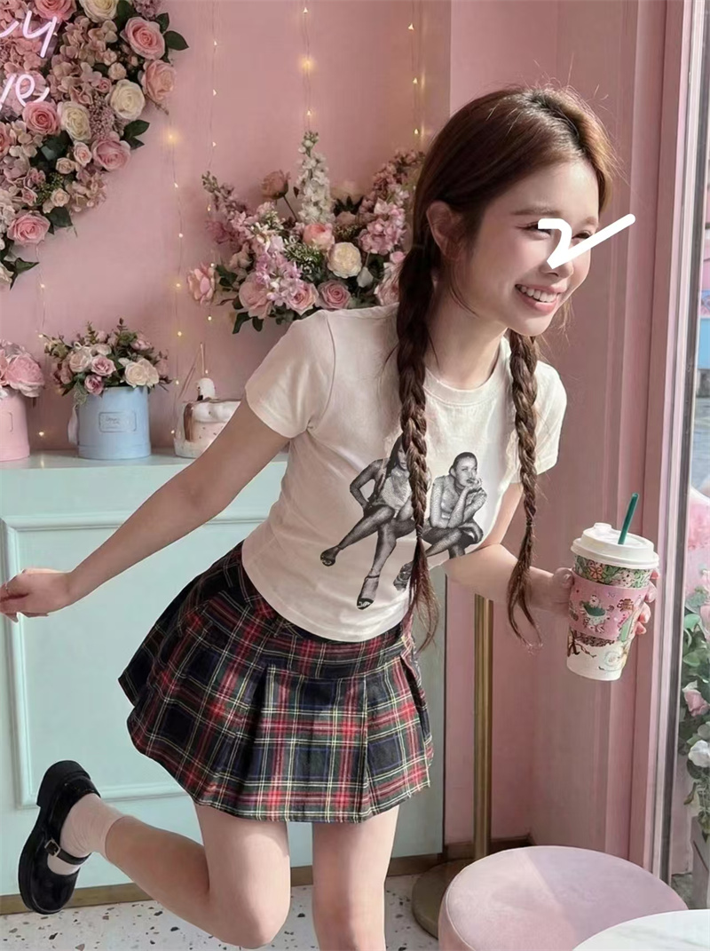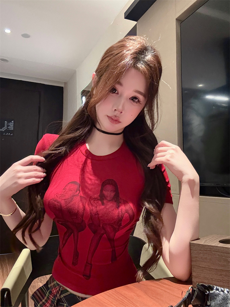 RY1992# 实价实拍~美式正肩T恤女夏季辣妹人像印花修身短袖收腰短款圆领衫