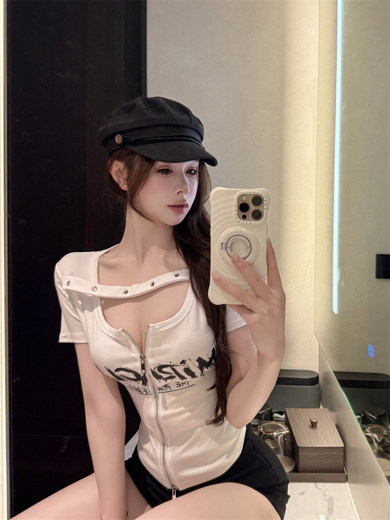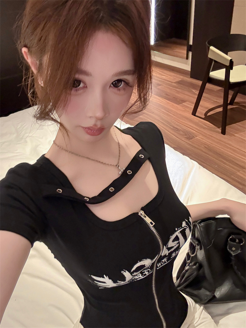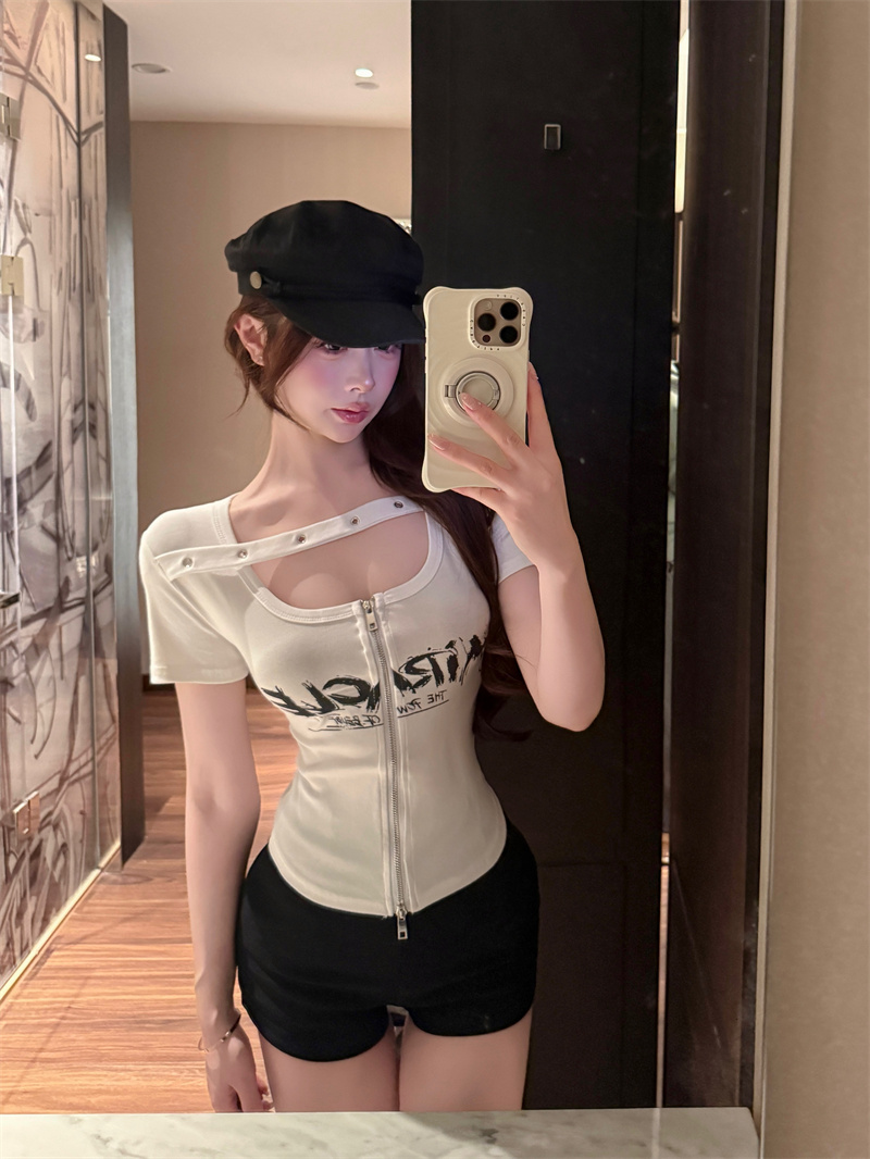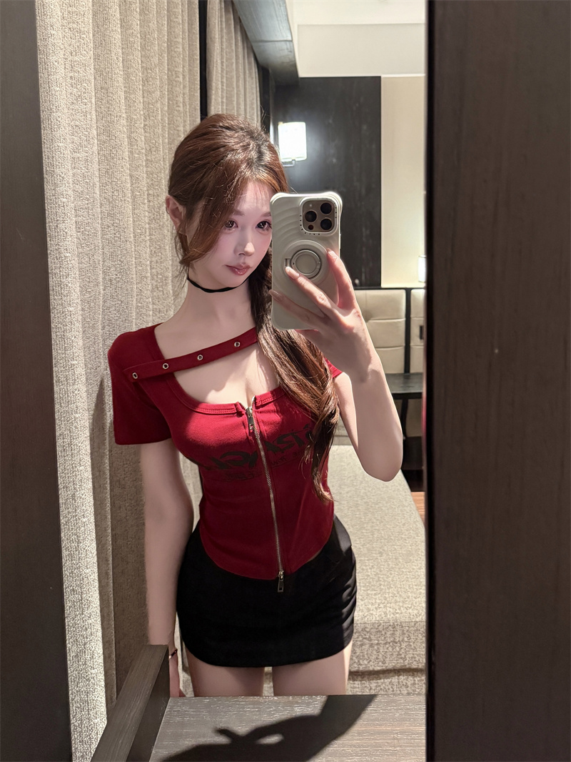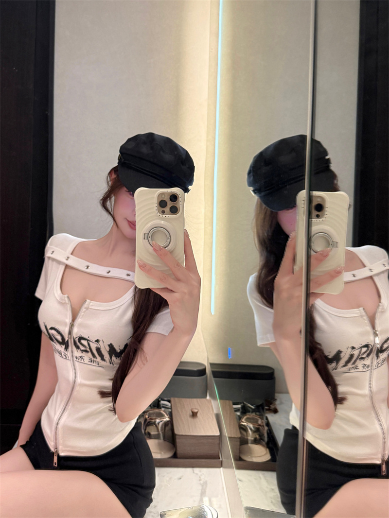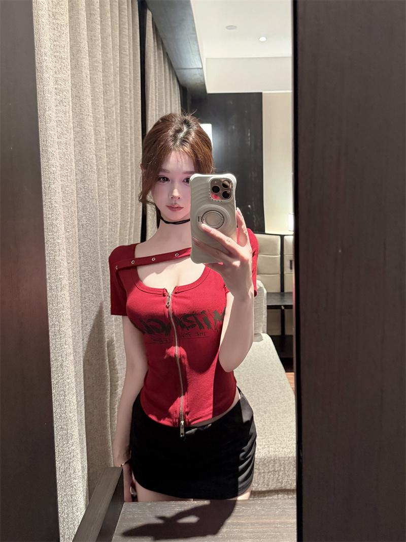 RY1995# 实价实拍~纯欲辣妹风短袖t恤女夏季亚比风斜肩带修身性感短款上衣