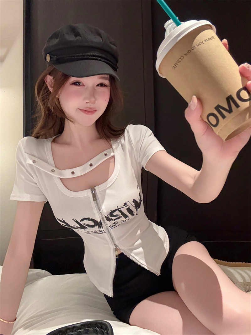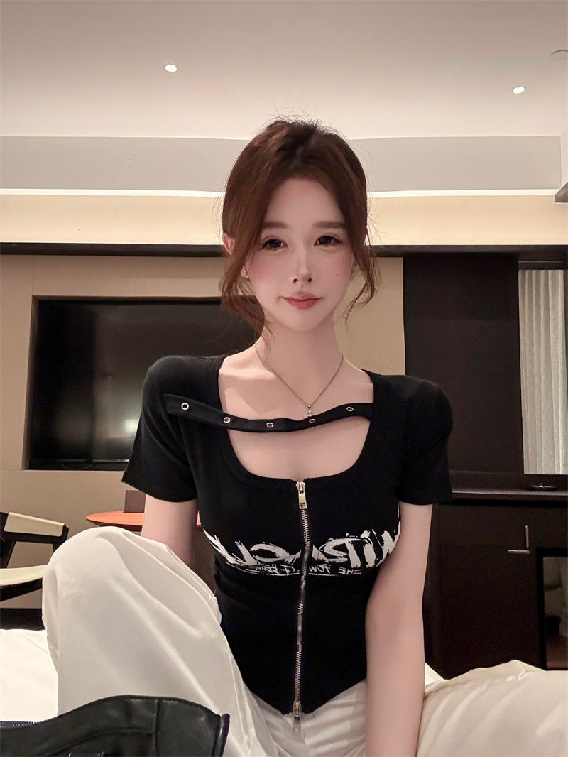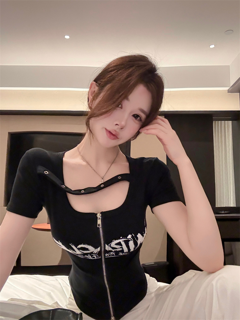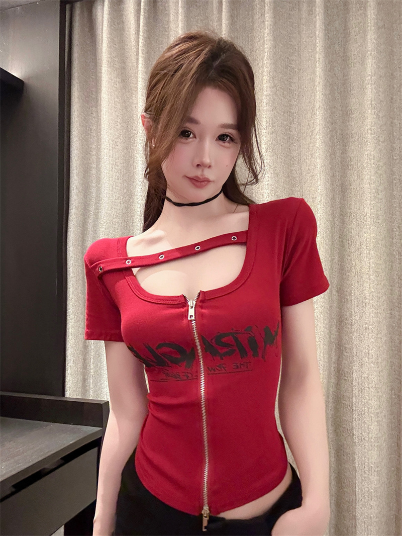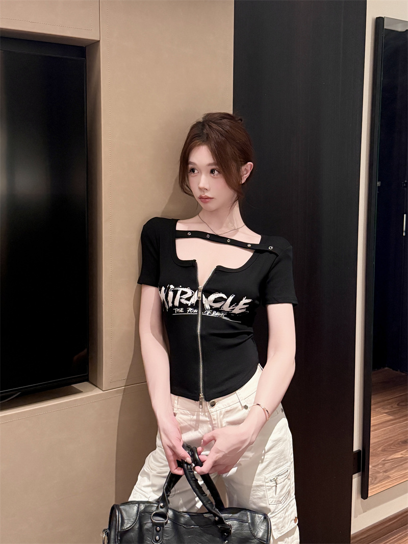 RY1995# 实价实拍~纯欲辣妹风短袖t恤女夏季亚比风斜肩带修身性感短款上衣