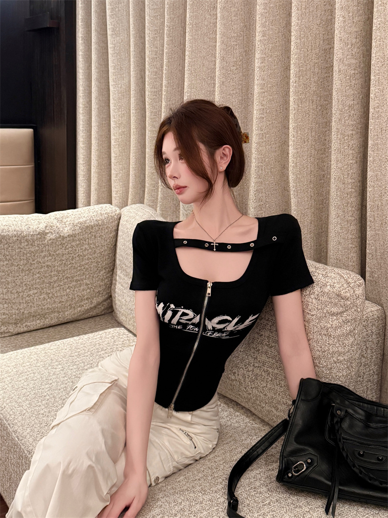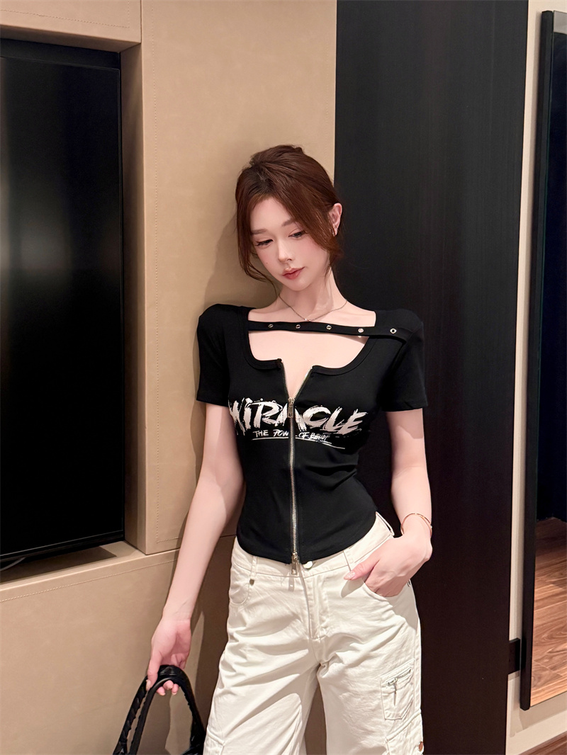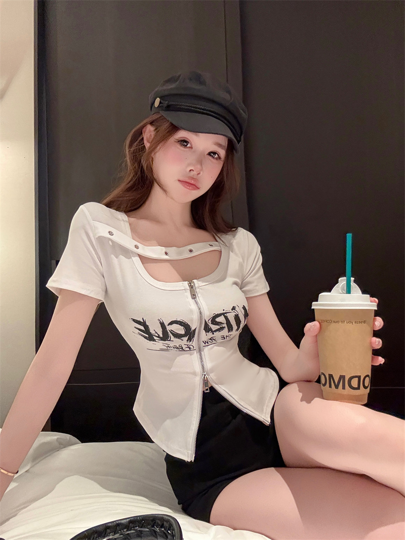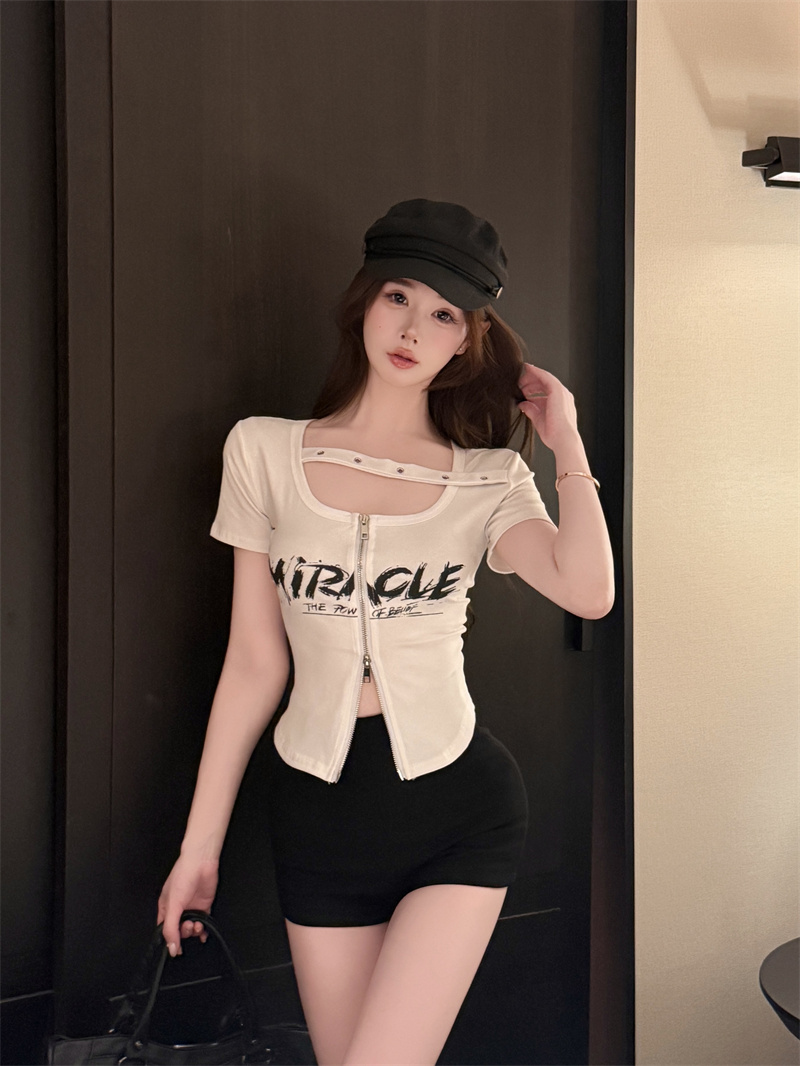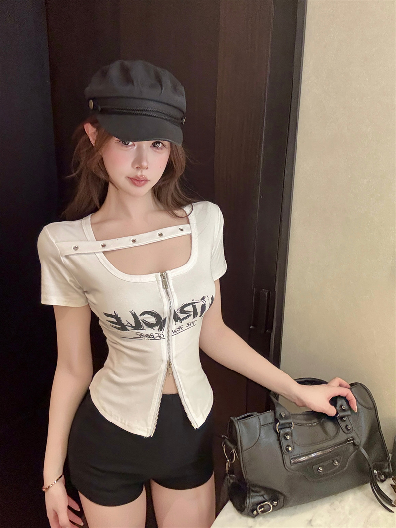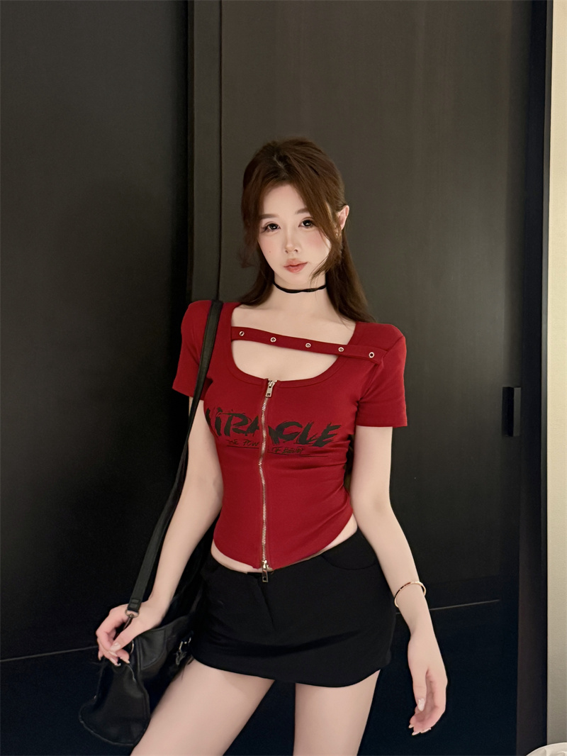 RY1995# 实价实拍~纯欲辣妹风短袖t恤女夏季亚比风斜肩带修身性感短款上衣