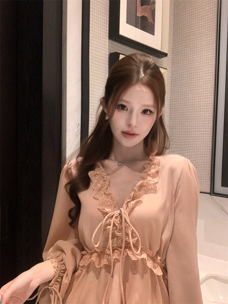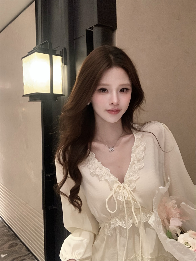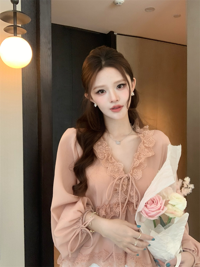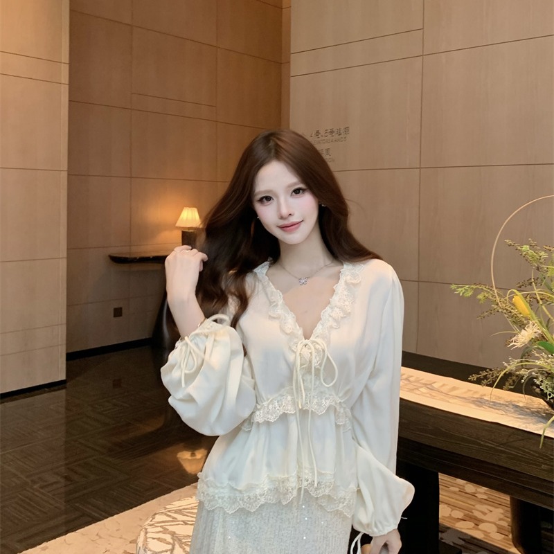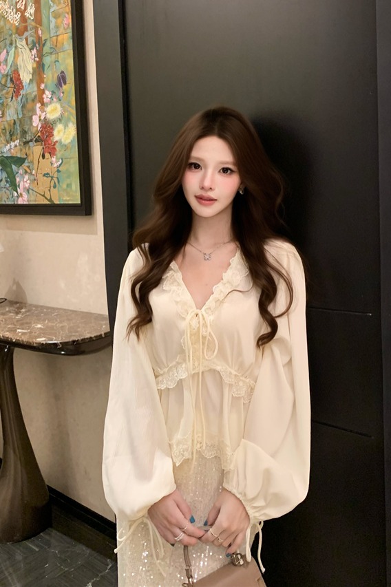 RY2003# 实价实拍~莱赛尔混纺肌理感灯笼袖上衣女轻薄透气防晒蕾丝小衫女