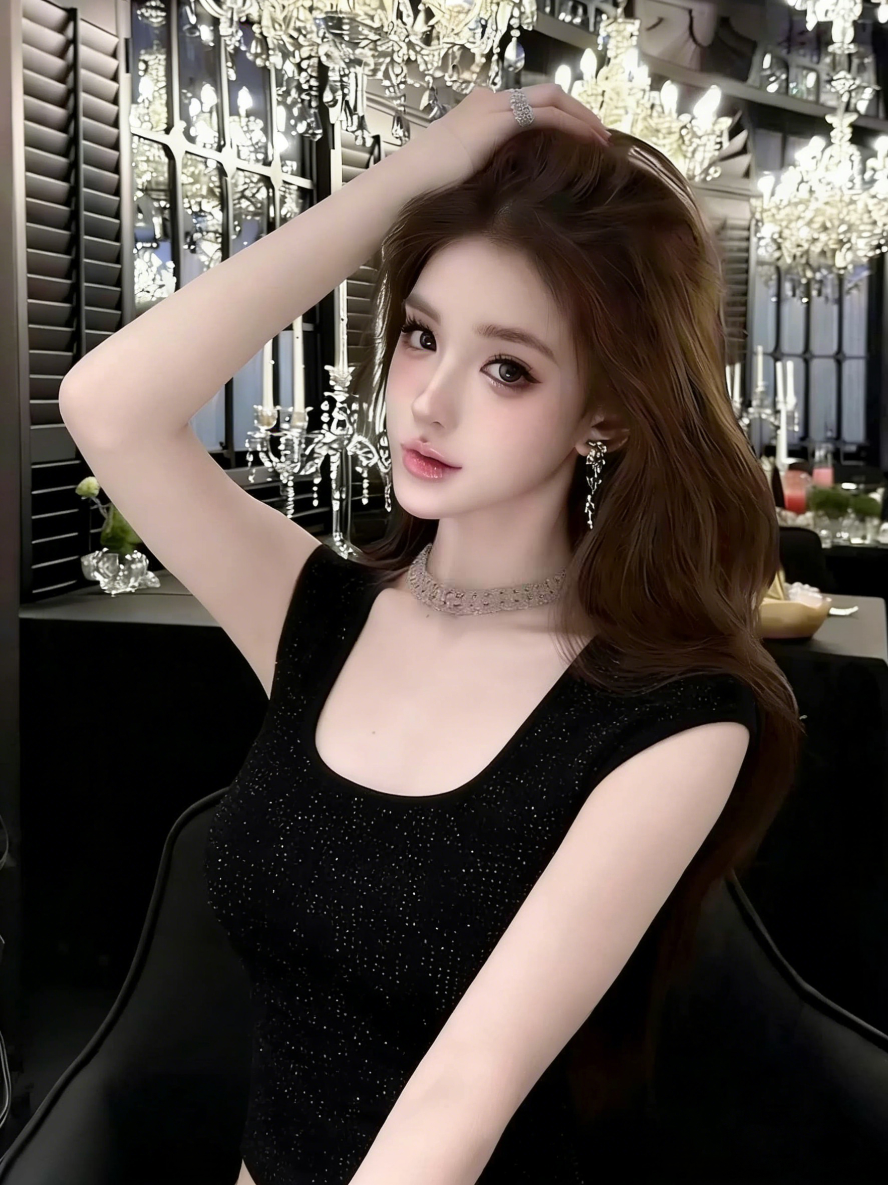 RY2007# 2026春夏季时装 U 领气质烫钻短袖T恤弹力打底衫