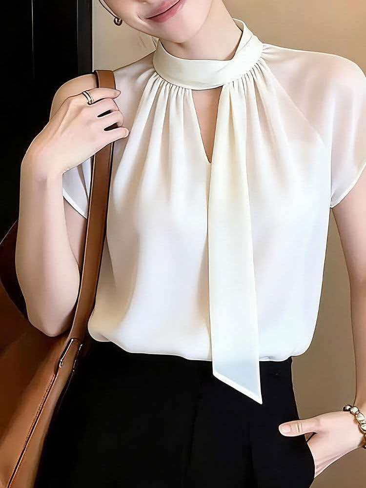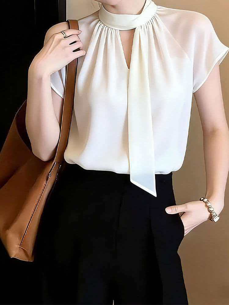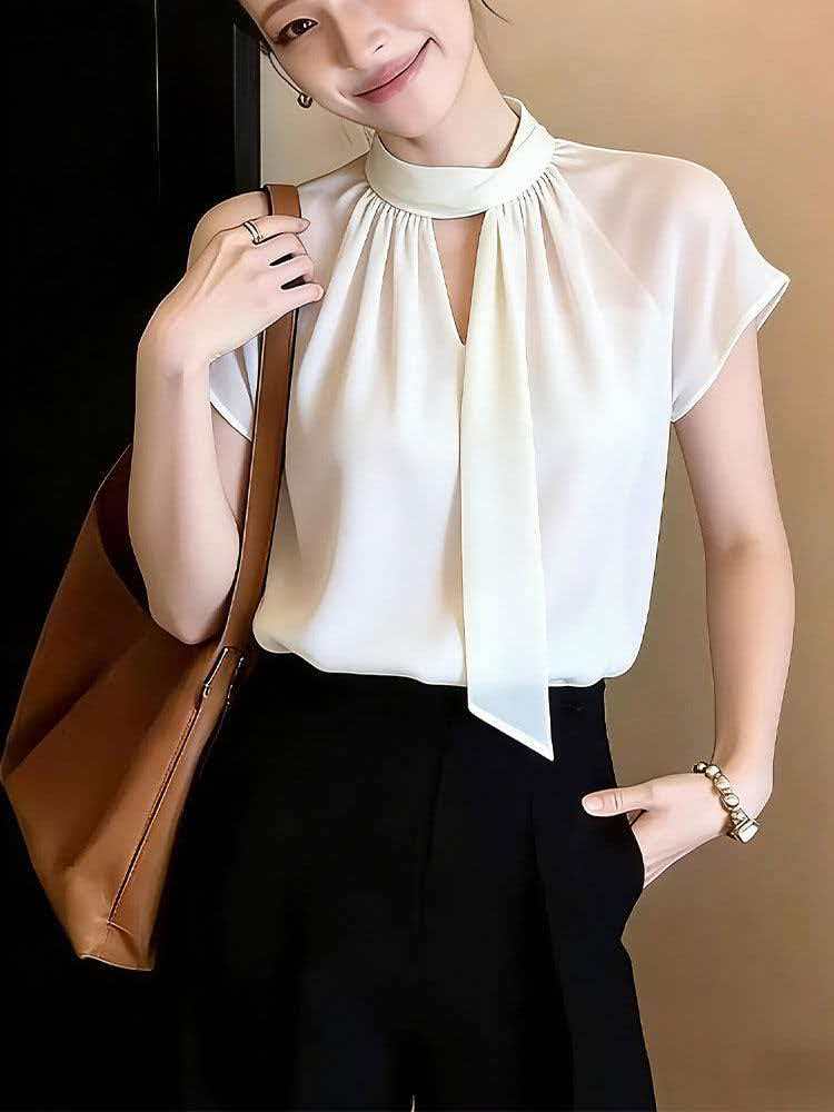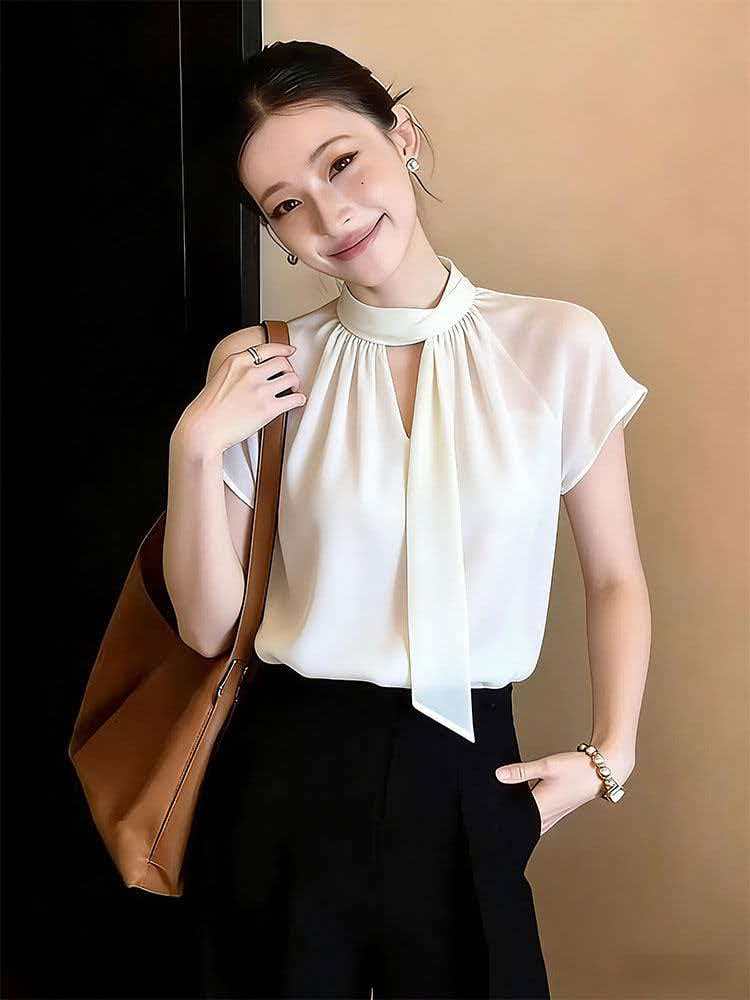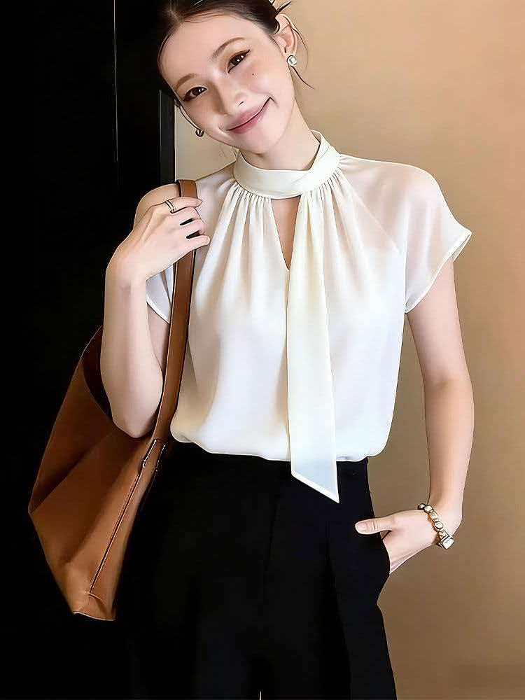 RY2010# 轻熟优雅风白色飘带衬衫女夏季2026新款短袖通勤百搭显瘦气质上衣