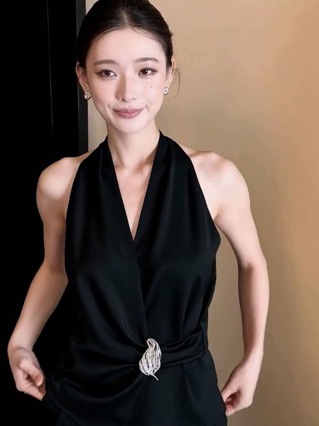 RY2014# 法式黑色v领挂脖露肩背心女2026夏季新款气质收腰不对称无袖上衣