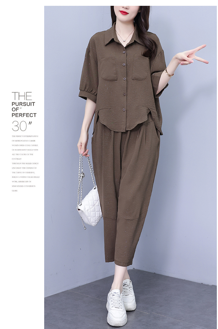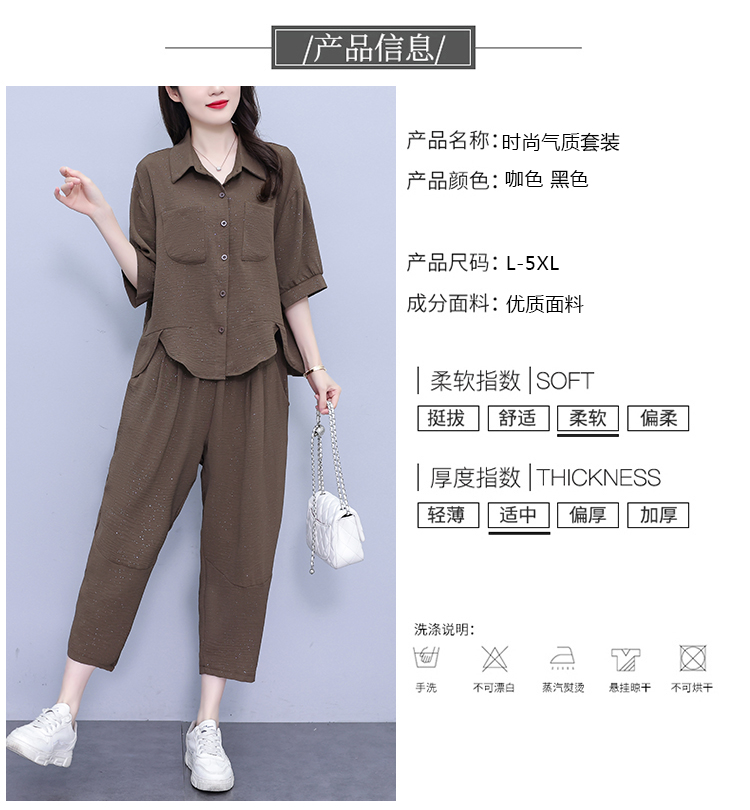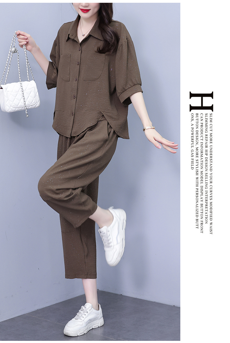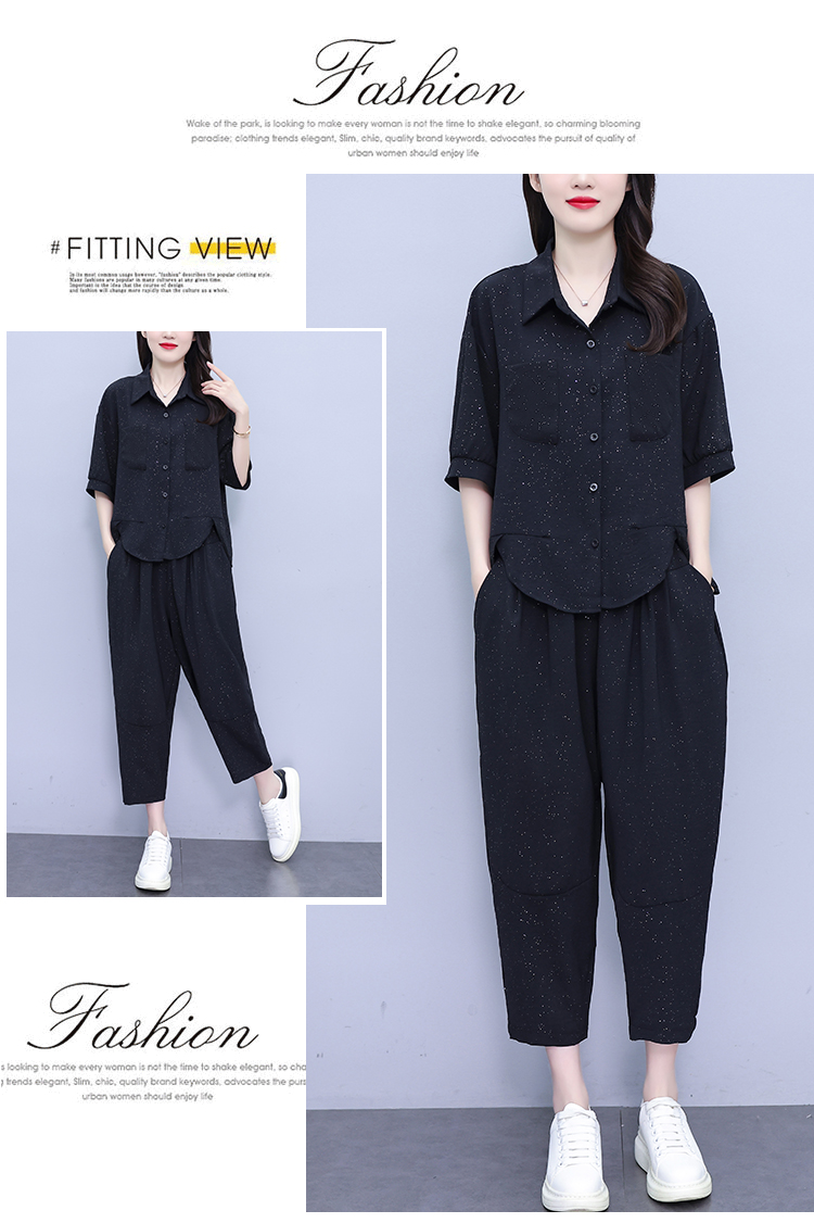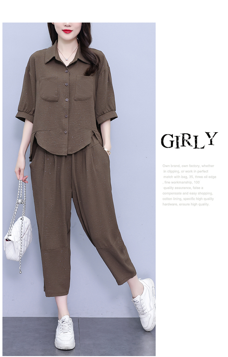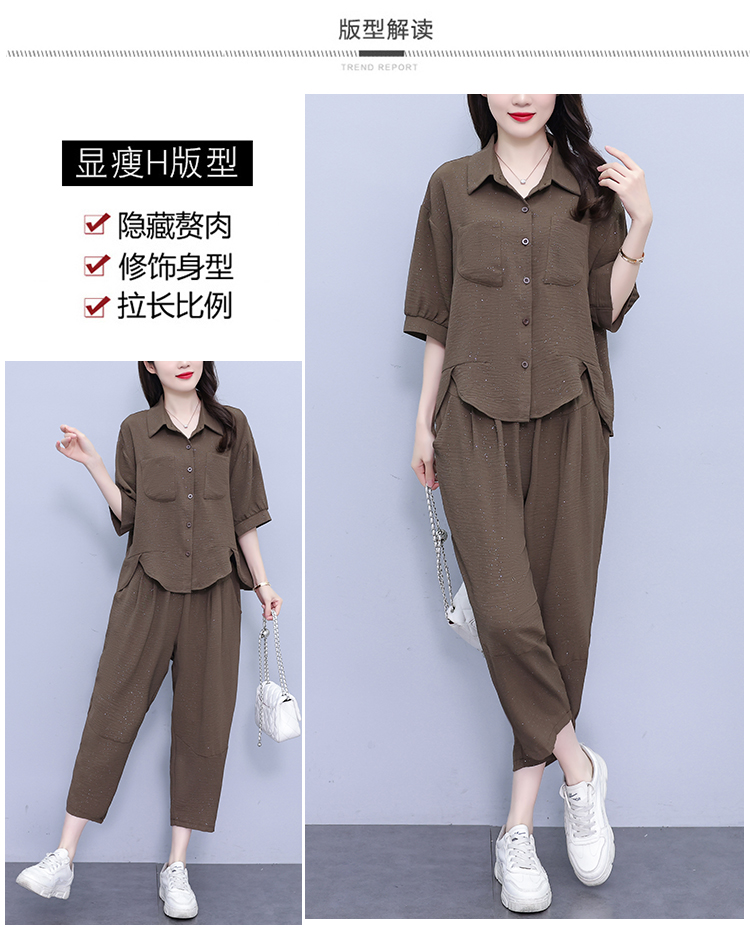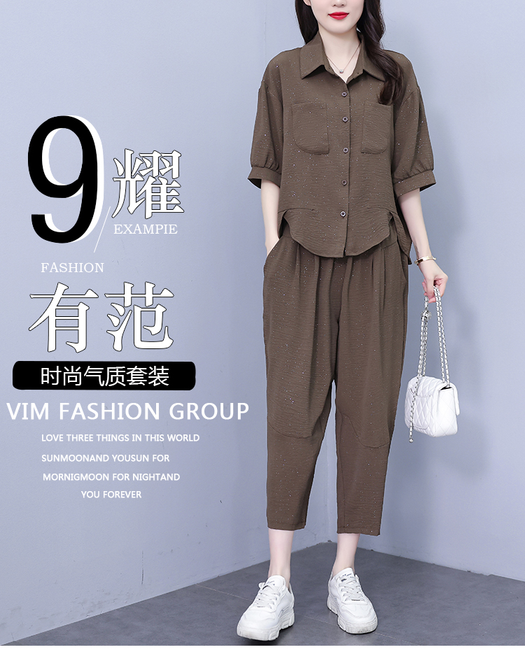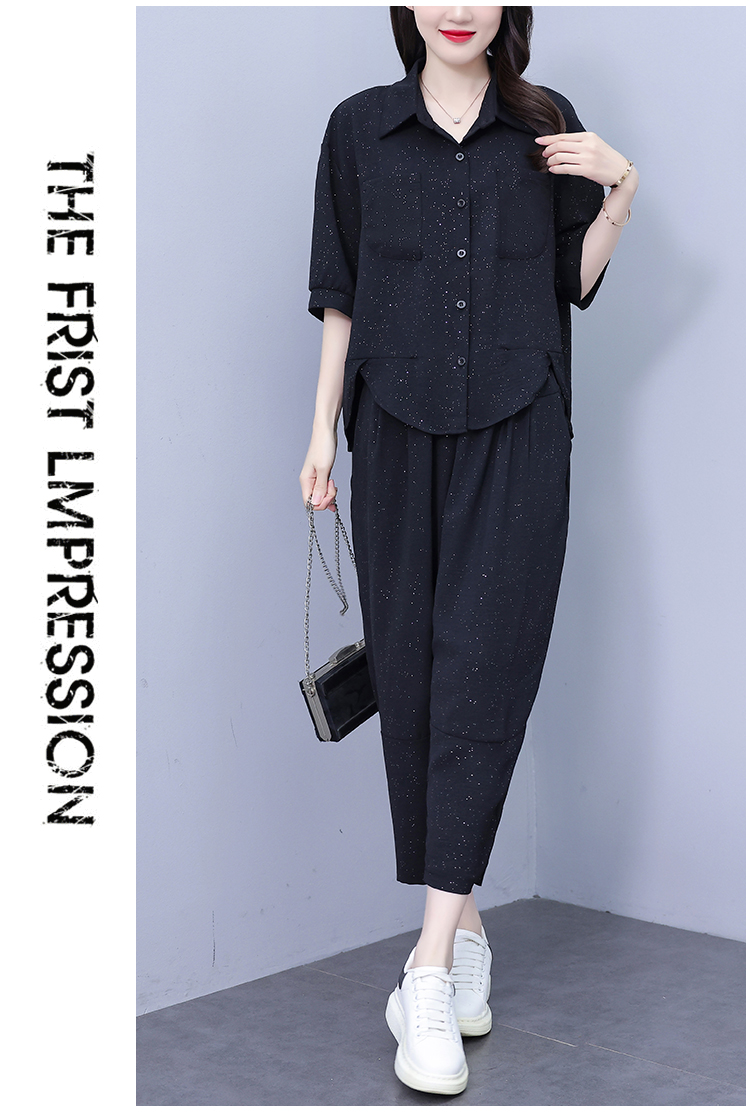 RY2021# 实拍2026年夏季新款洋气套装胖MM时尚细闪衬衫宽松显瘦减龄两件套