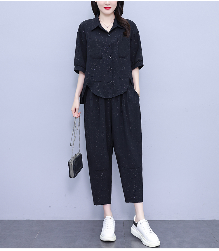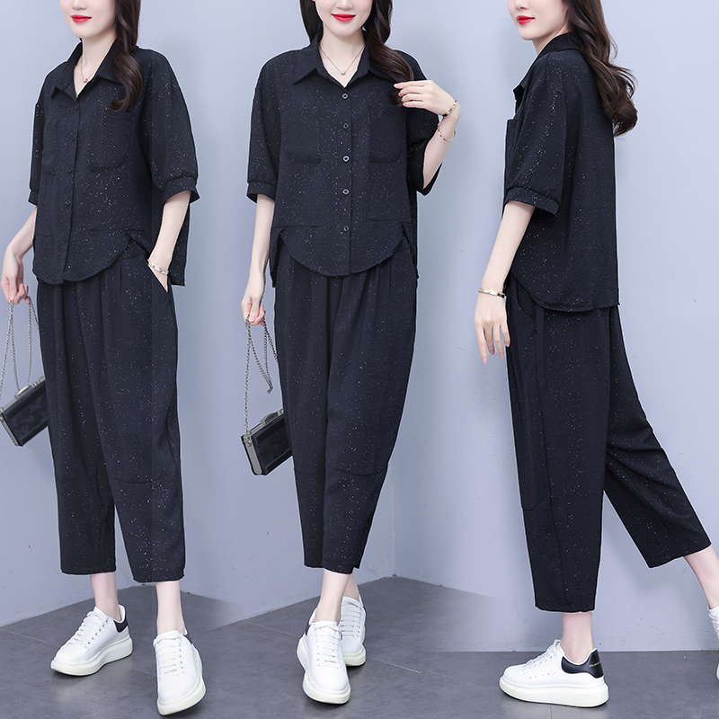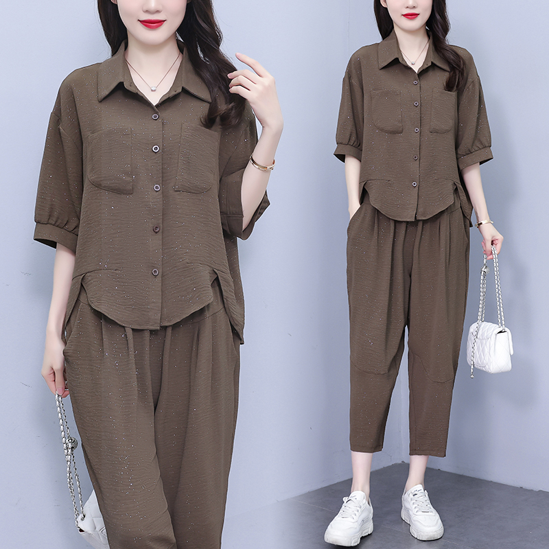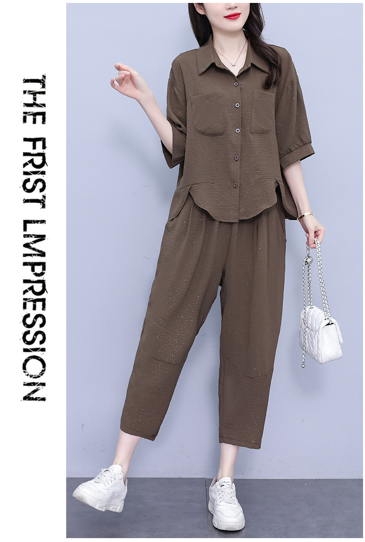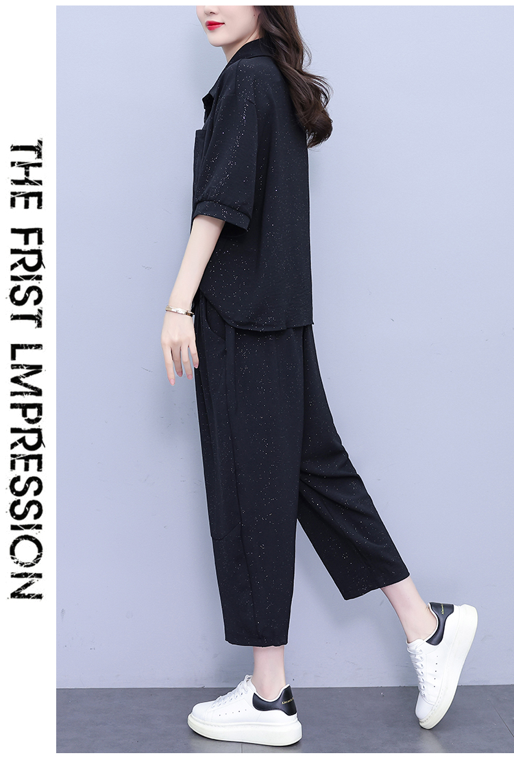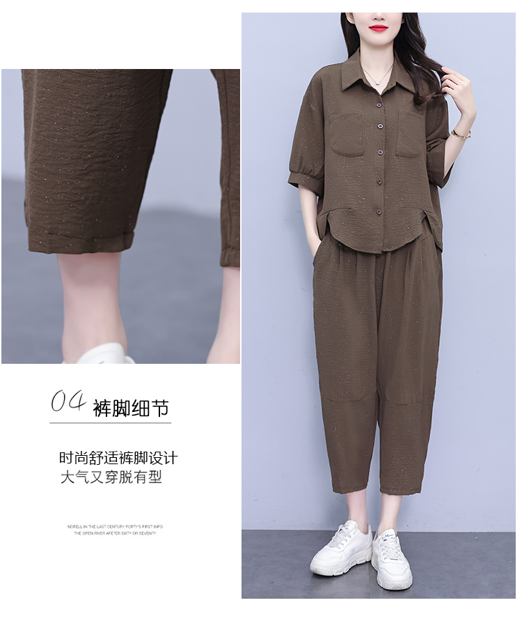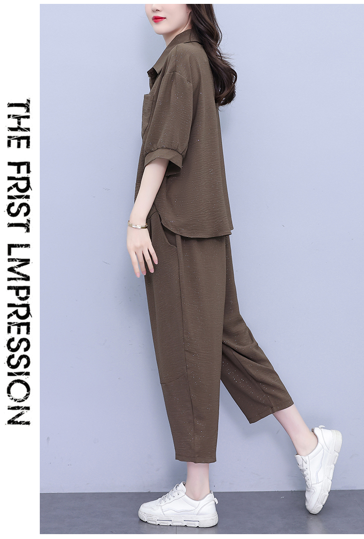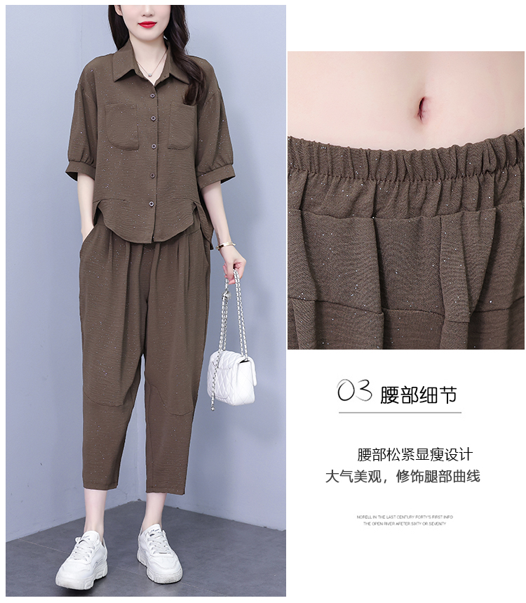 RY2021# 实拍2026年夏季新款洋气套装胖MM时尚细闪衬衫宽松显瘦减龄两件套