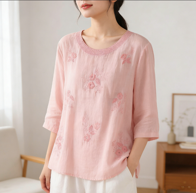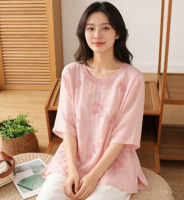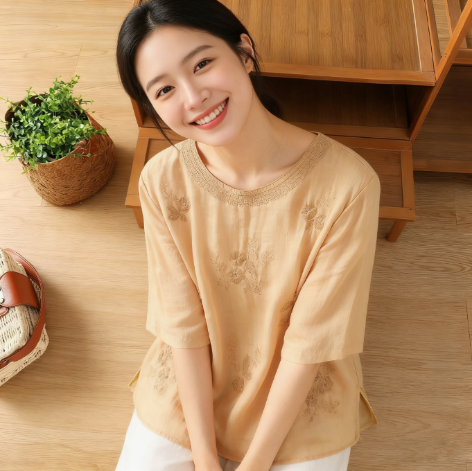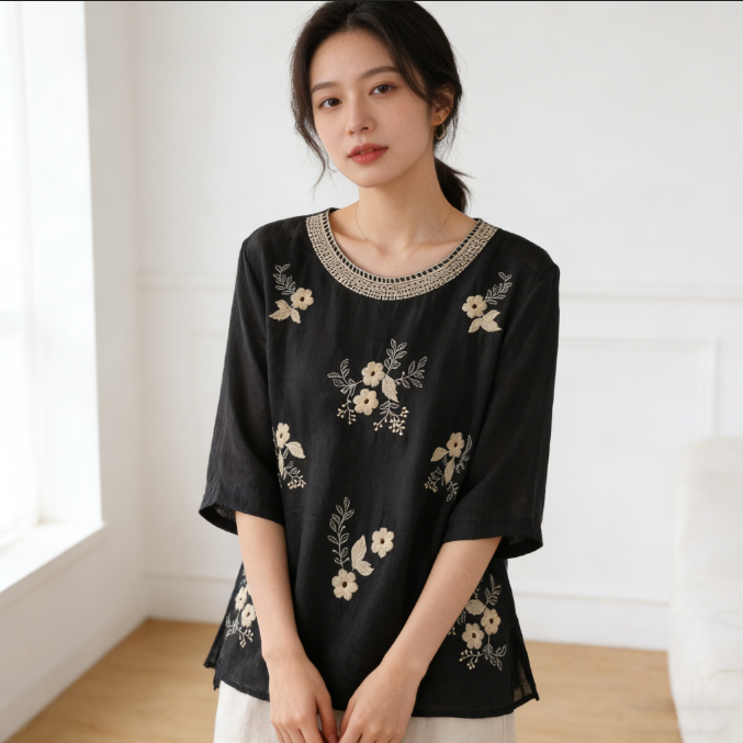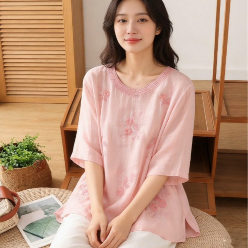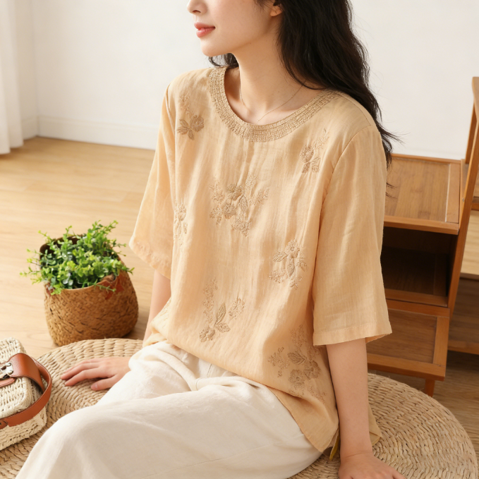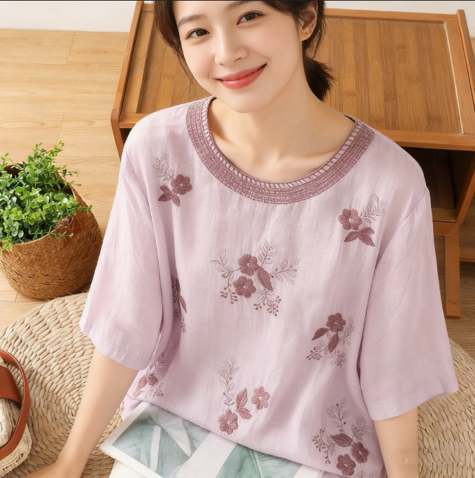 RY2040# 实拍复古刺绣花棉麻中袖T女夏季薄款宽松百搭休闲圆领小衫上衣女