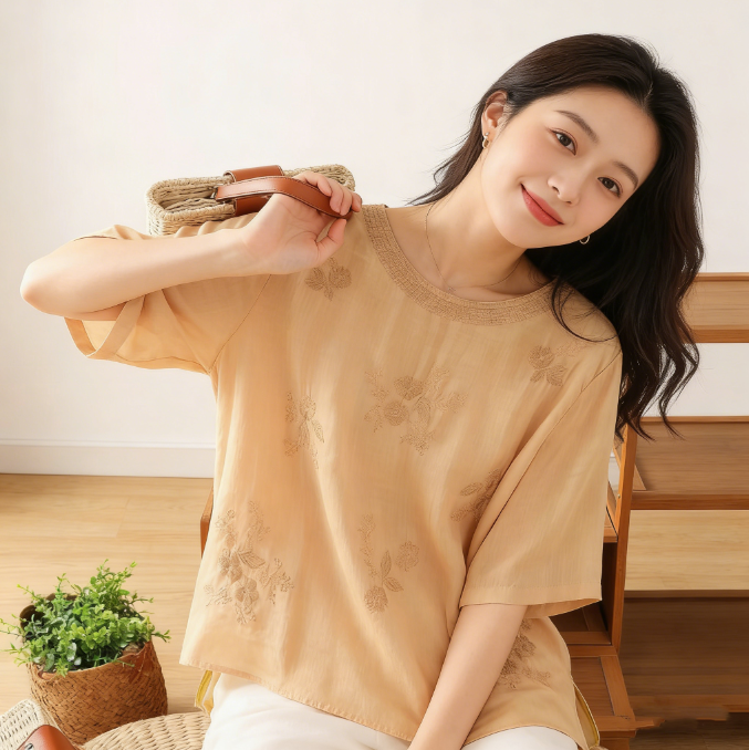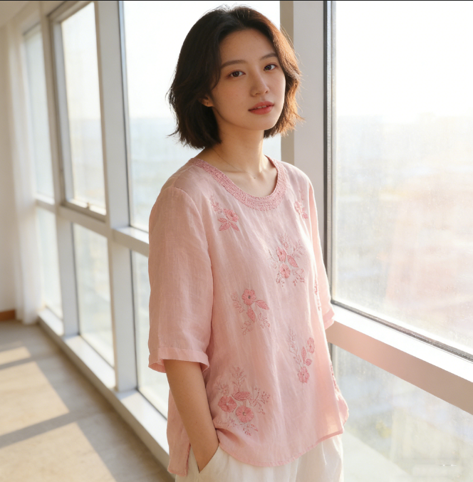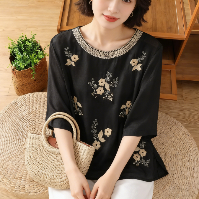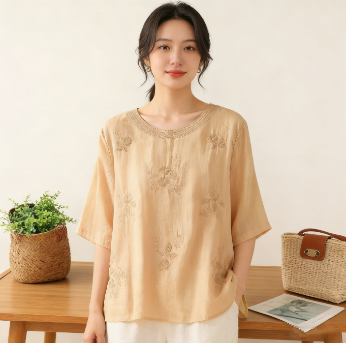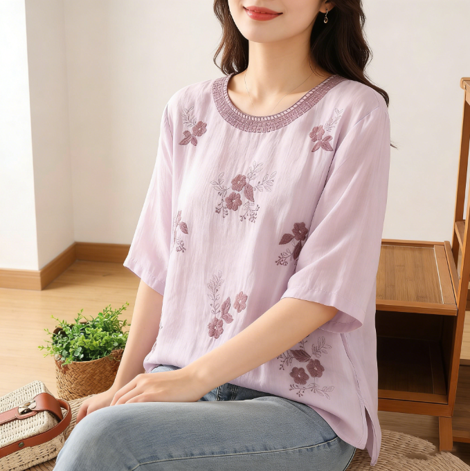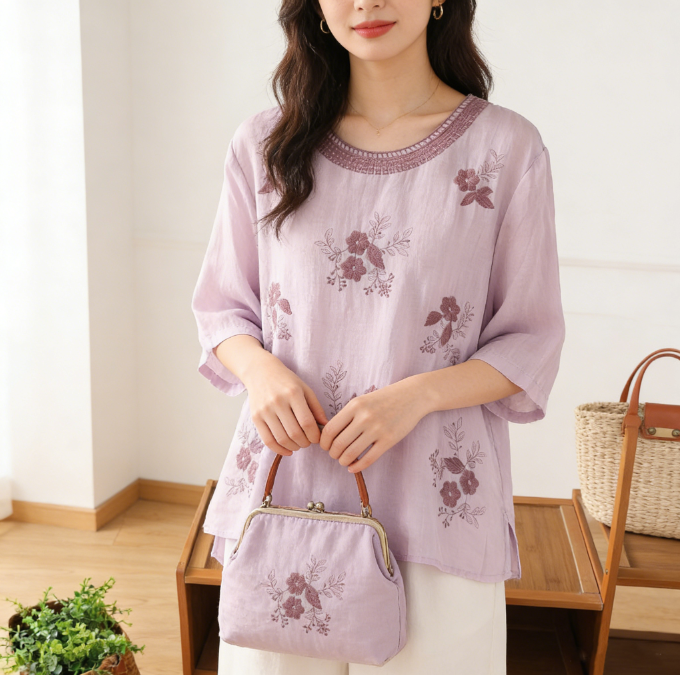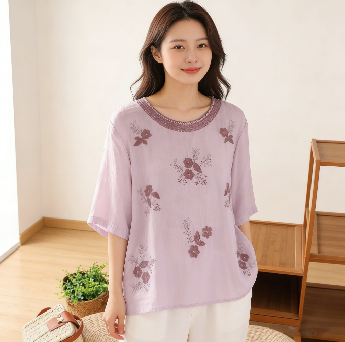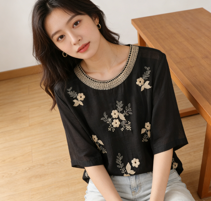 RY2040# 实拍复古刺绣花棉麻中袖T女夏季薄款宽松百搭休闲圆领小衫上衣女