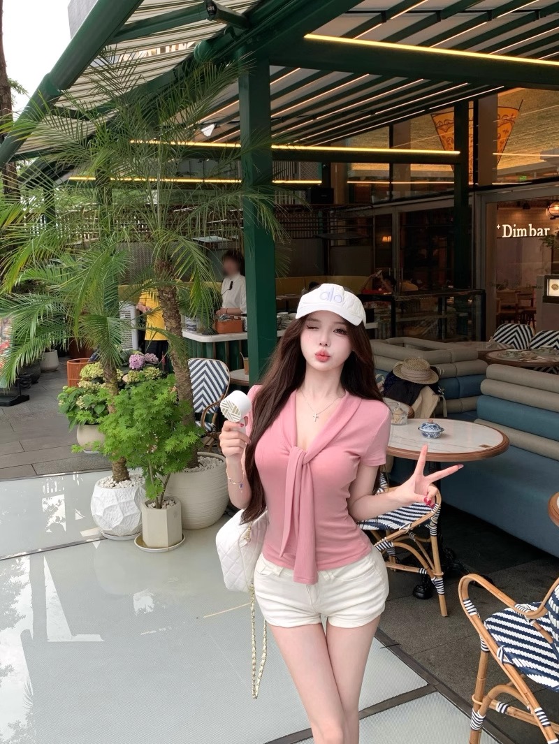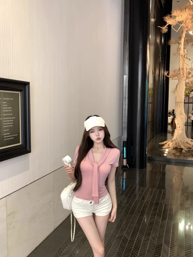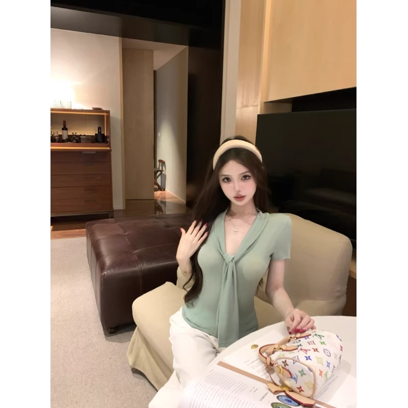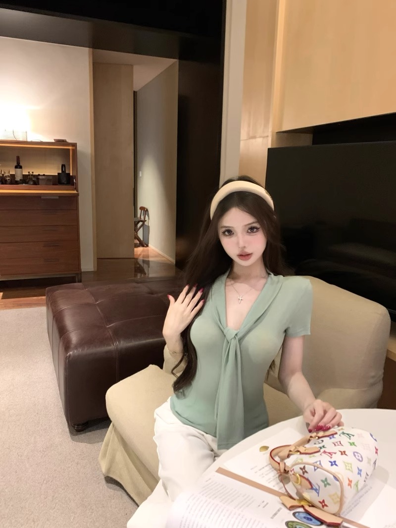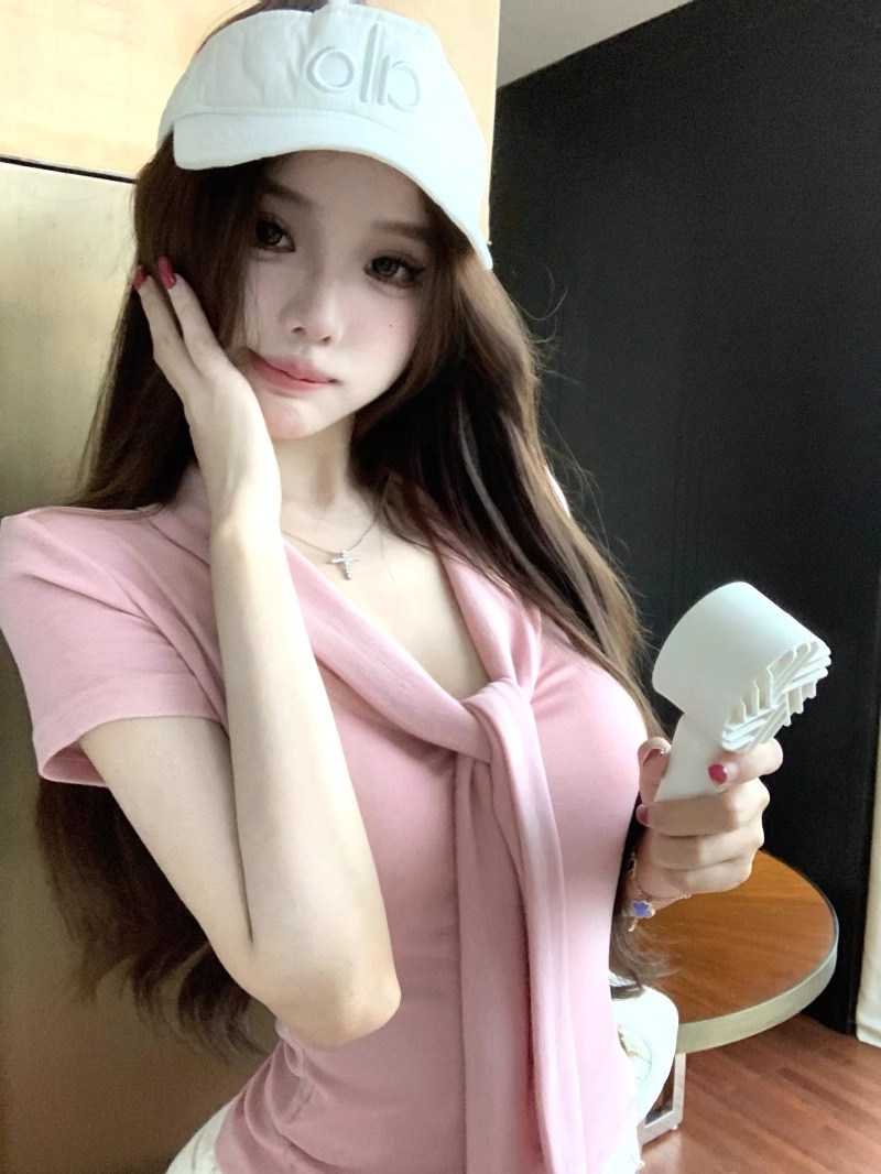 RY2044# 纯欲风系带短袖T恤女装夏季修身显瘦上衣