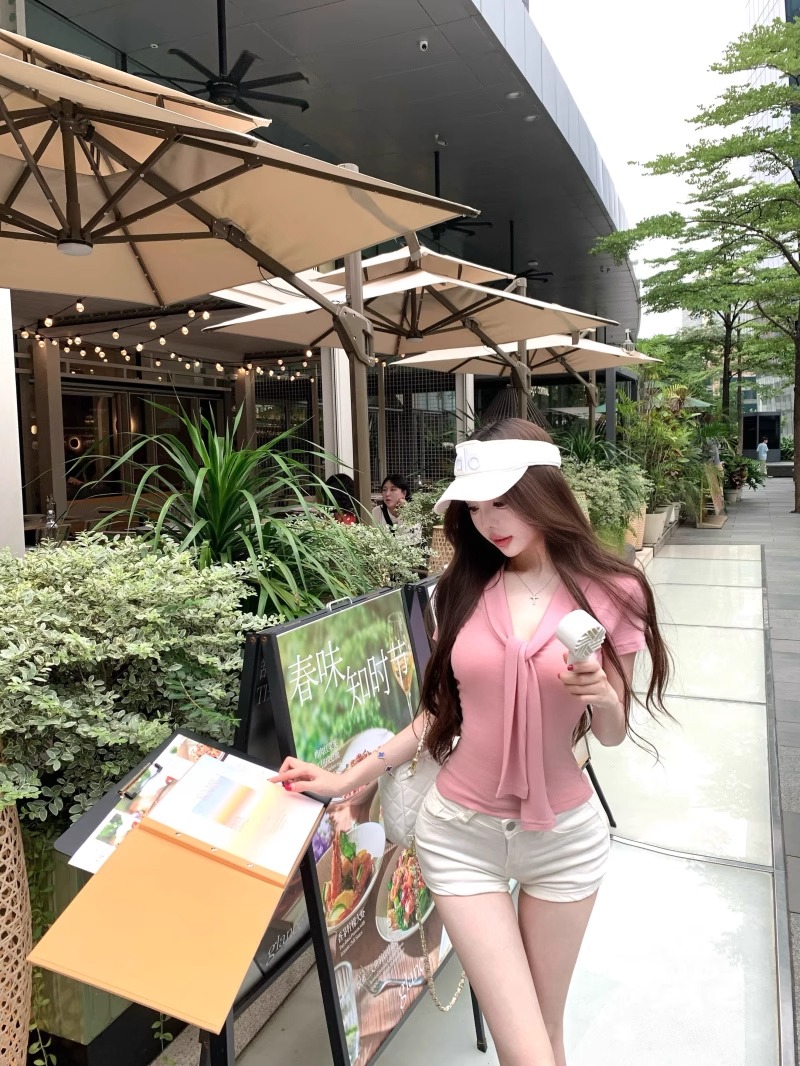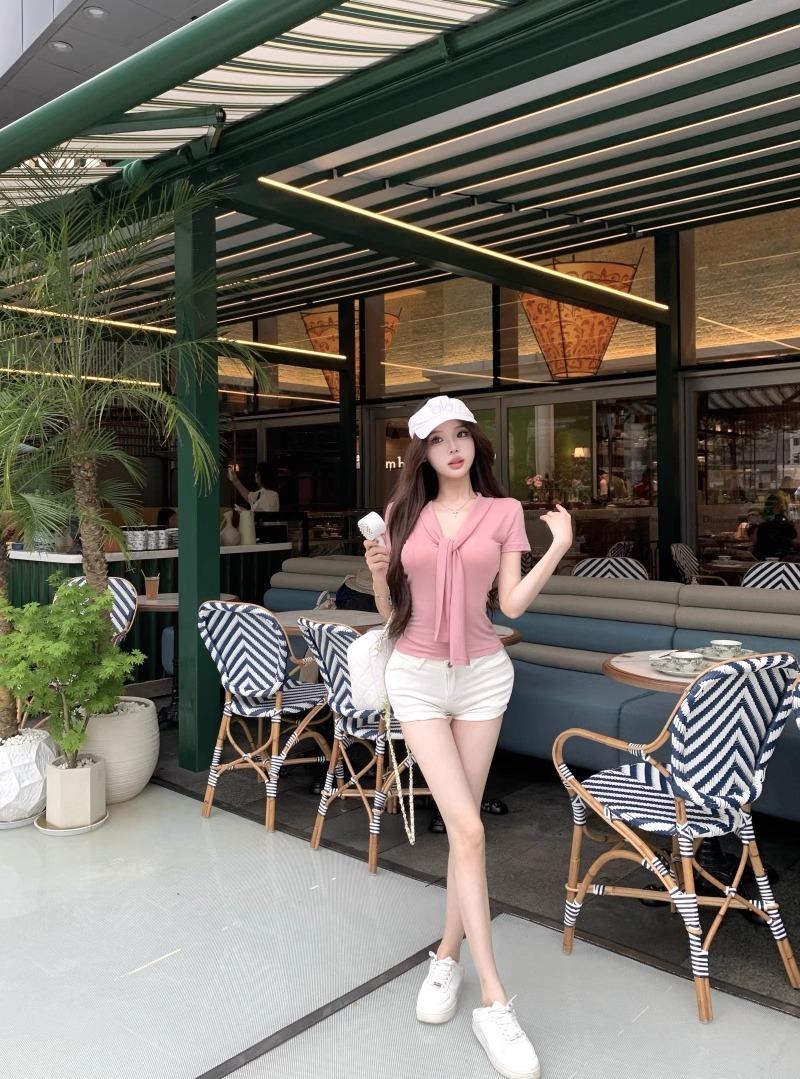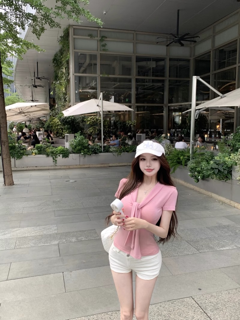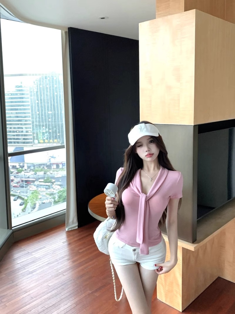 RY2044# 纯欲风系带短袖T恤女装夏季修身显瘦上衣