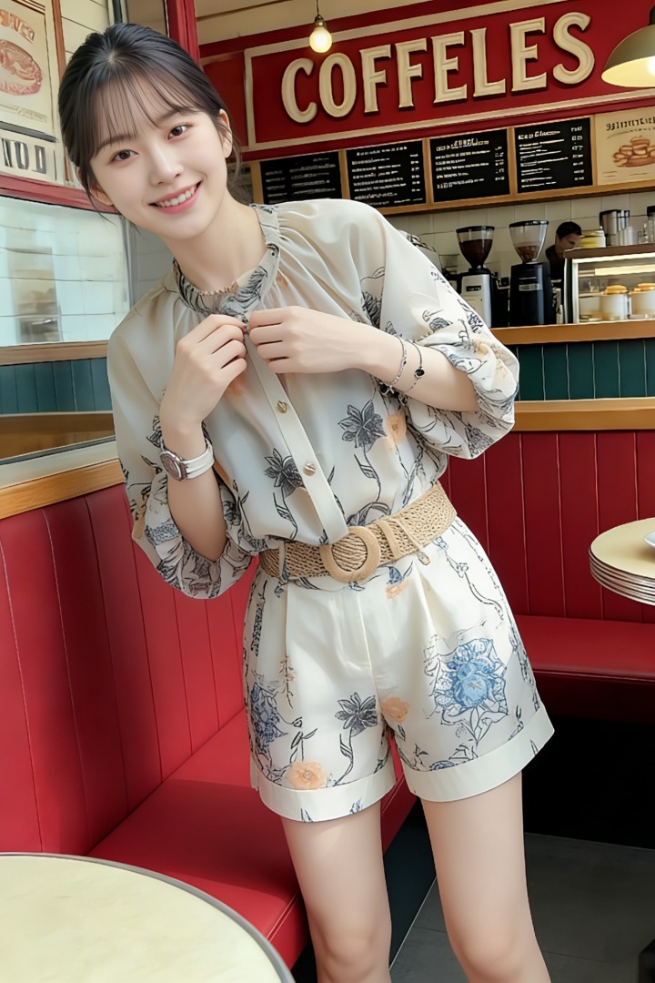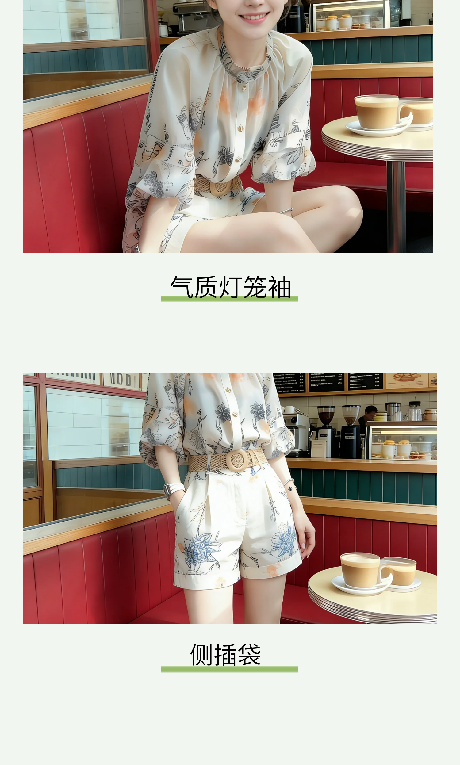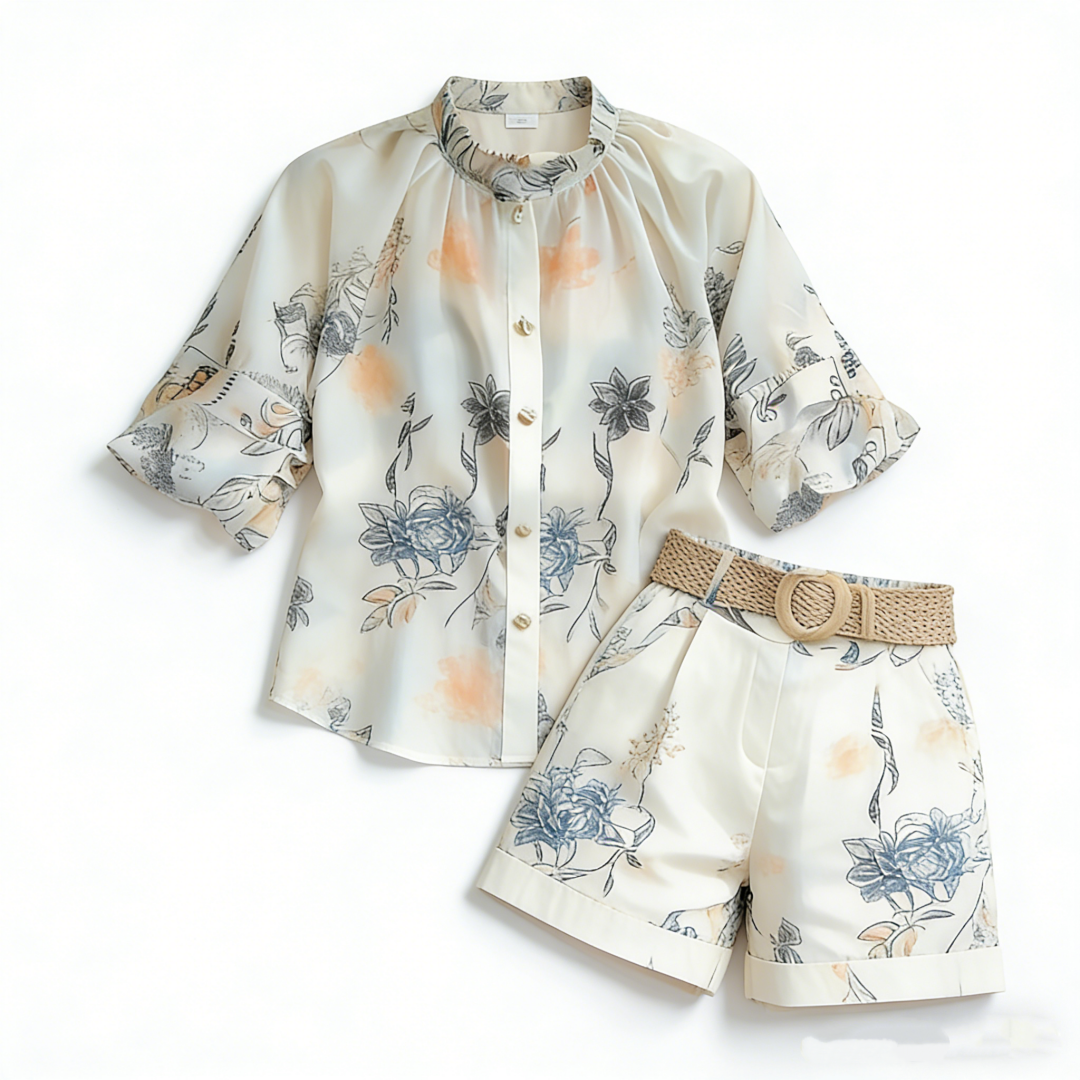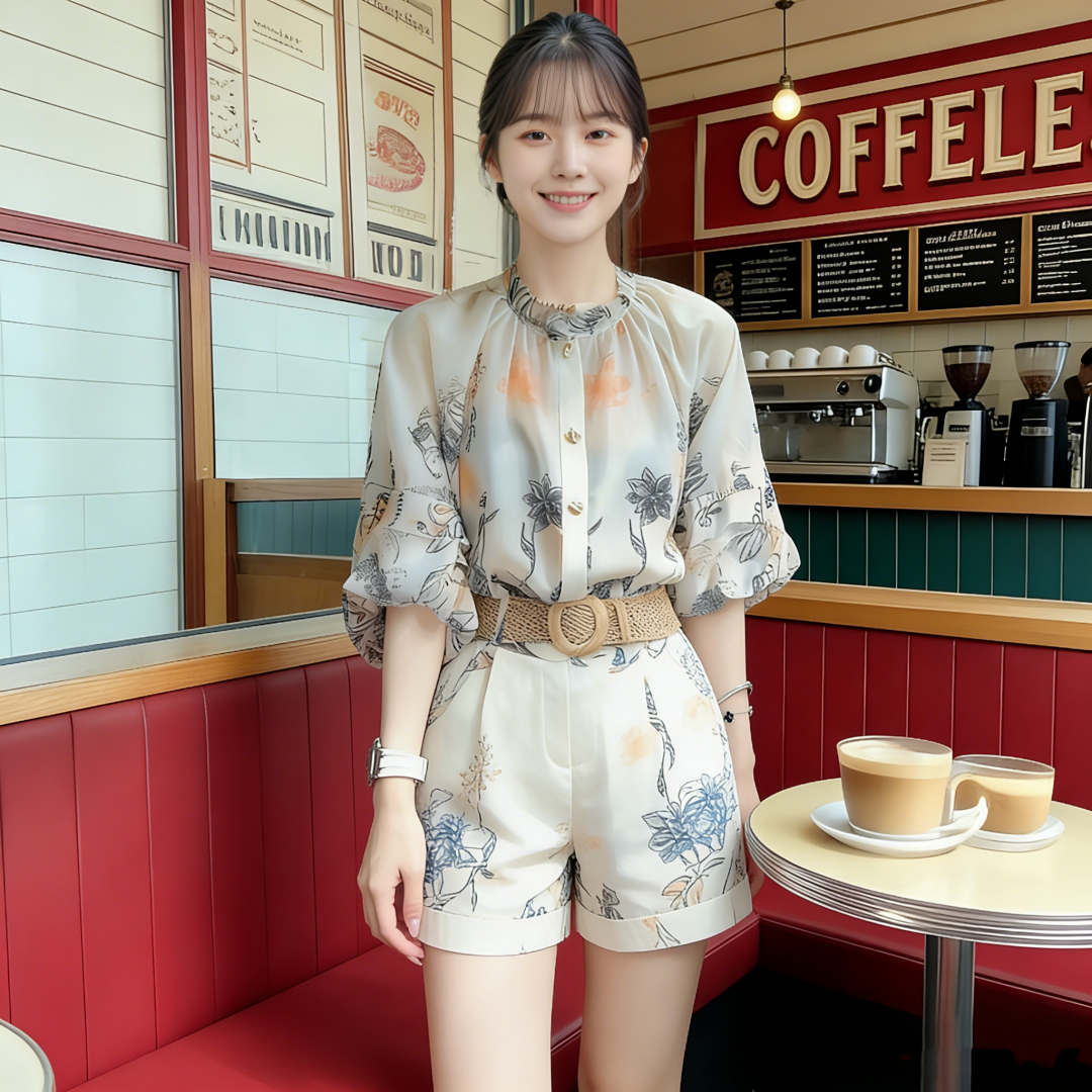 RY2050# 夏装搭配一整套轻奢高级感遮肉显瘦印花防晒雪纺衬衫短裤两件套装