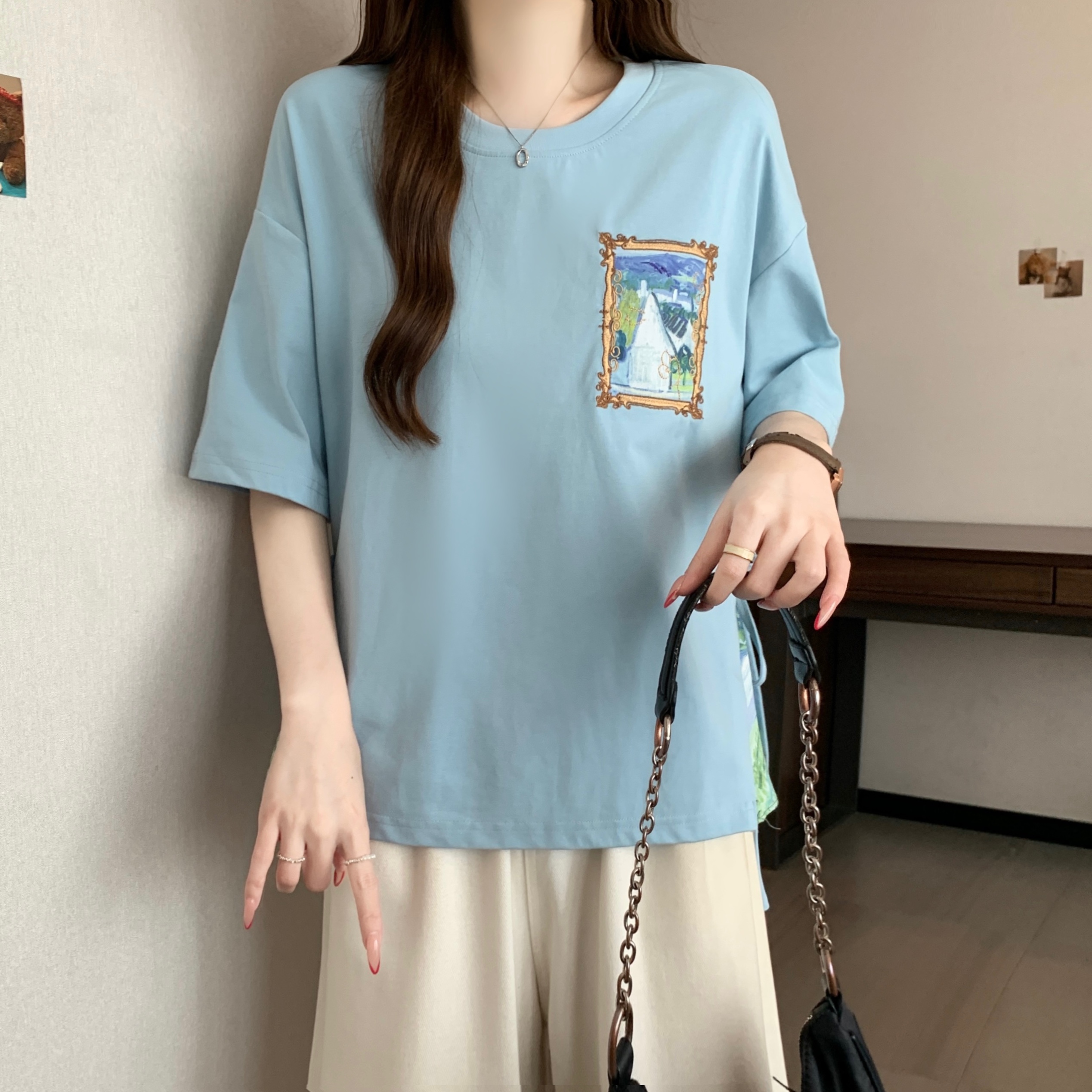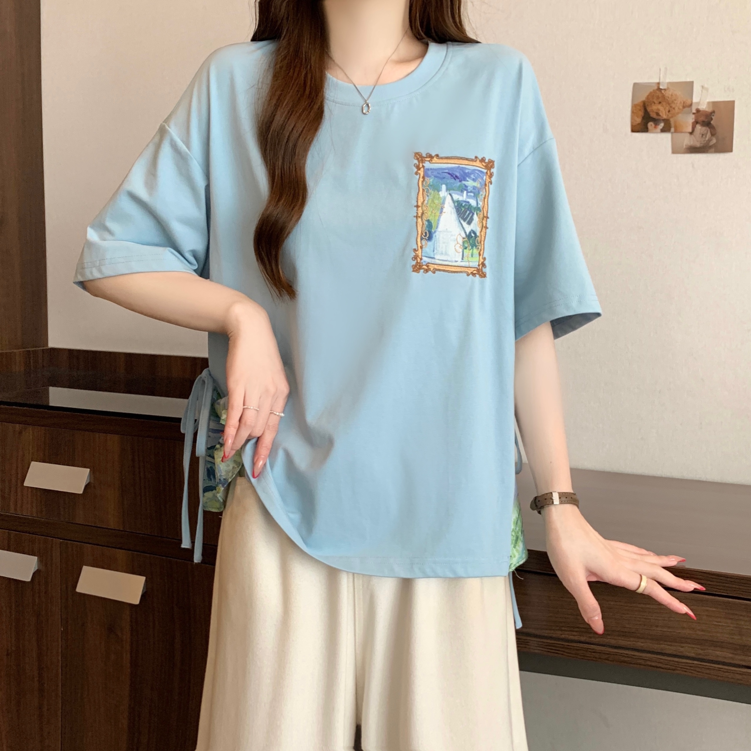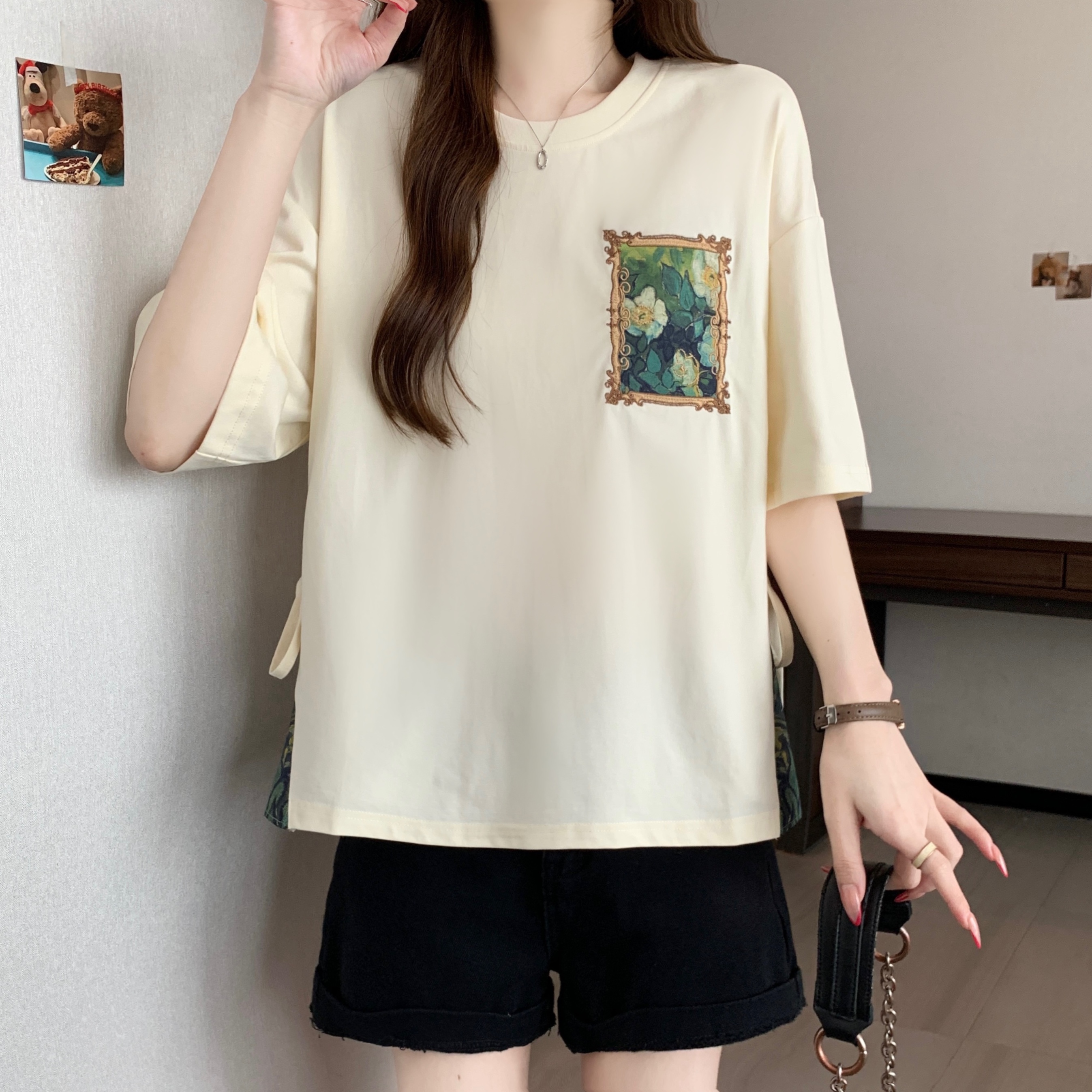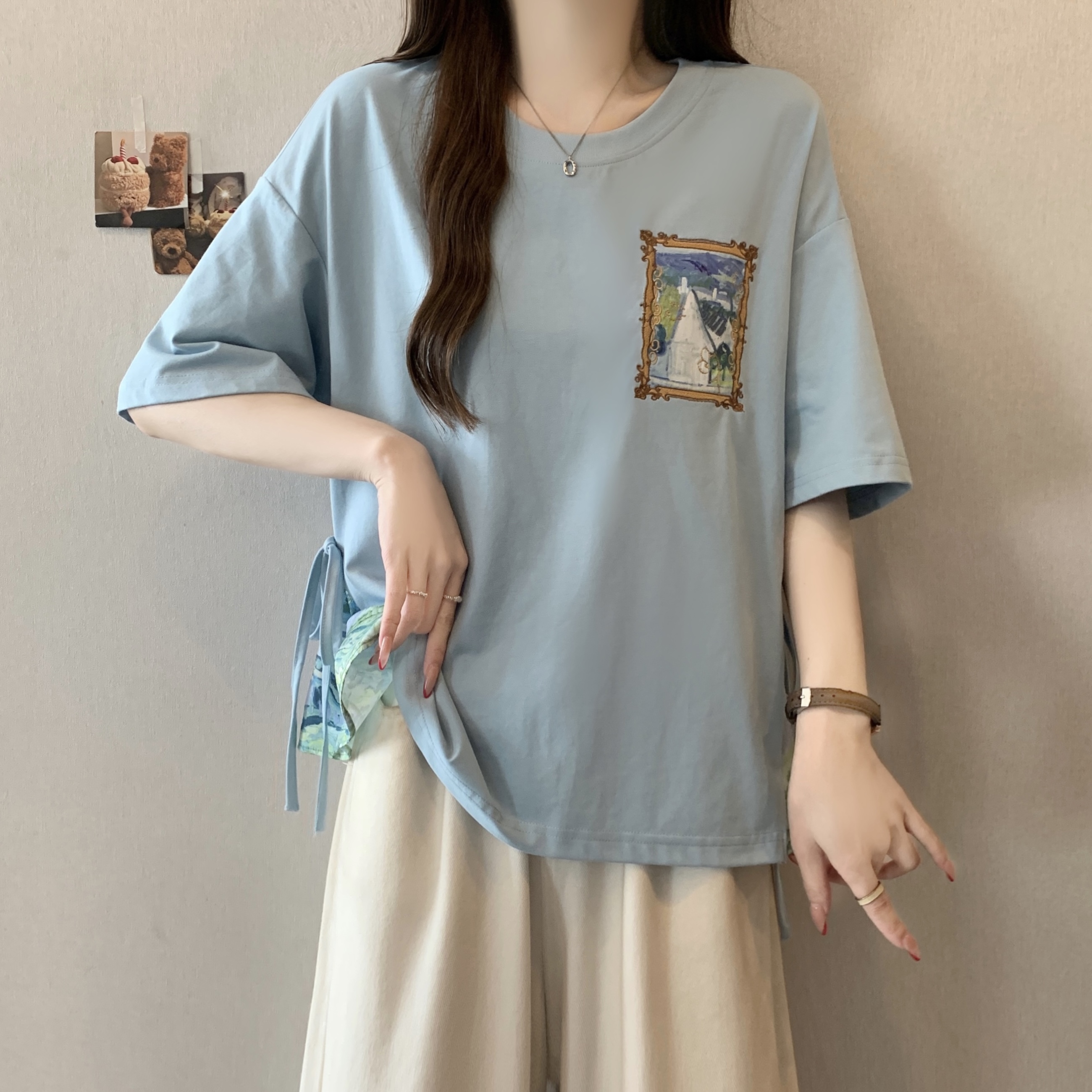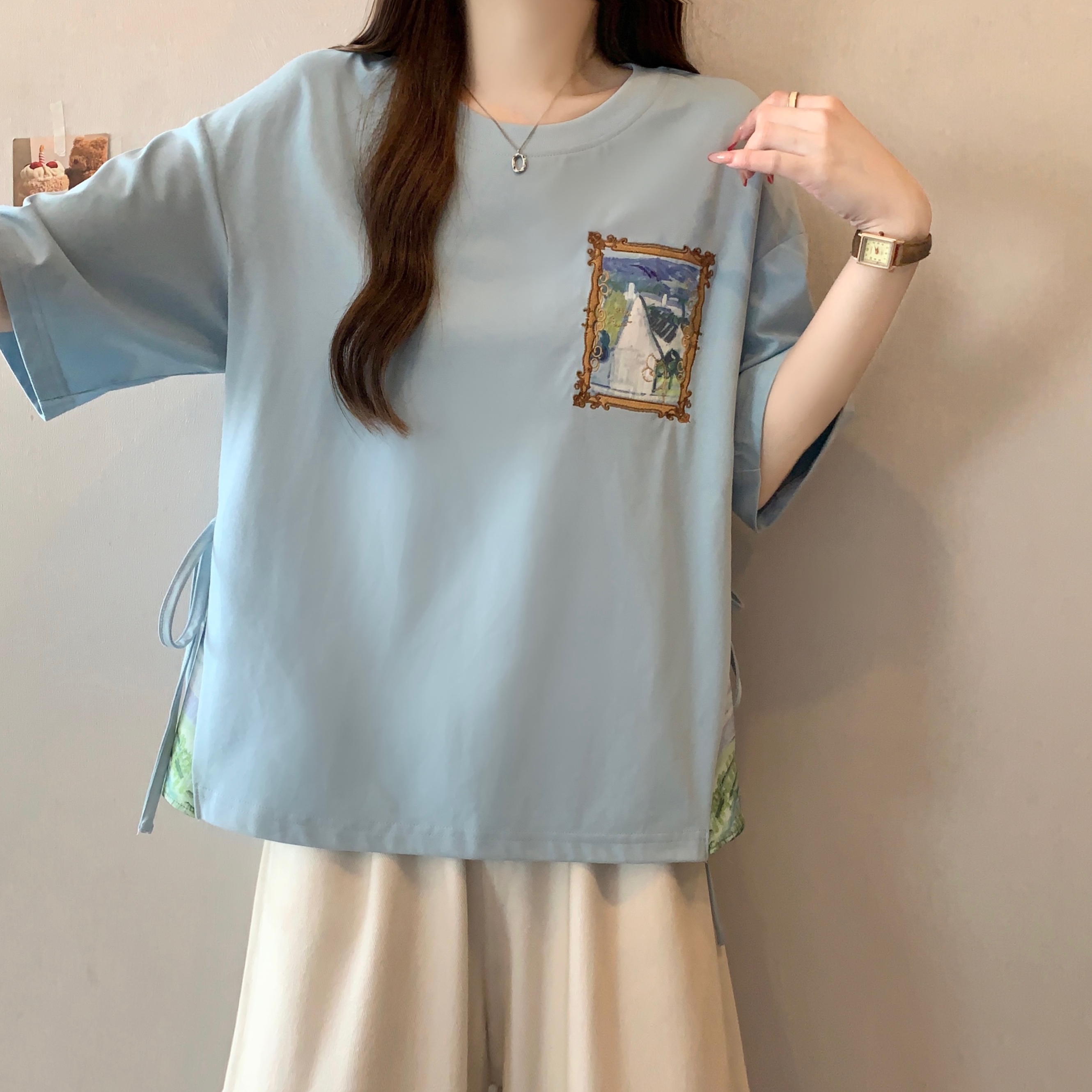 RY2094# 胖MM2026夏季新款假两件圆领短袖宽松设计感t恤女上衣
