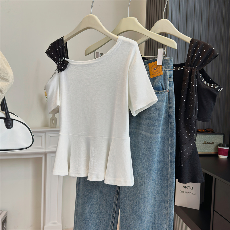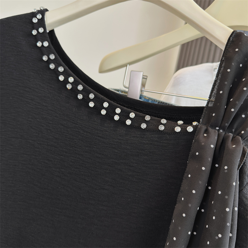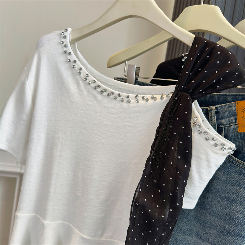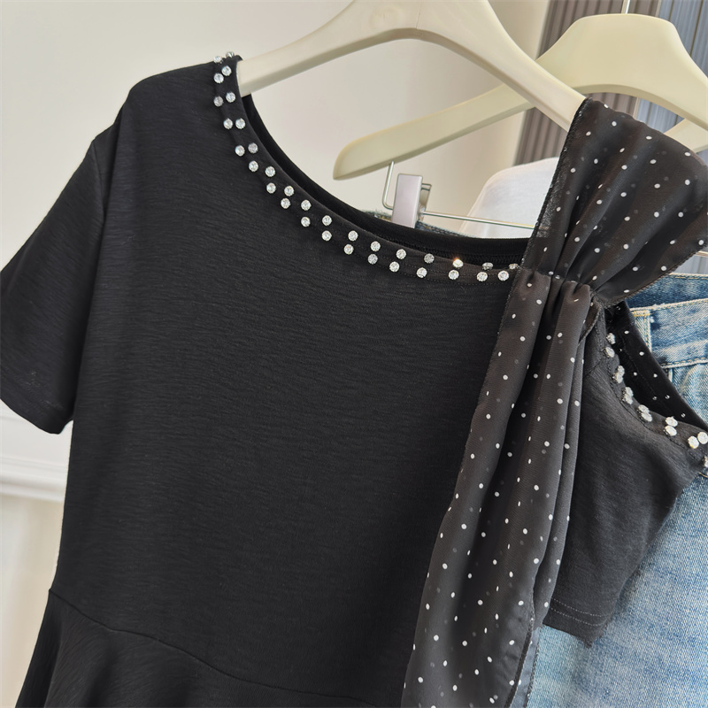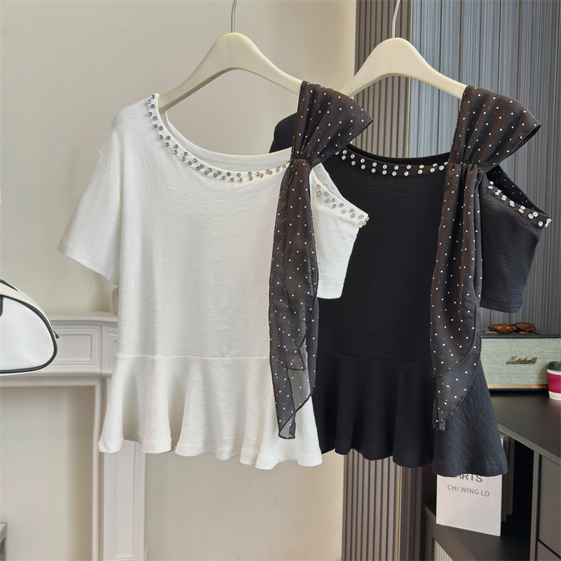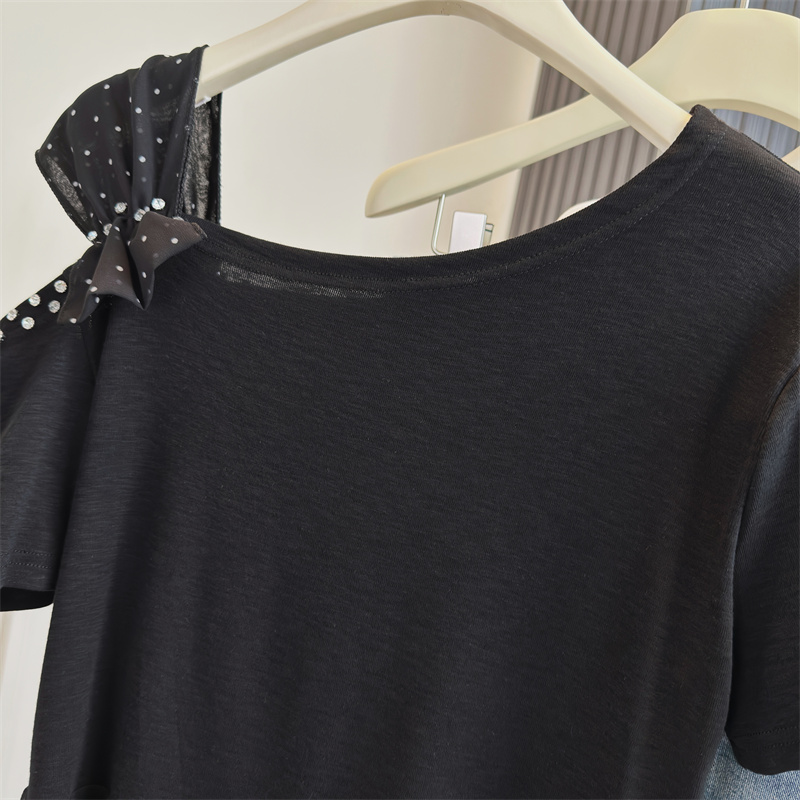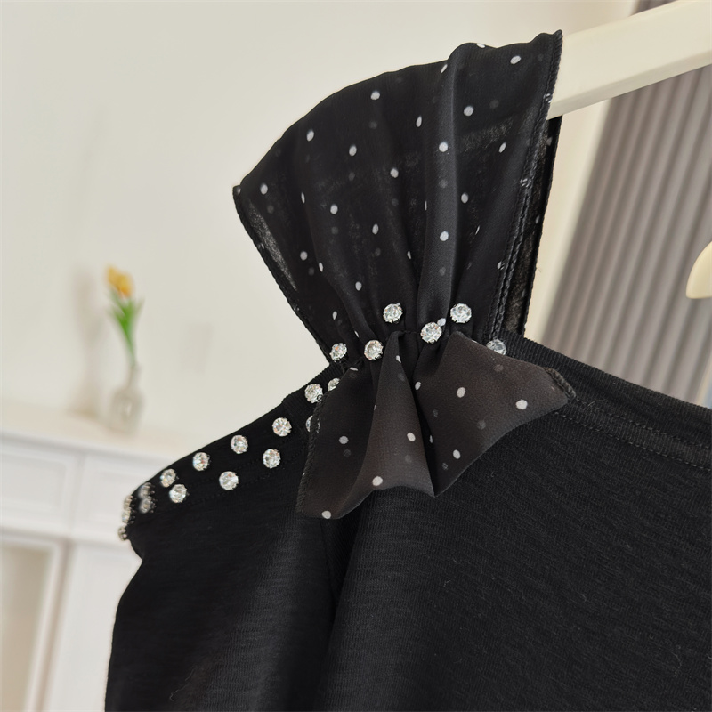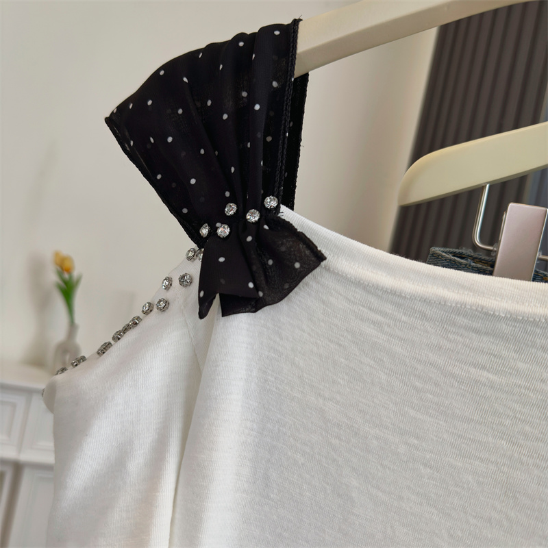 RY2103# 实拍大码女装法式独特设计感斜肩重工钉钻波点飘带显瘦时尚上衣