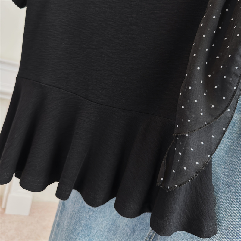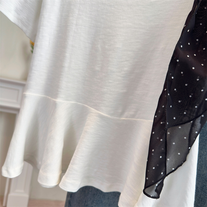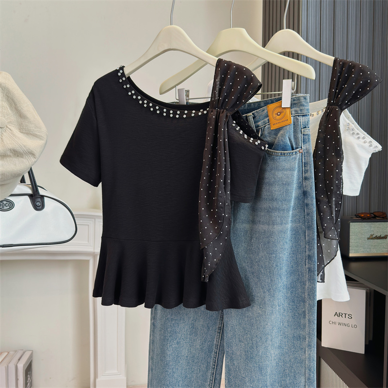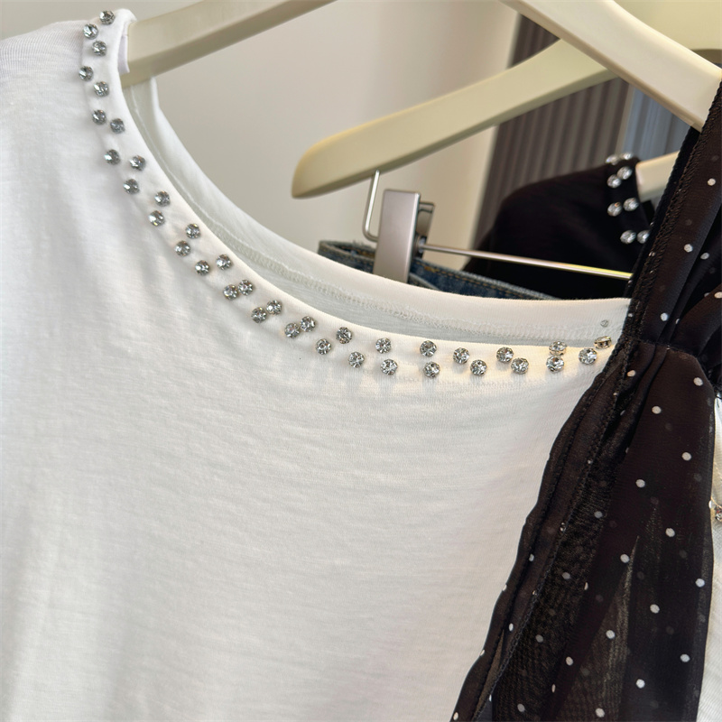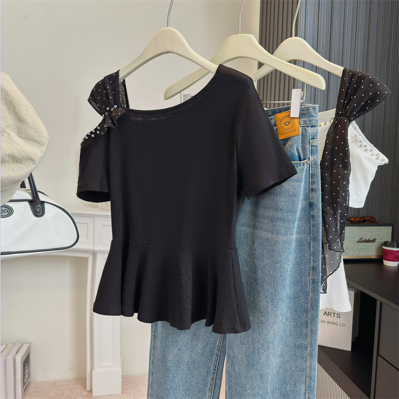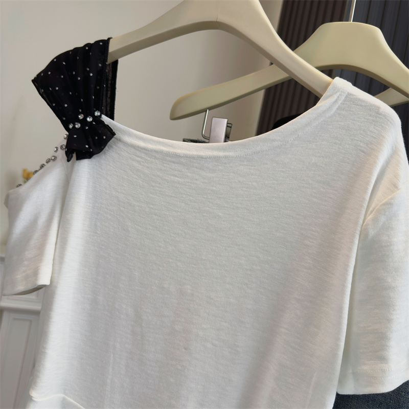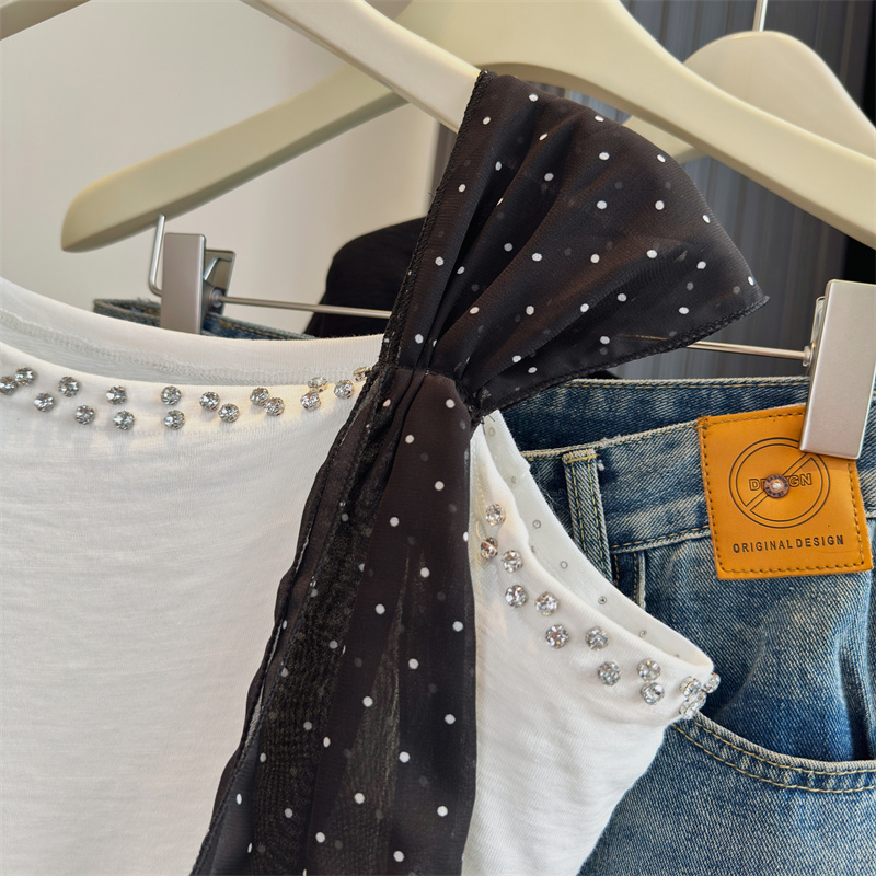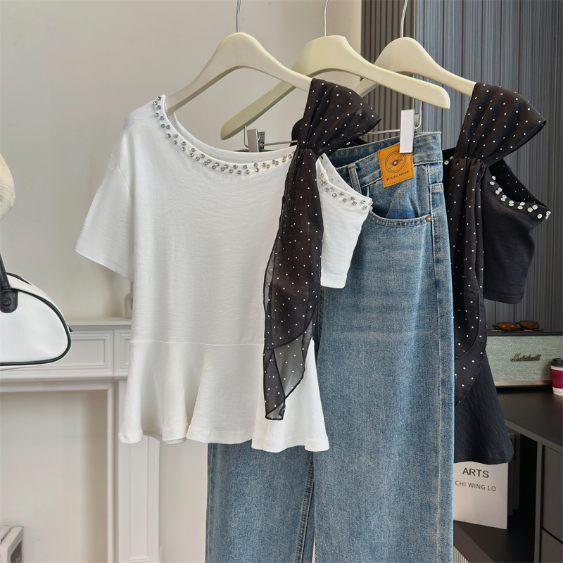RY2103# 实拍大码女装法式独特设计感斜肩重工钉钻波点飘带显瘦时尚上衣