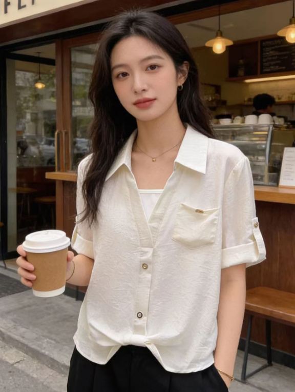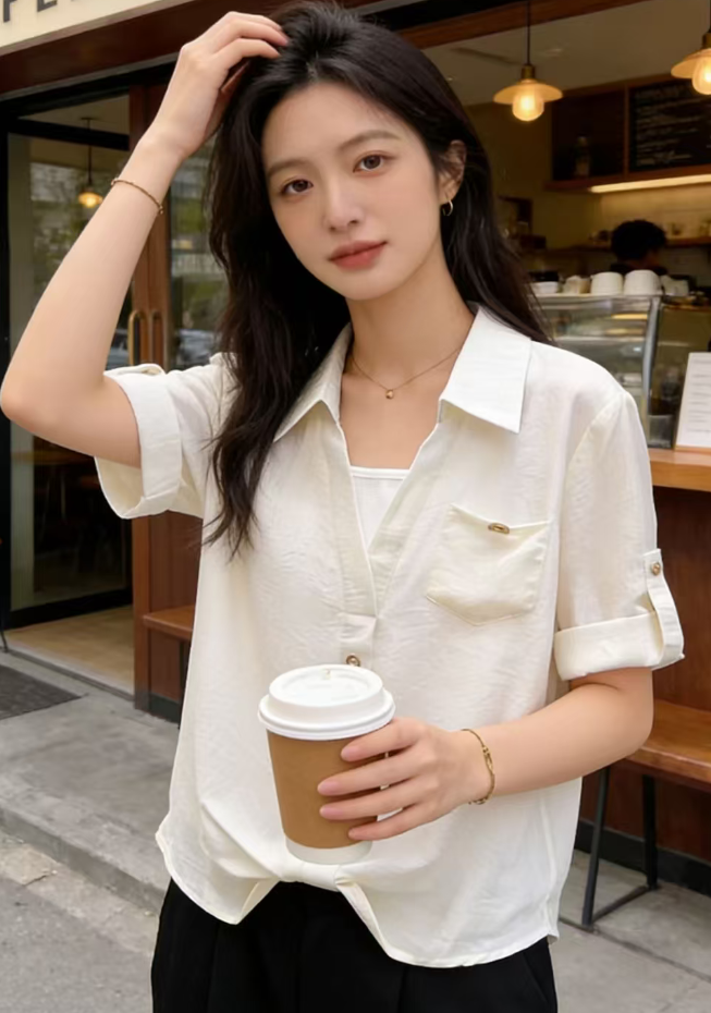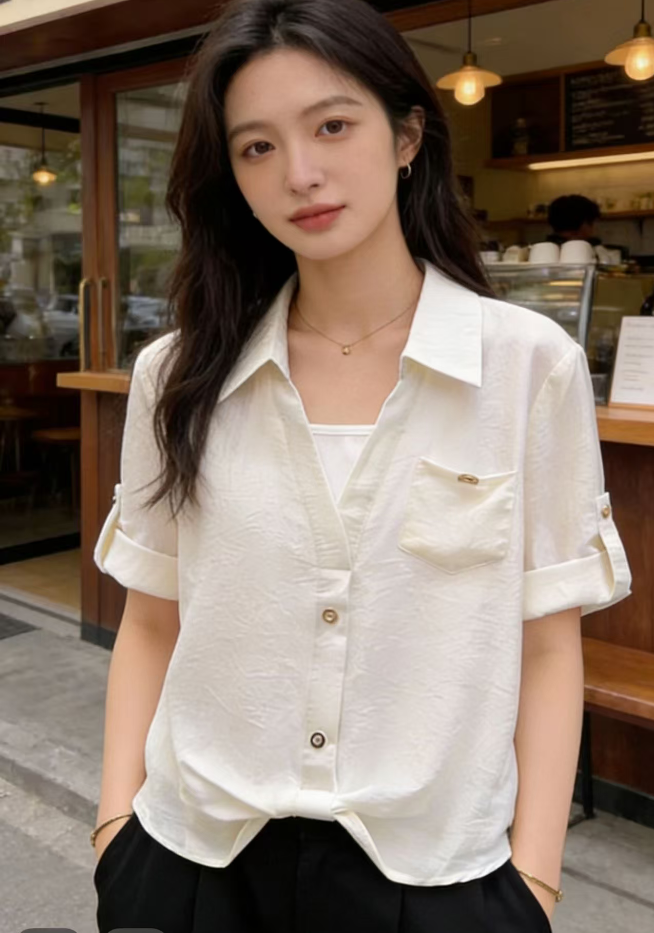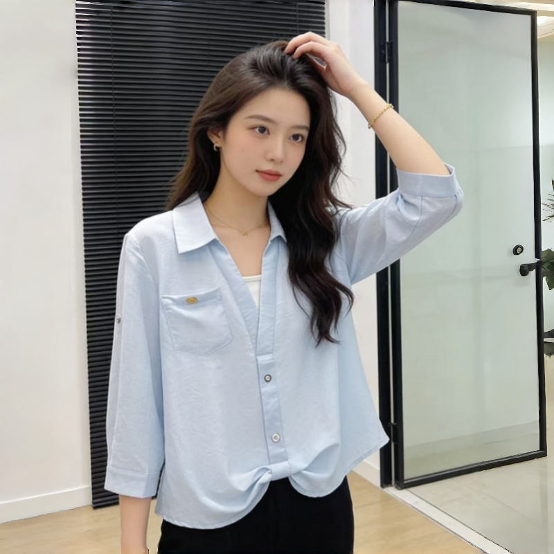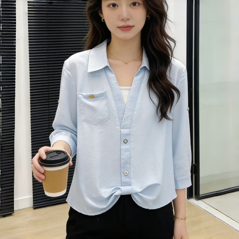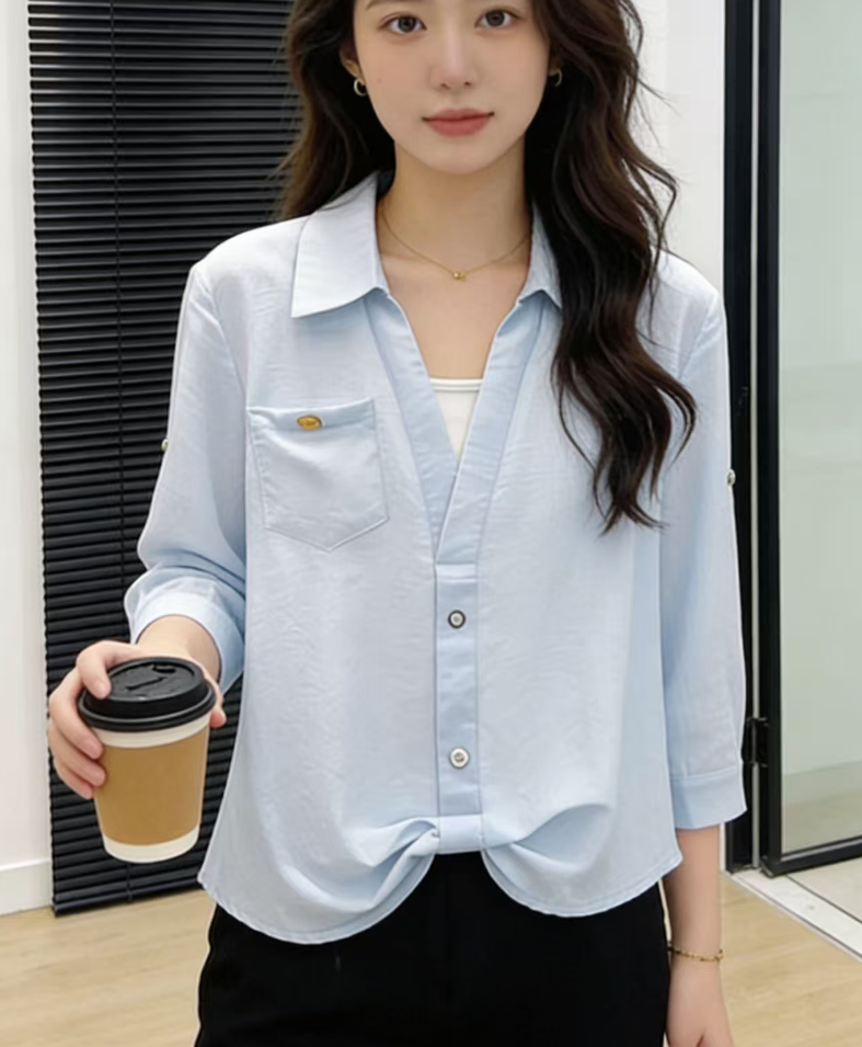 RY2118# 假两件Polo领七分袖衬衫女春夏法式小资减龄气质单穿别致独特上衣