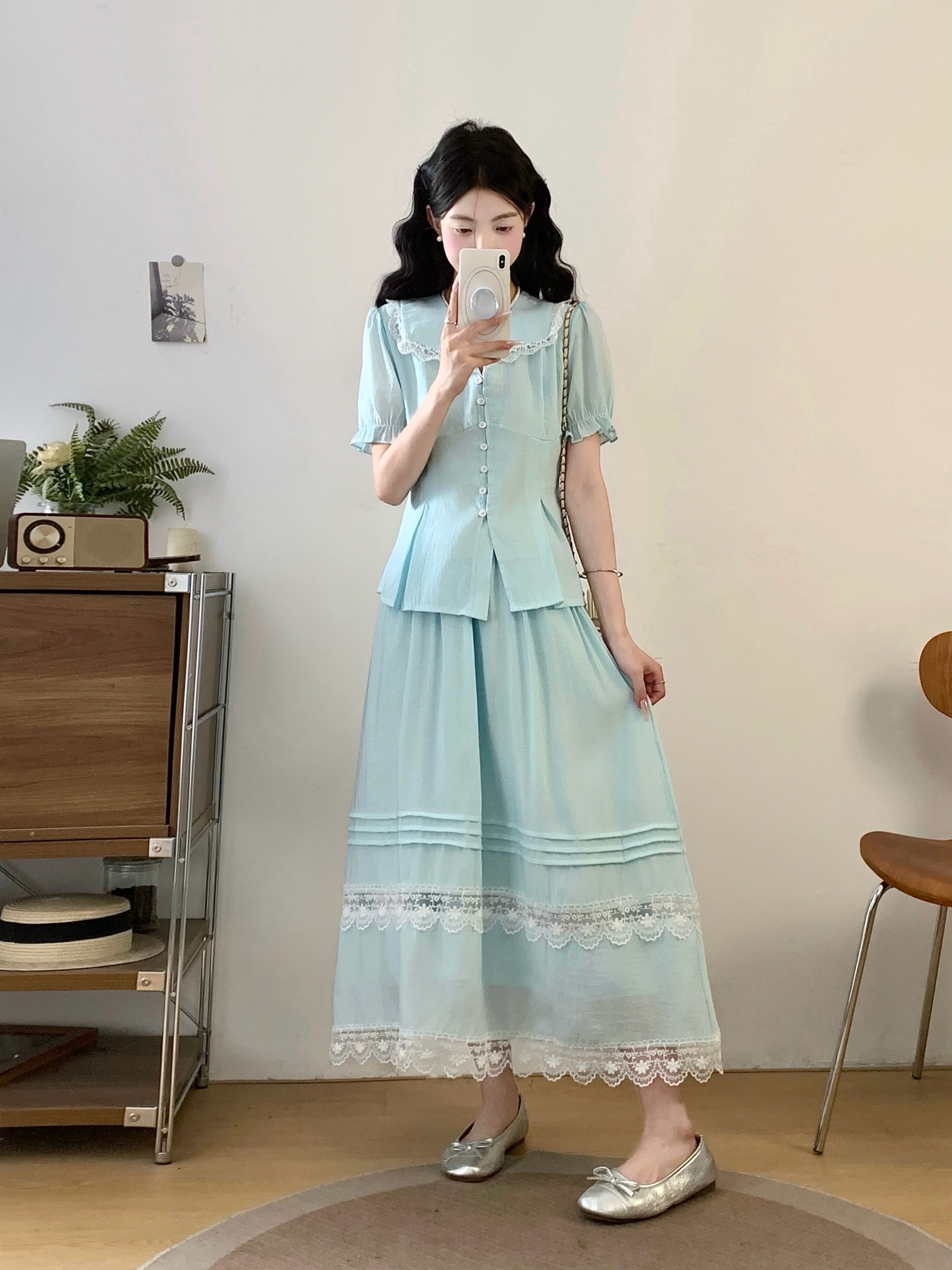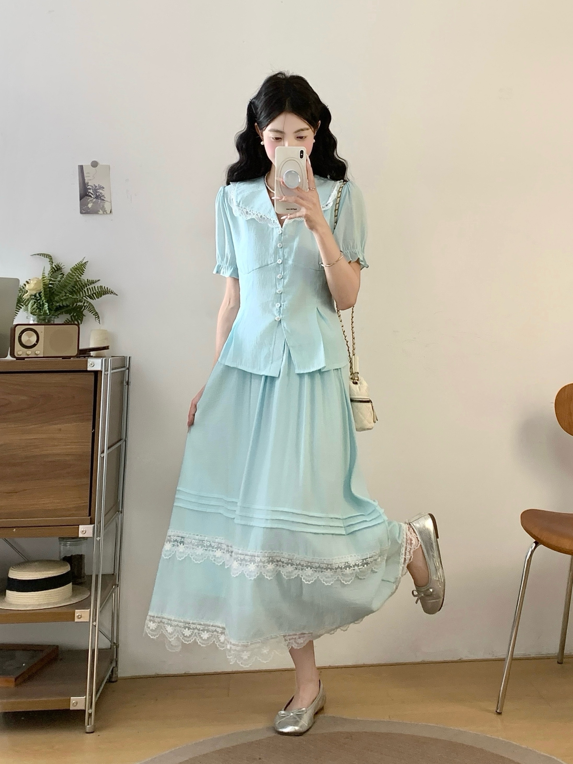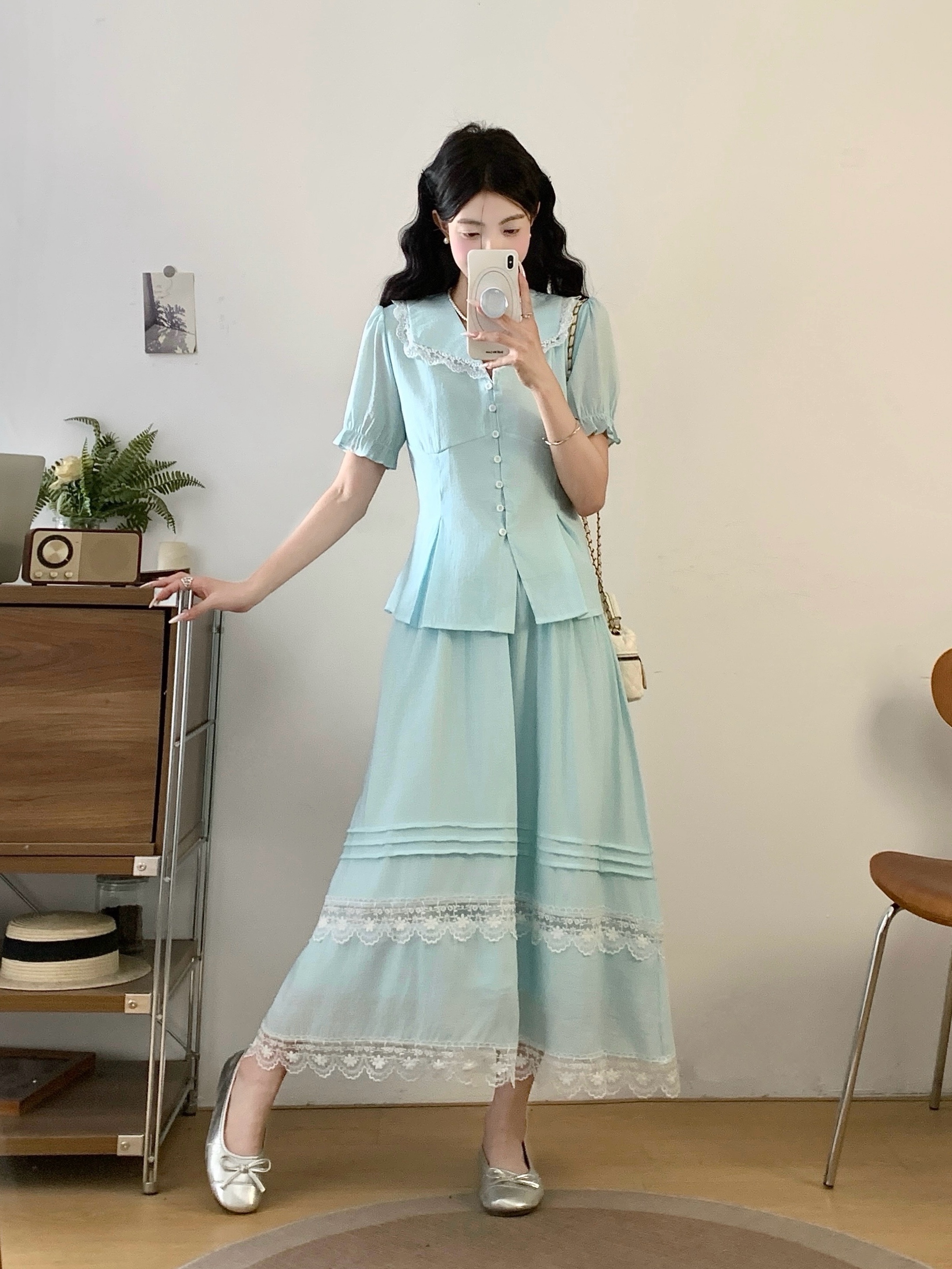 RY2122# 实拍衣有货铃兰薄荷诗仙感锦皱蕾丝花边上衣半裙套装