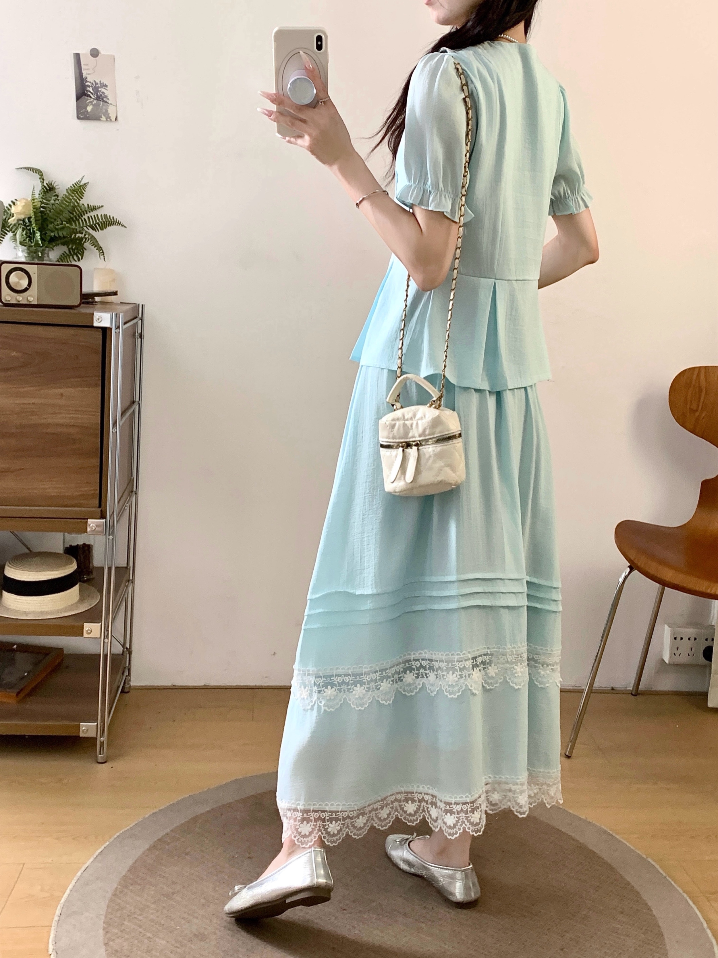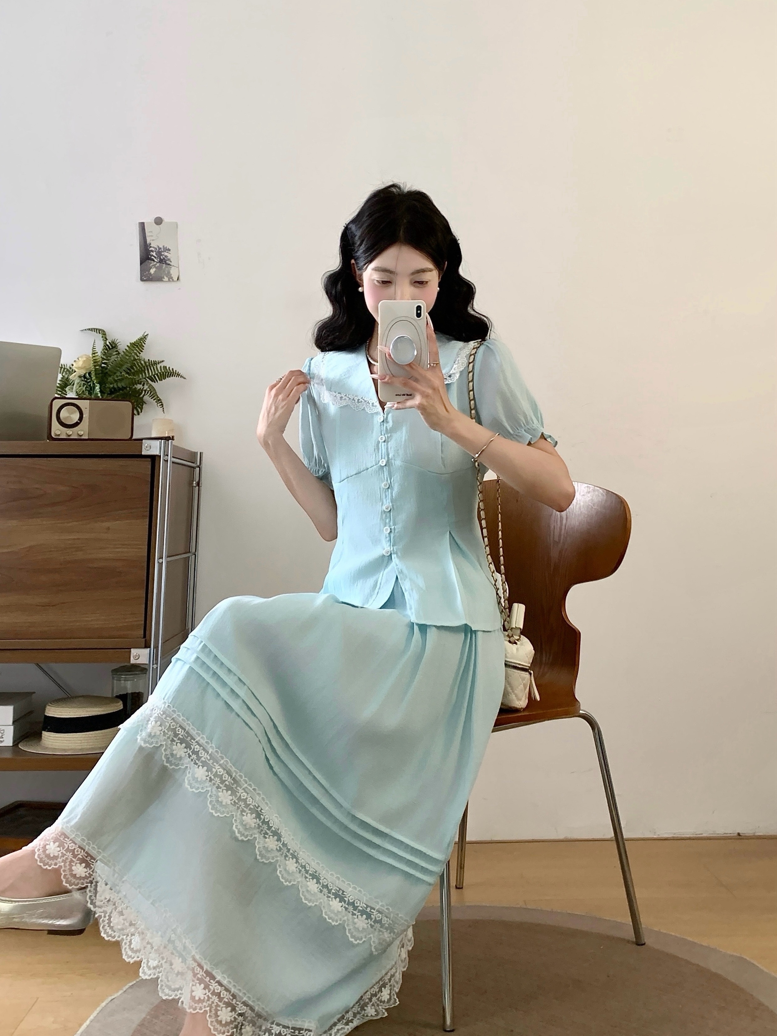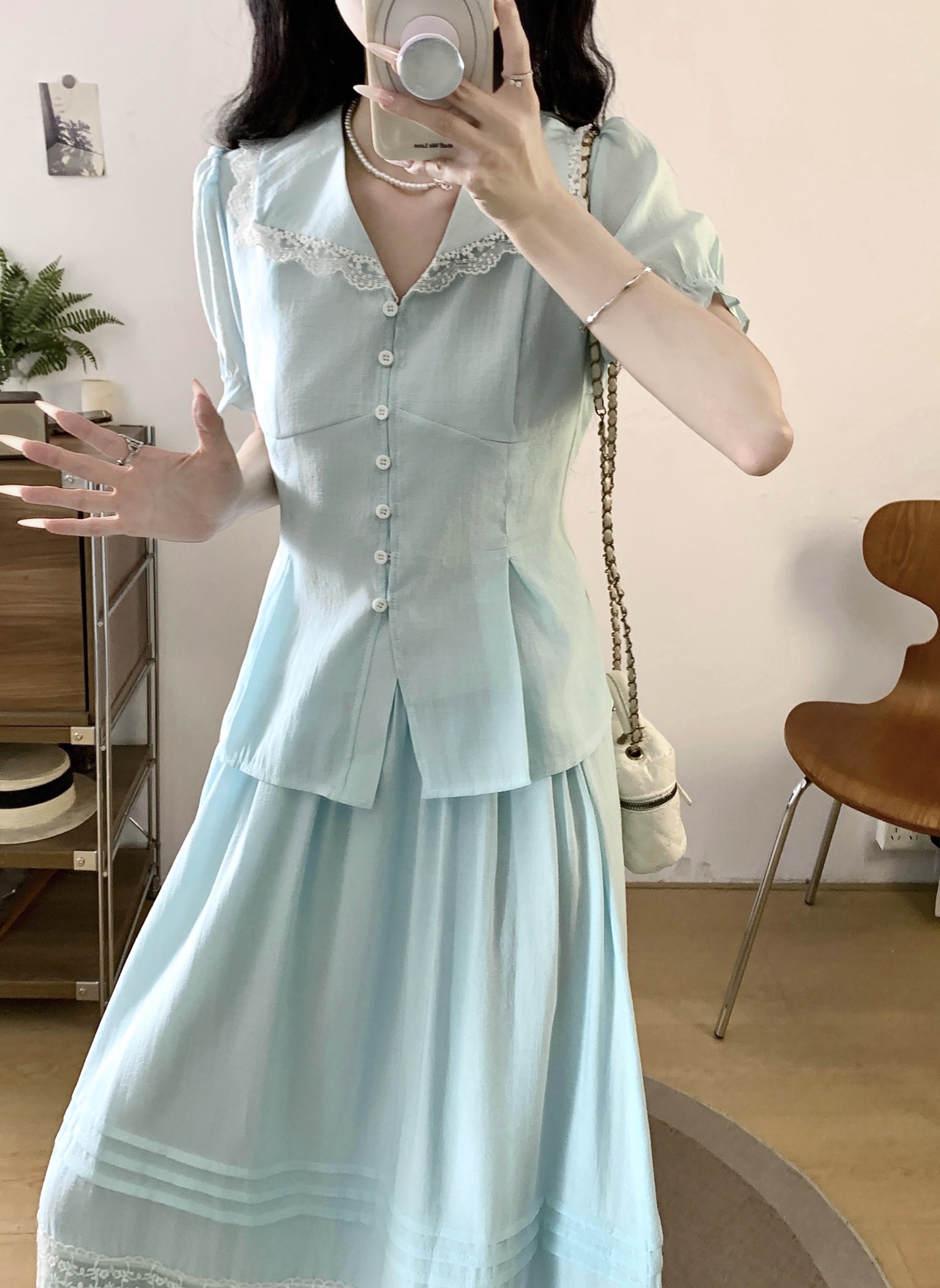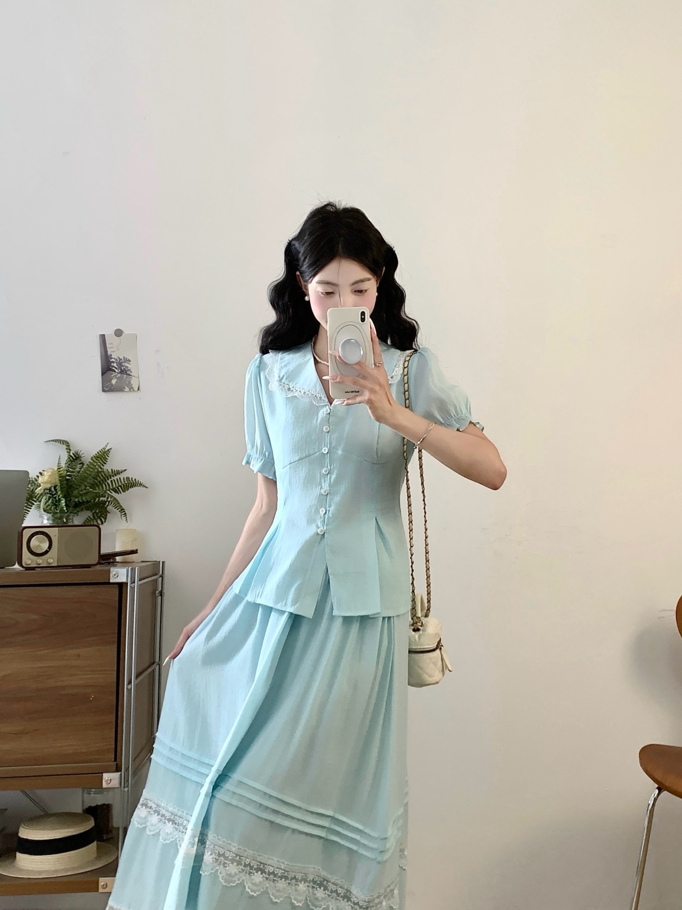 RY2122# 实拍衣有货铃兰薄荷诗仙感锦皱蕾丝花边上衣半裙套装