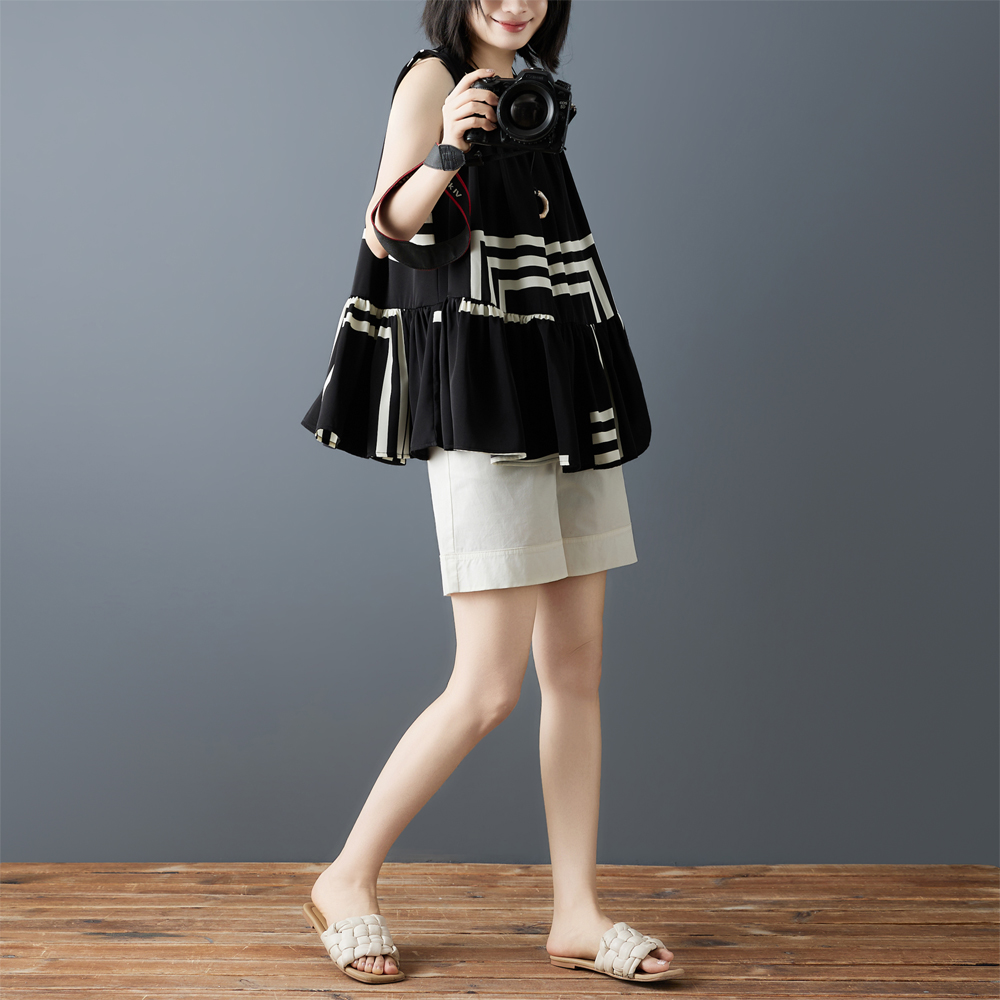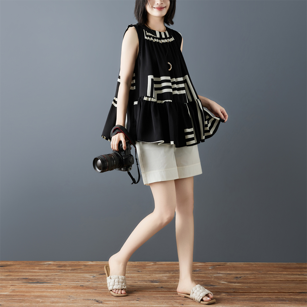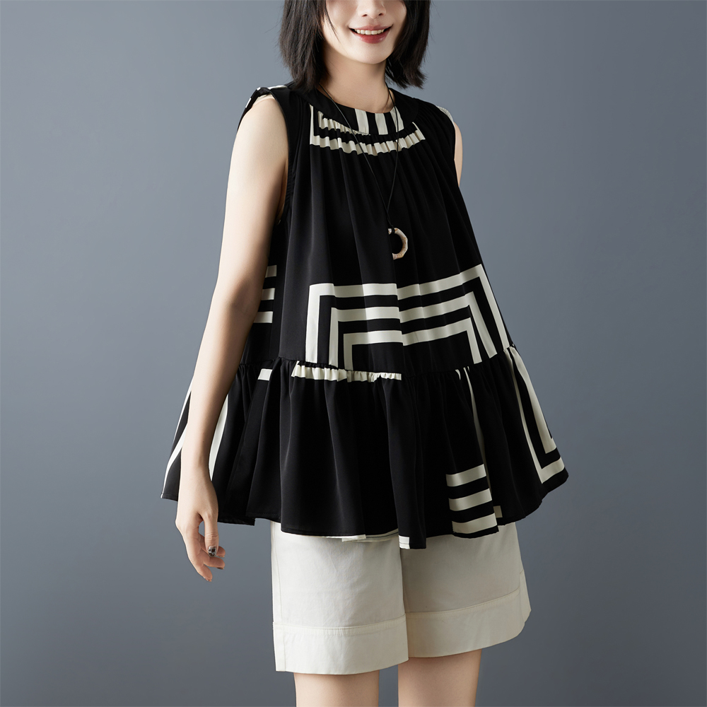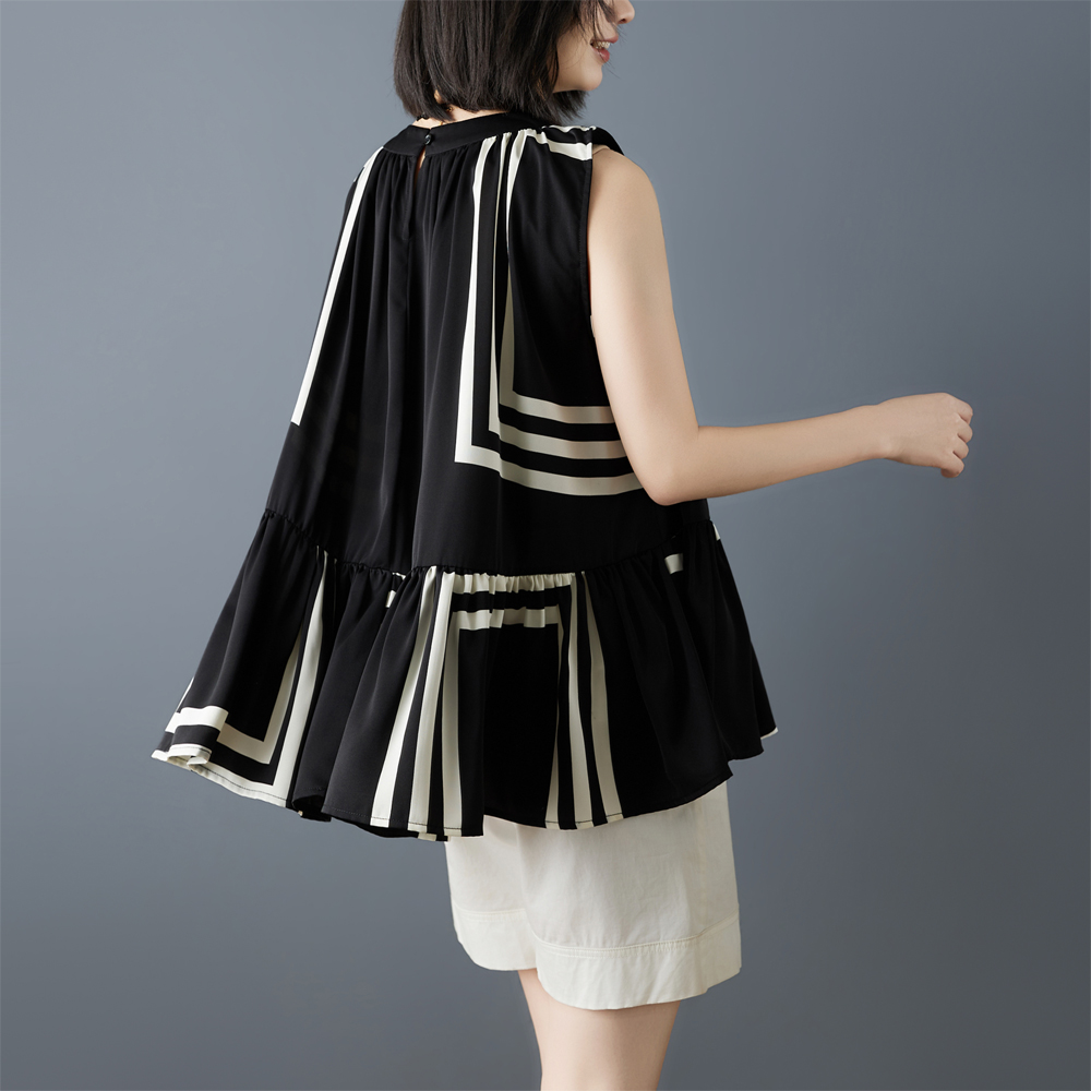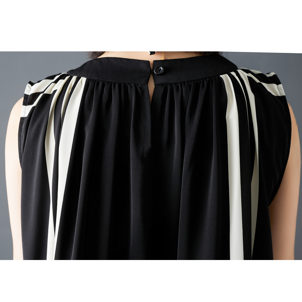 RY2154# 实拍2026夏季新款雪纺衫衬衫女薄款不规则条纹印花宽松无袖上衣