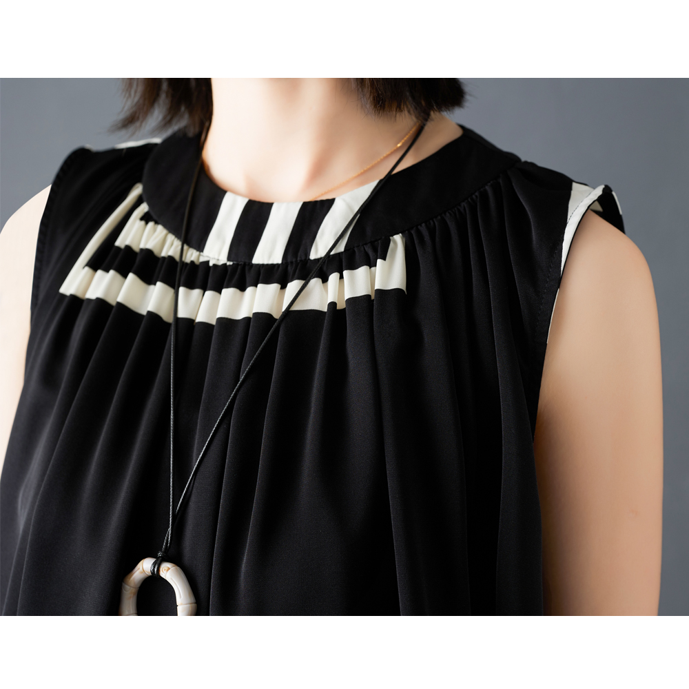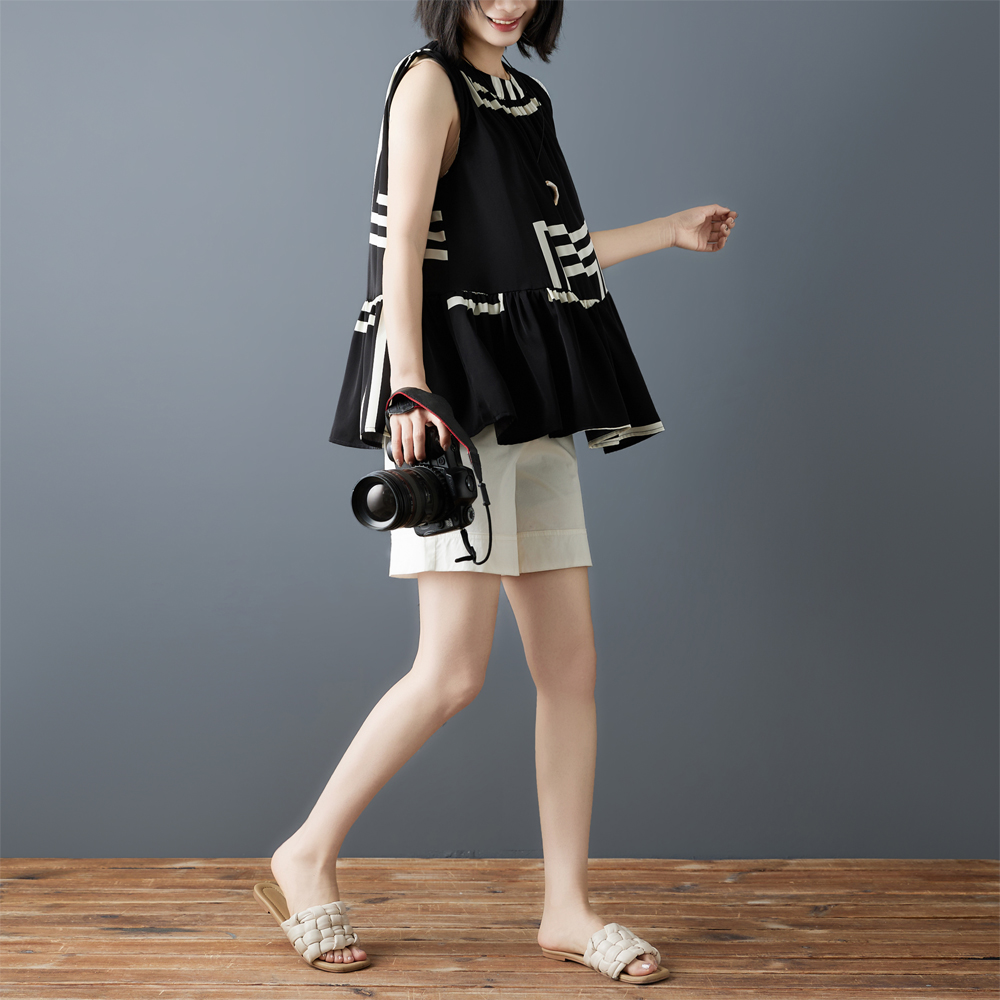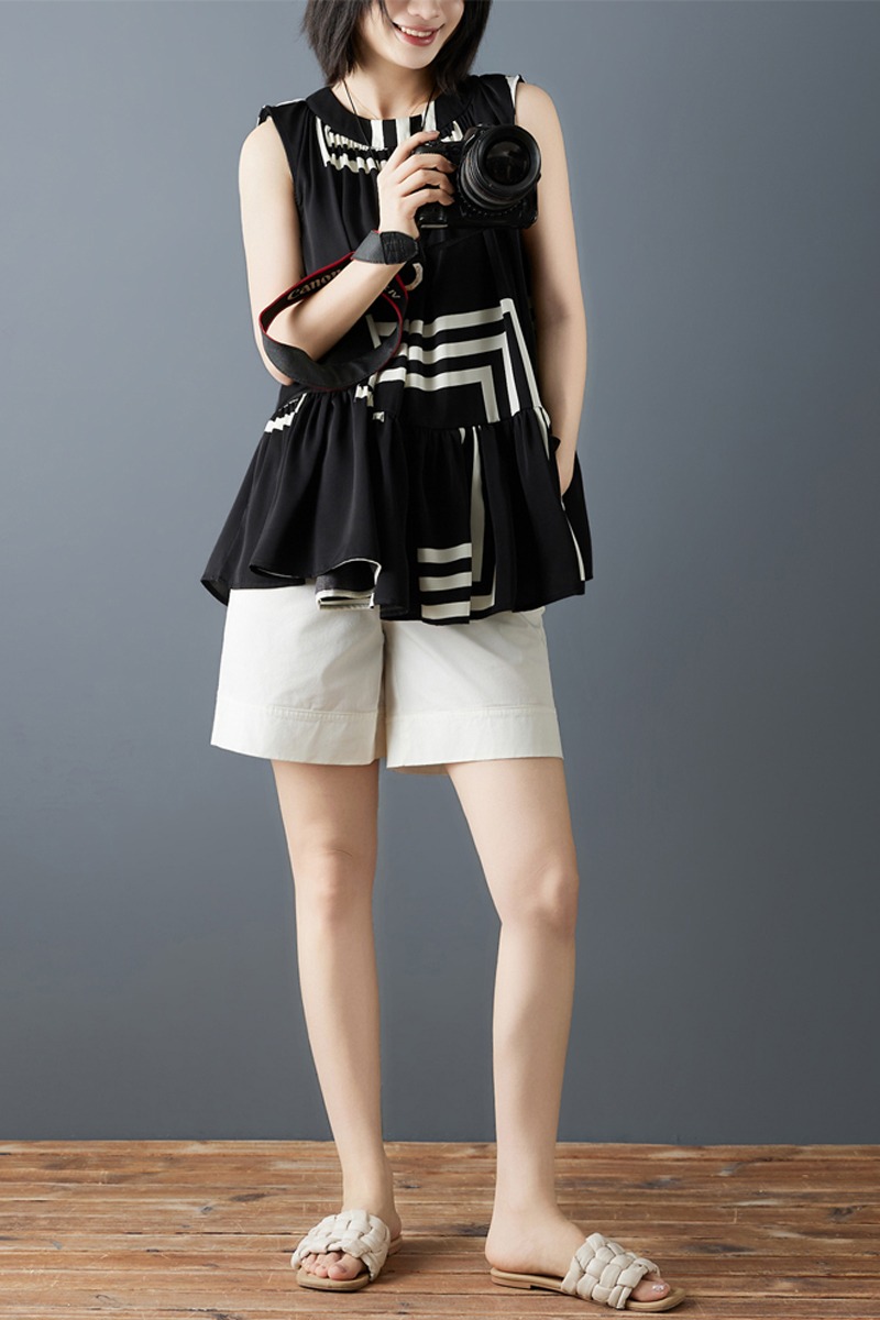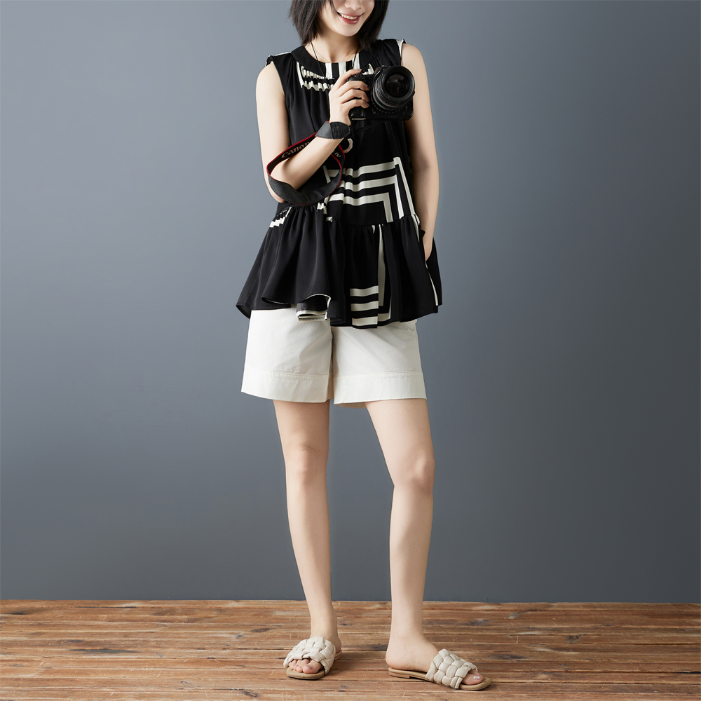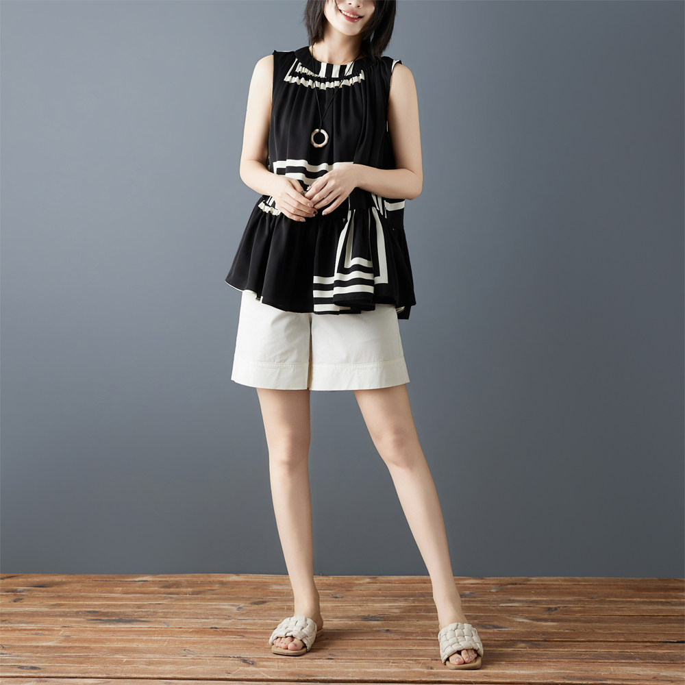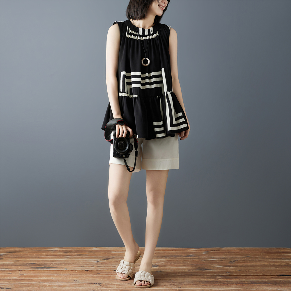 RY2154# 实拍2026夏季新款雪纺衫衬衫女薄款不规则条纹印花宽松无袖上衣