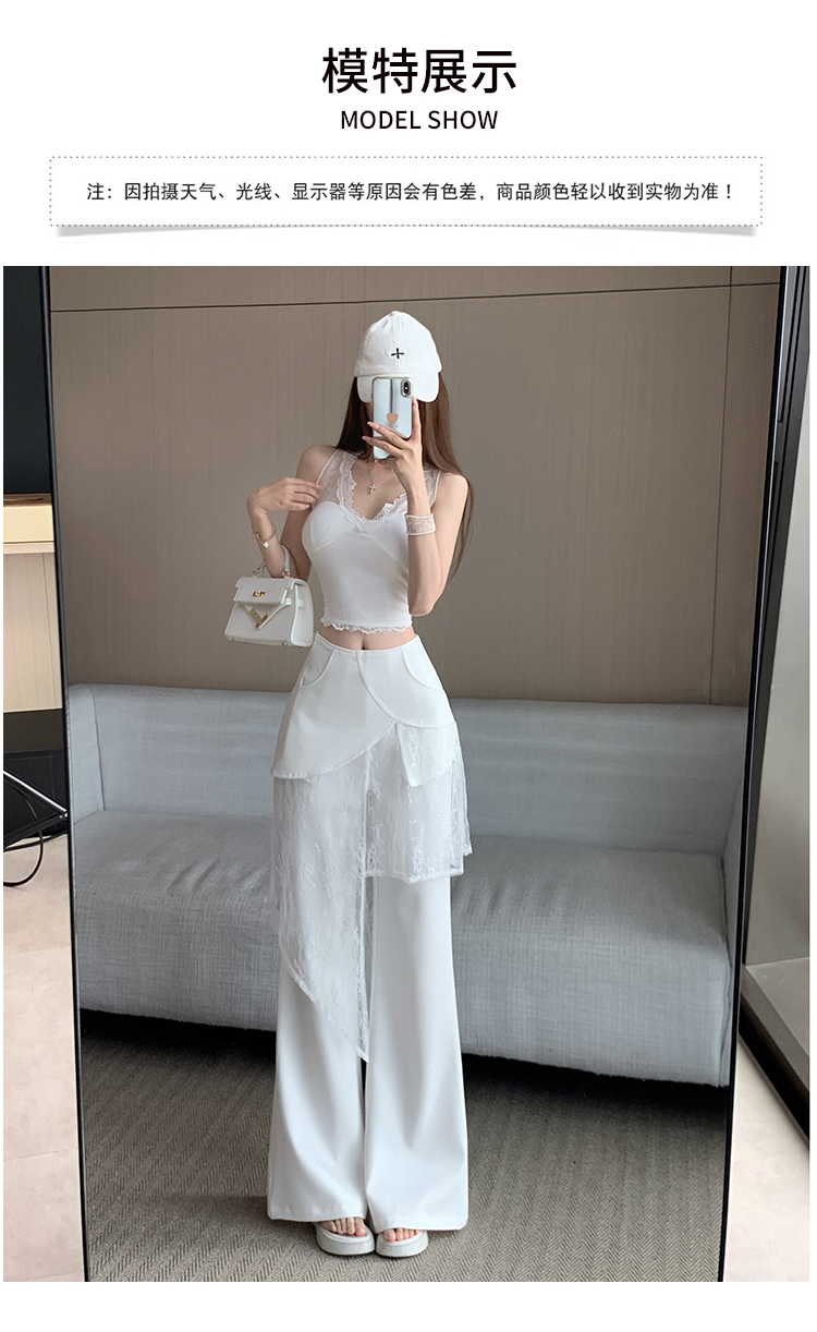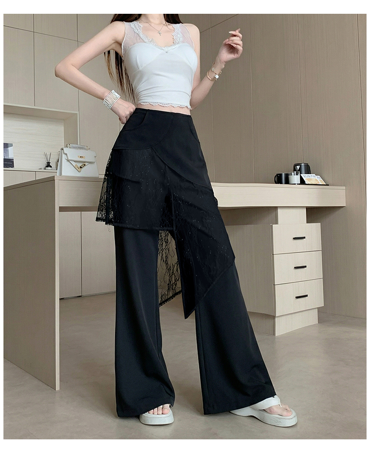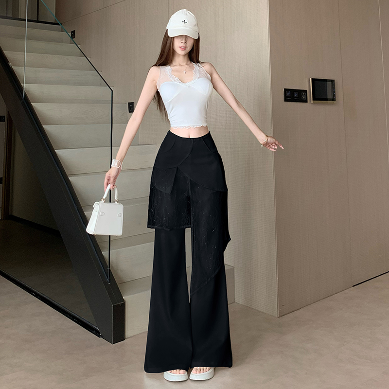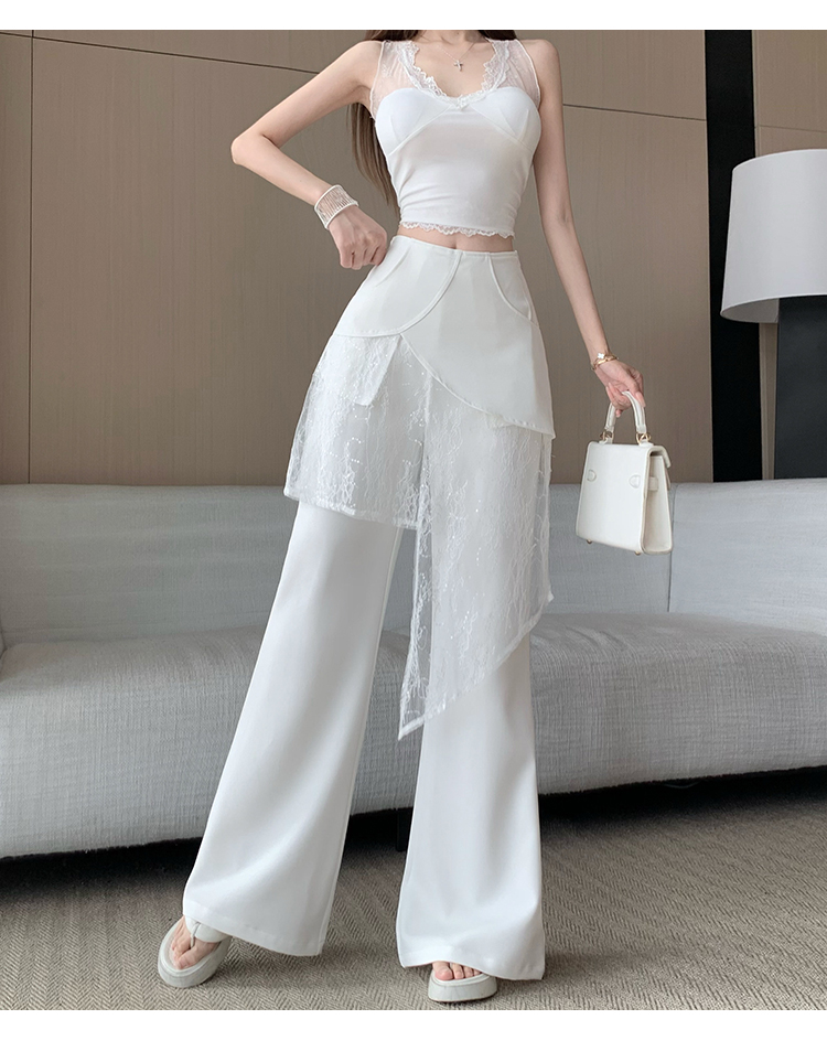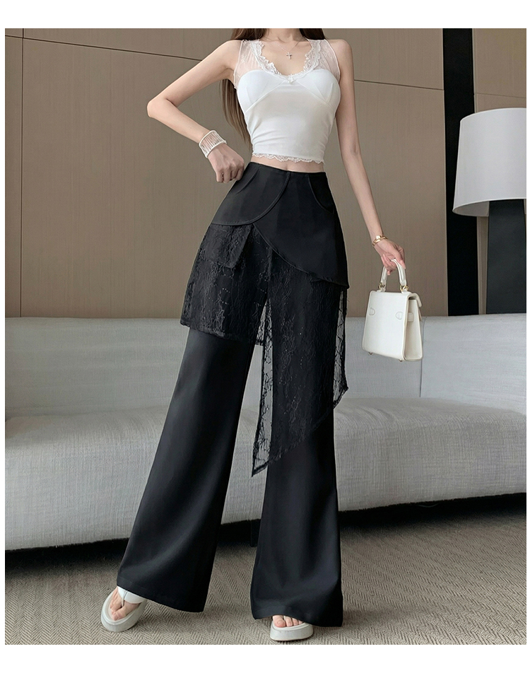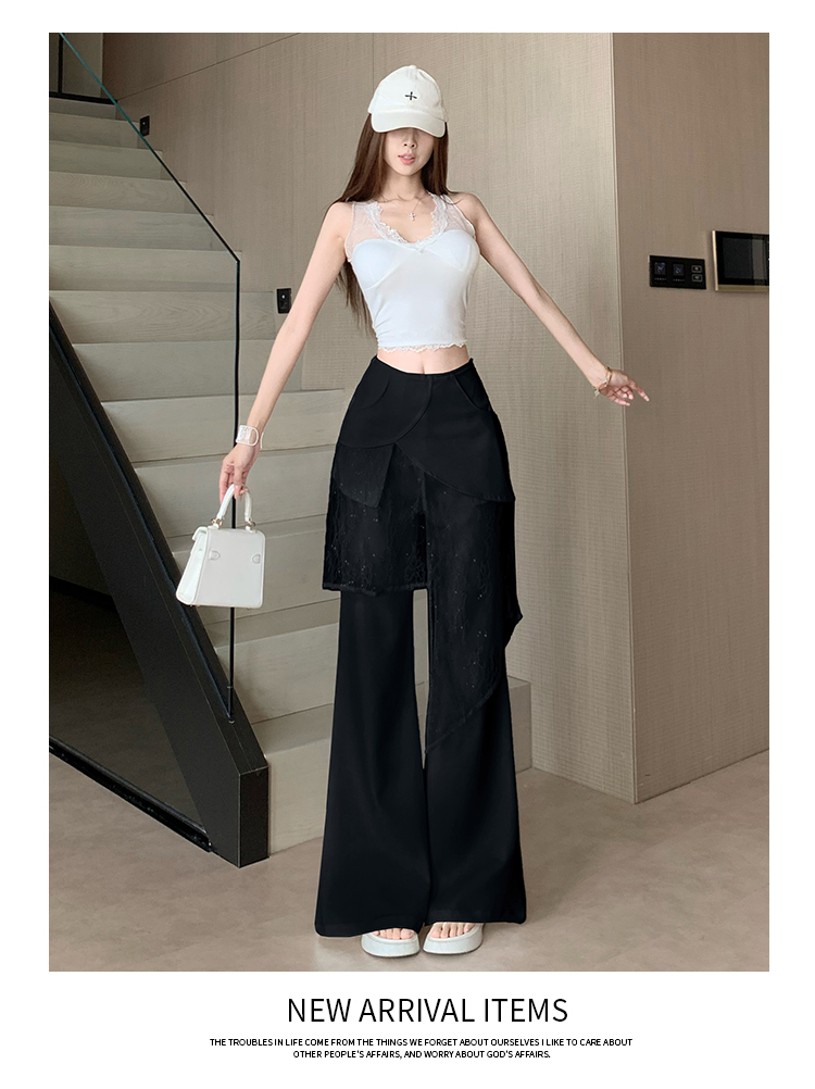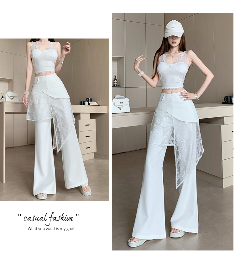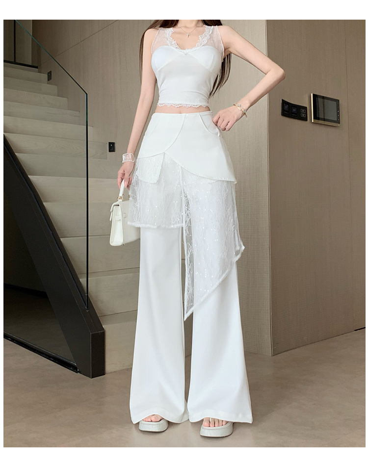 RY2847# 白色叠穿屁帘阔腿裤女夏季薄款假两件拼接高腰垂感直筒拖地休闲裤