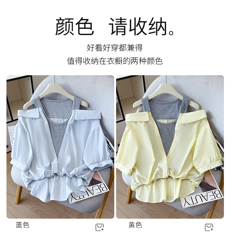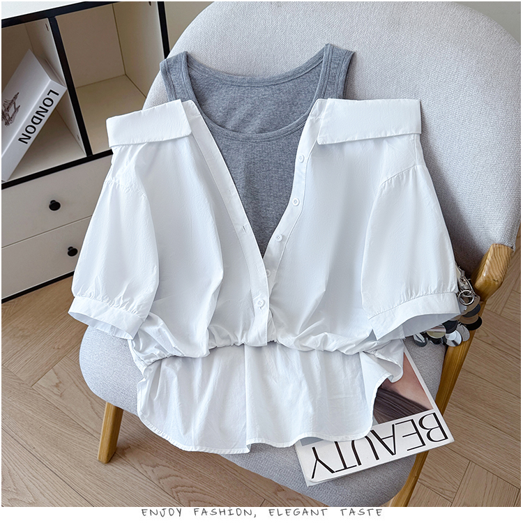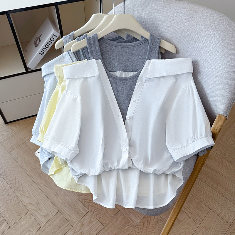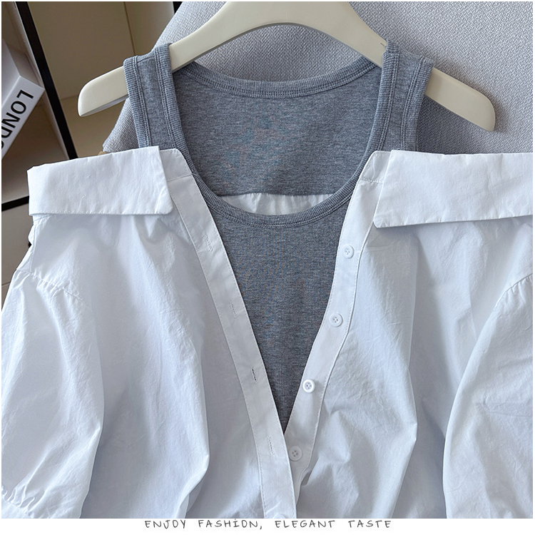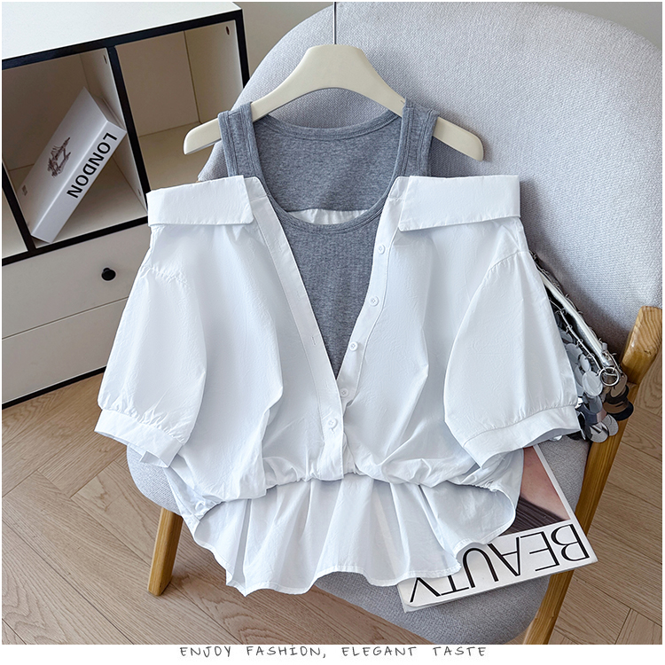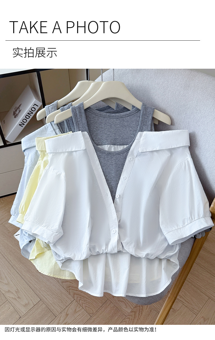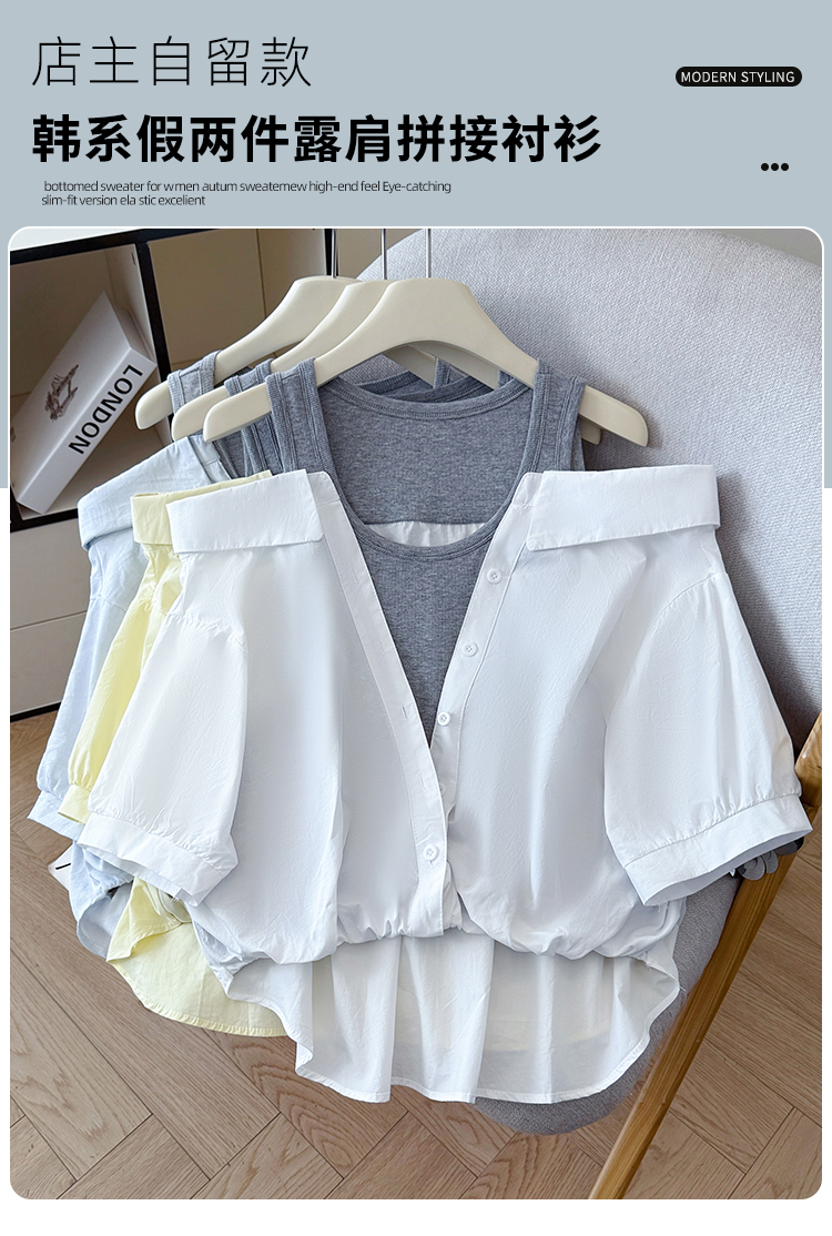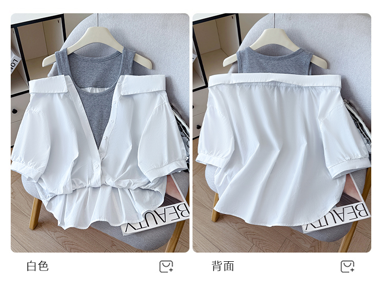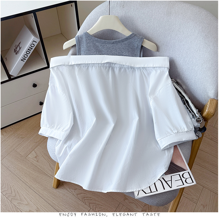 RY3521# 2026夏季新款法式气质收腰露肩拼接假两件套白色短袖衬衫衬衣上衣
