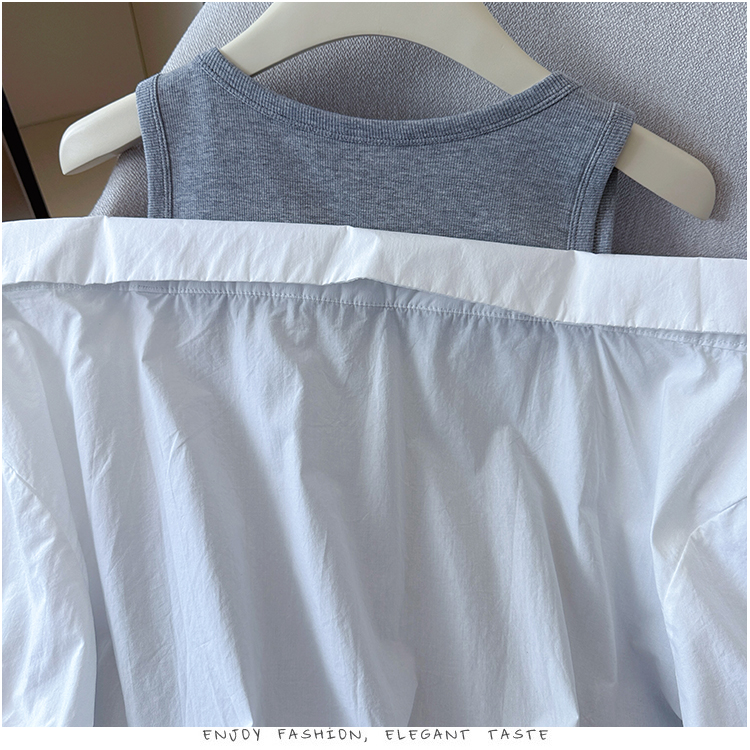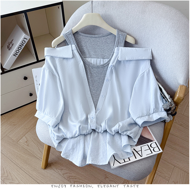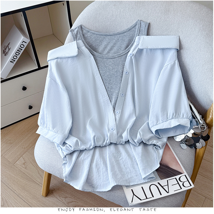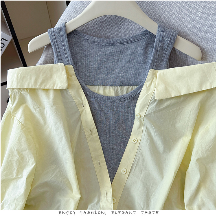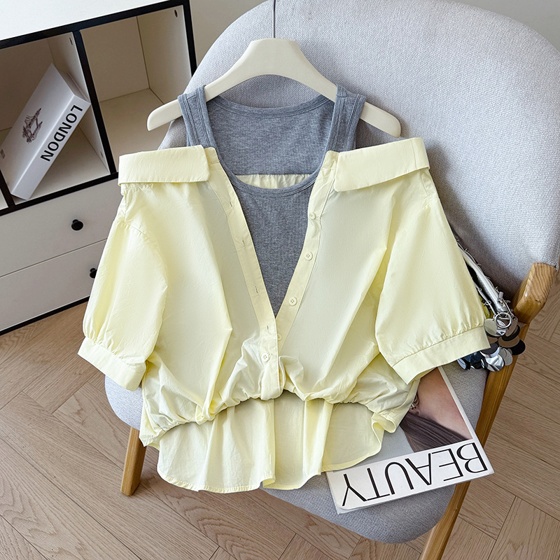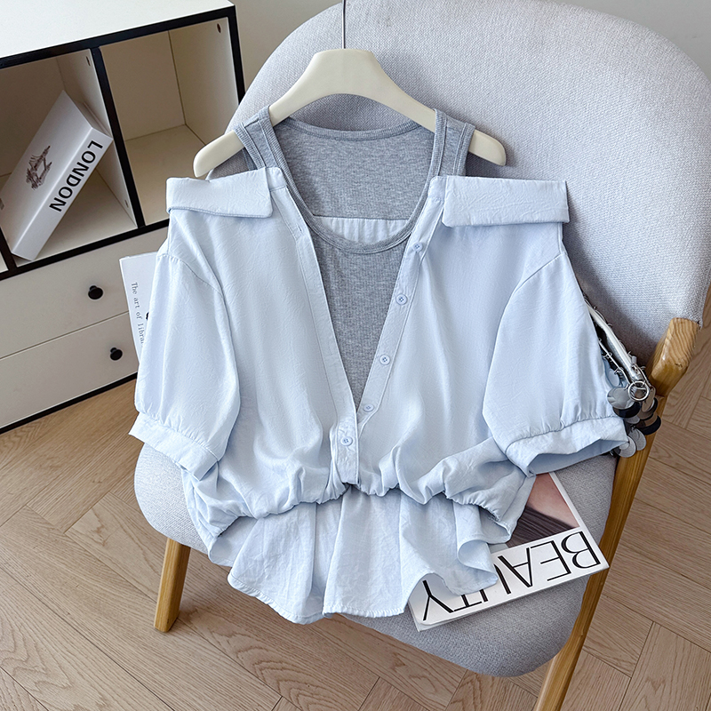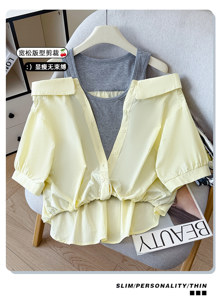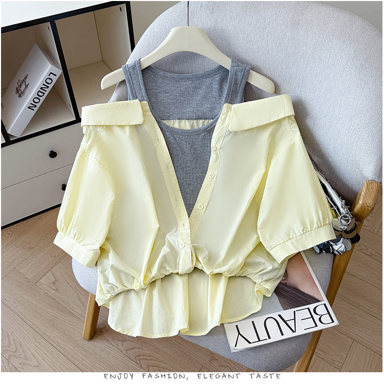 RY3521# 2026夏季新款法式气质收腰露肩拼接假两件套白色短袖衬衫衬衣上衣