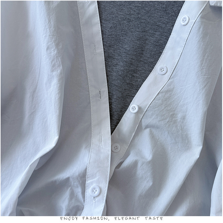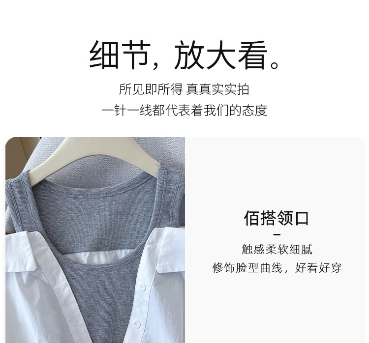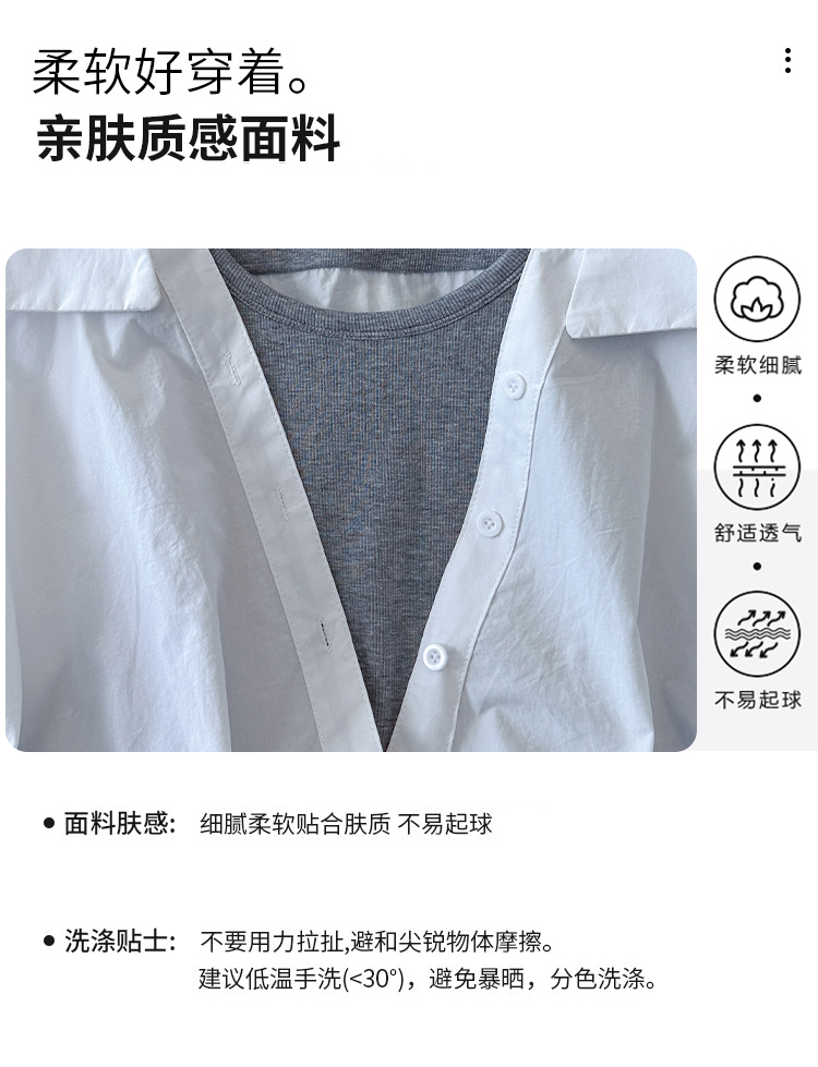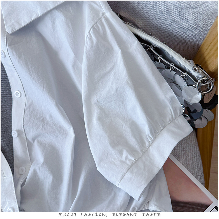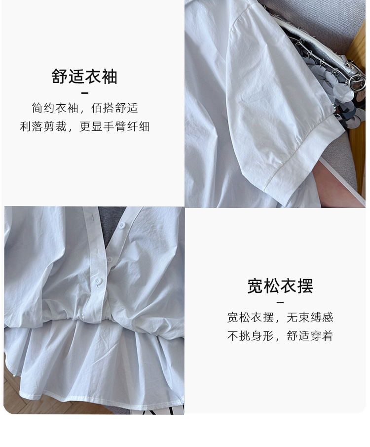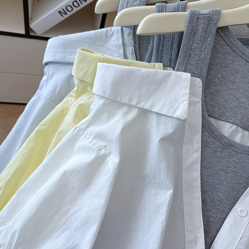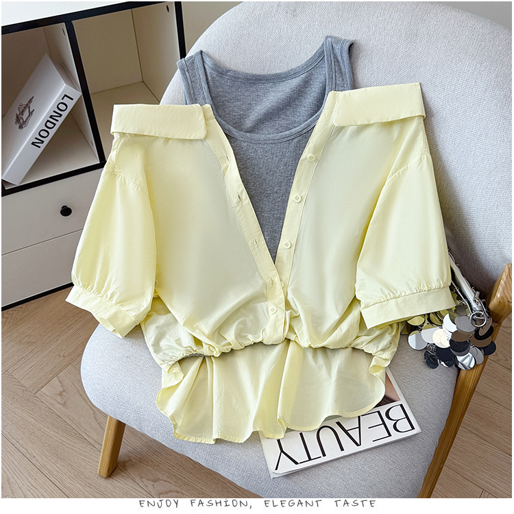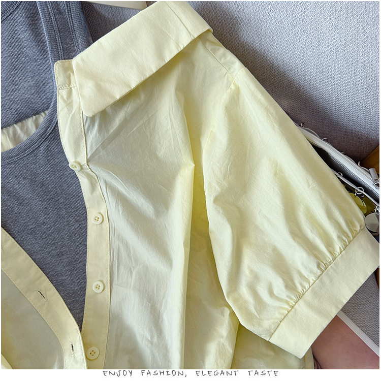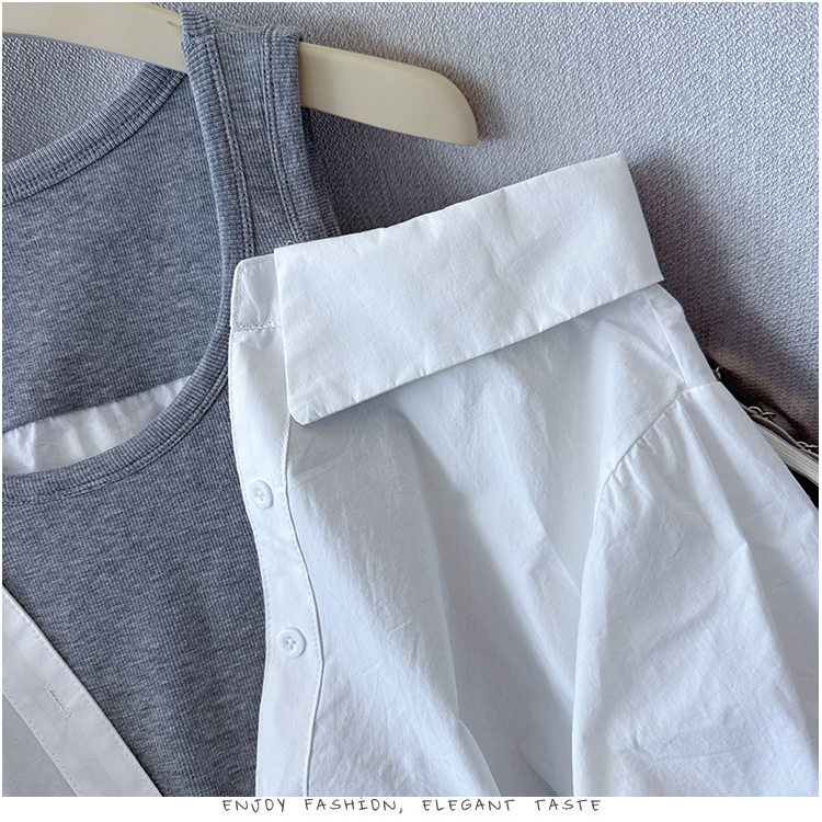 RY3521# 2026夏季新款法式气质收腰露肩拼接假两件套白色短袖衬衫衬衣上衣