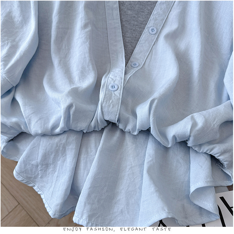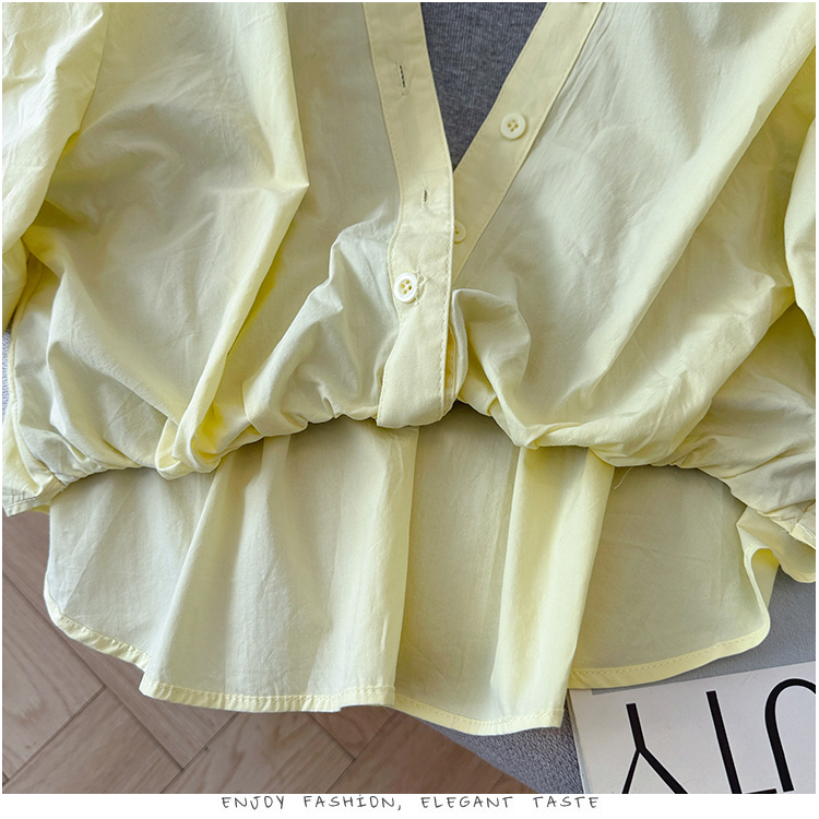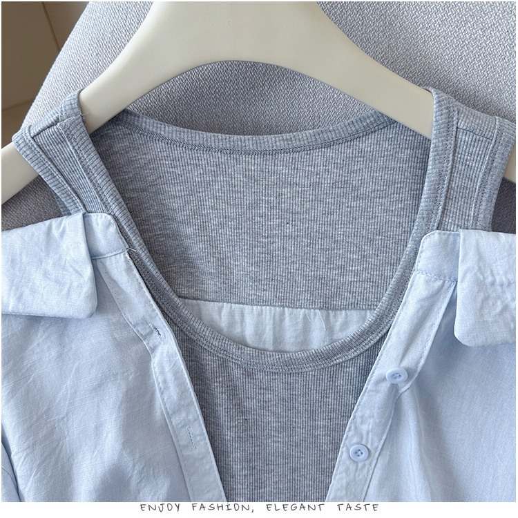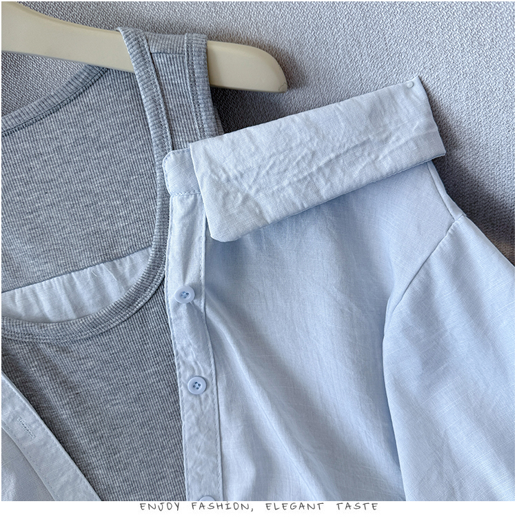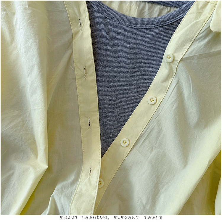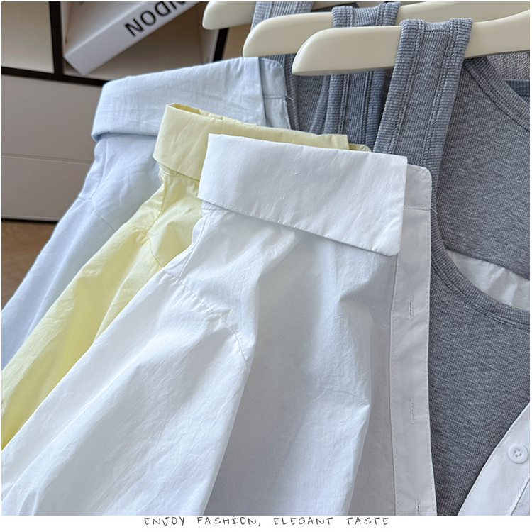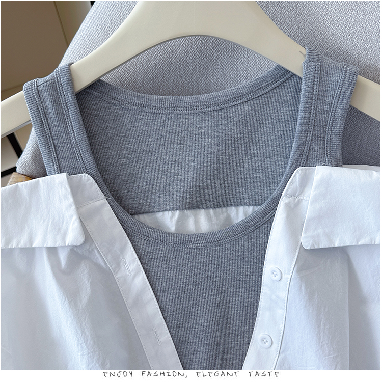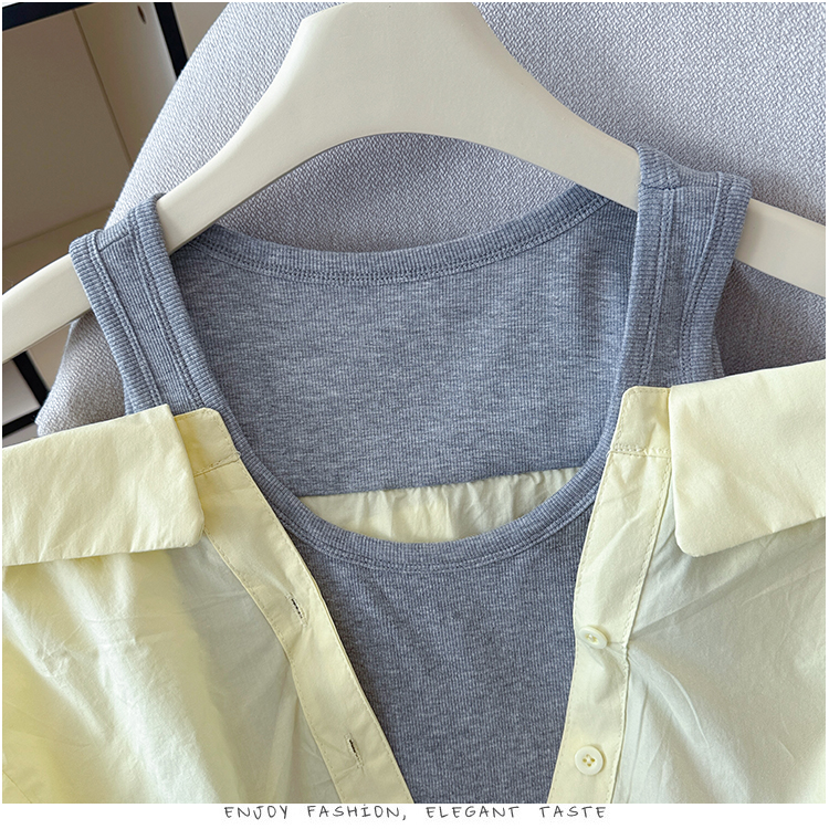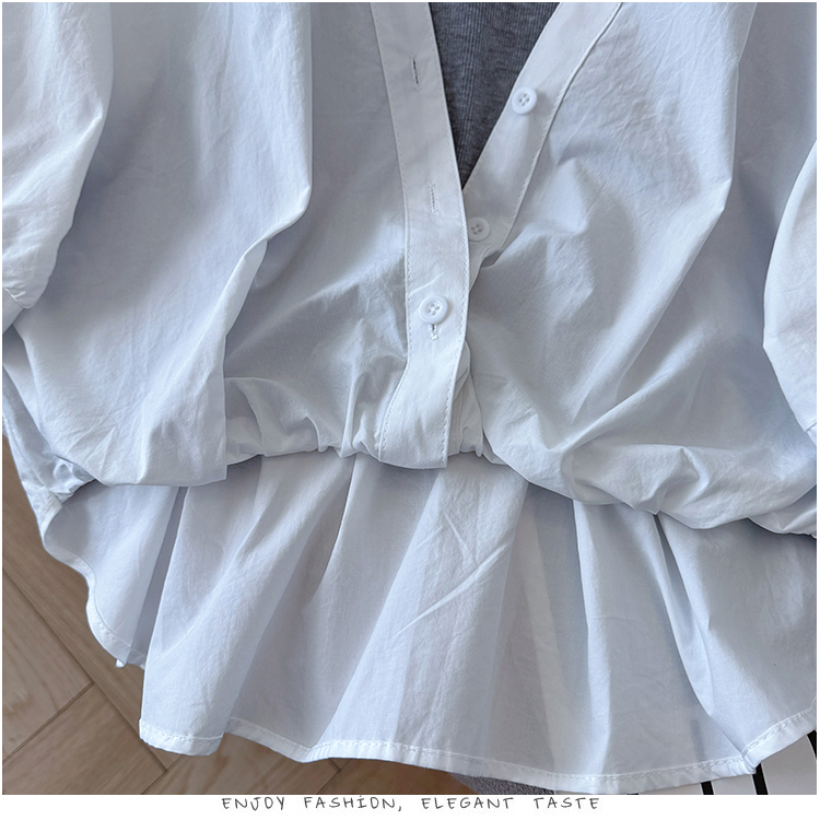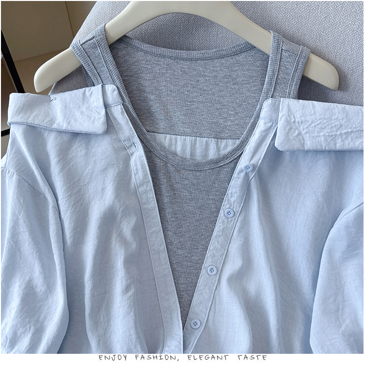 RY3521# 2026夏季新款法式气质收腰露肩拼接假两件套白色短袖衬衫衬衣上衣