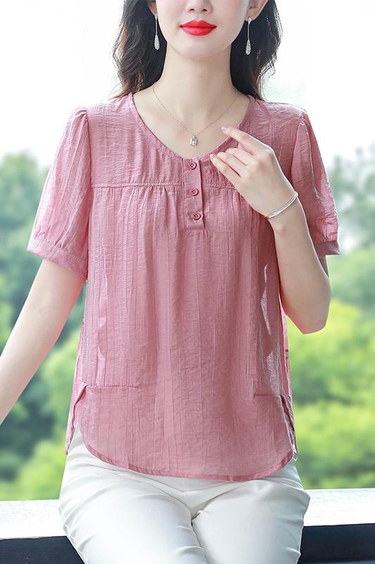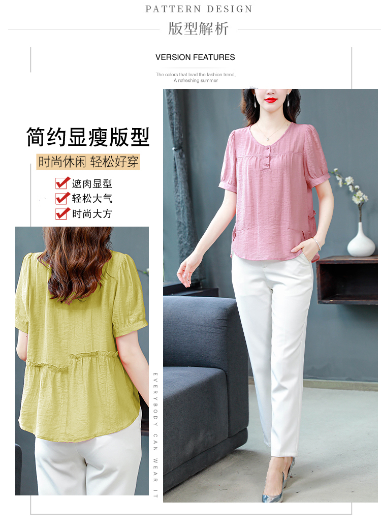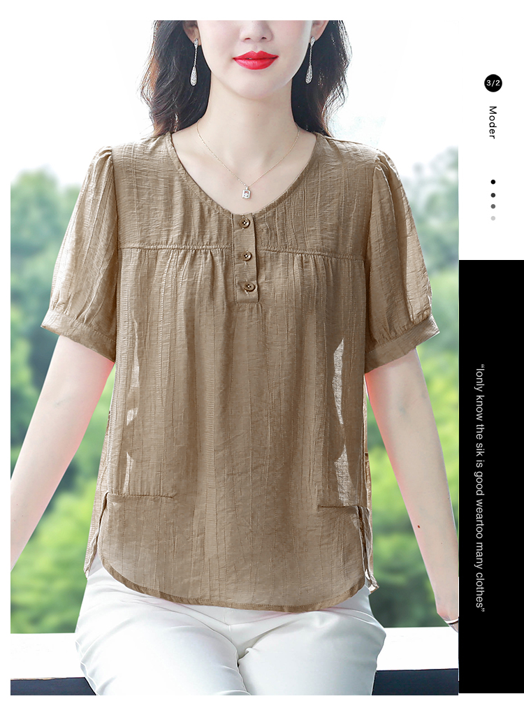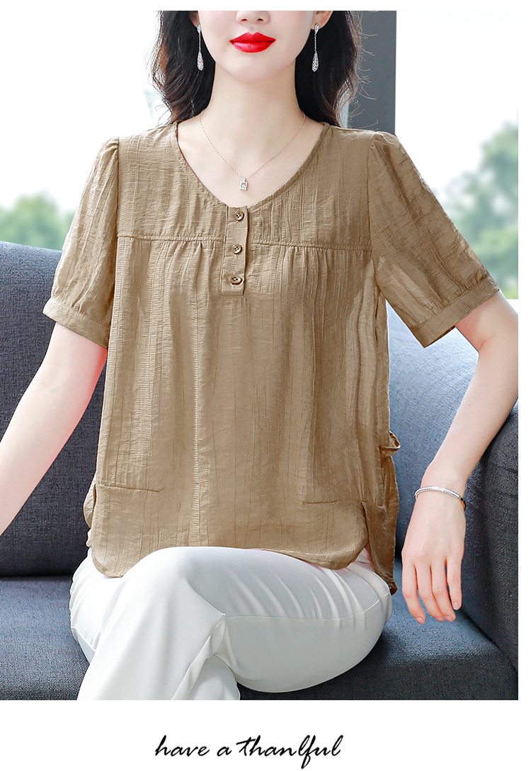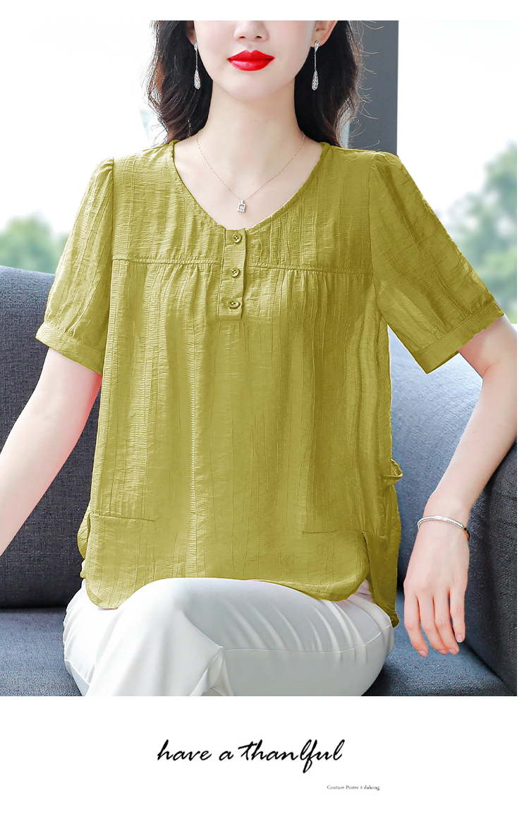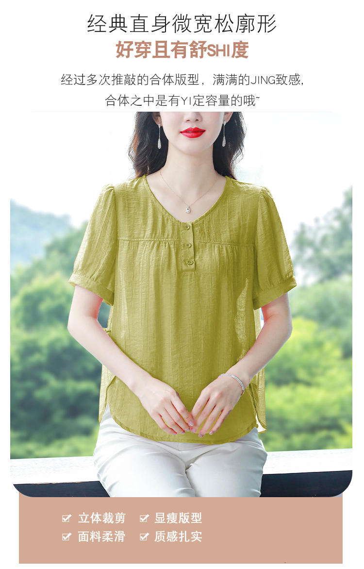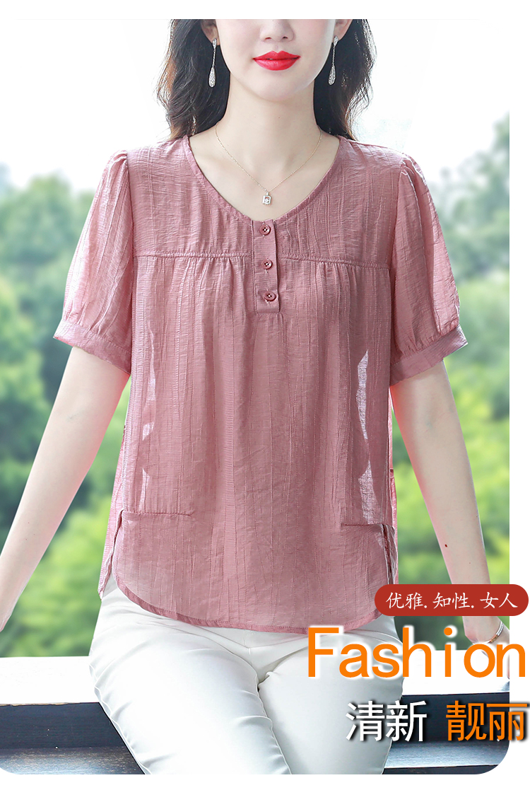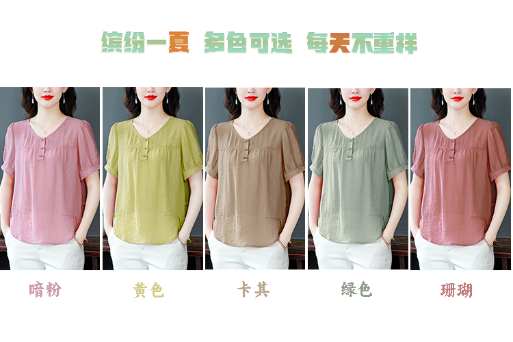 RY3525# 夏新款天丝棉麻时尚洋气大码女上衣遮肚子显瘦圆领开扣短袖