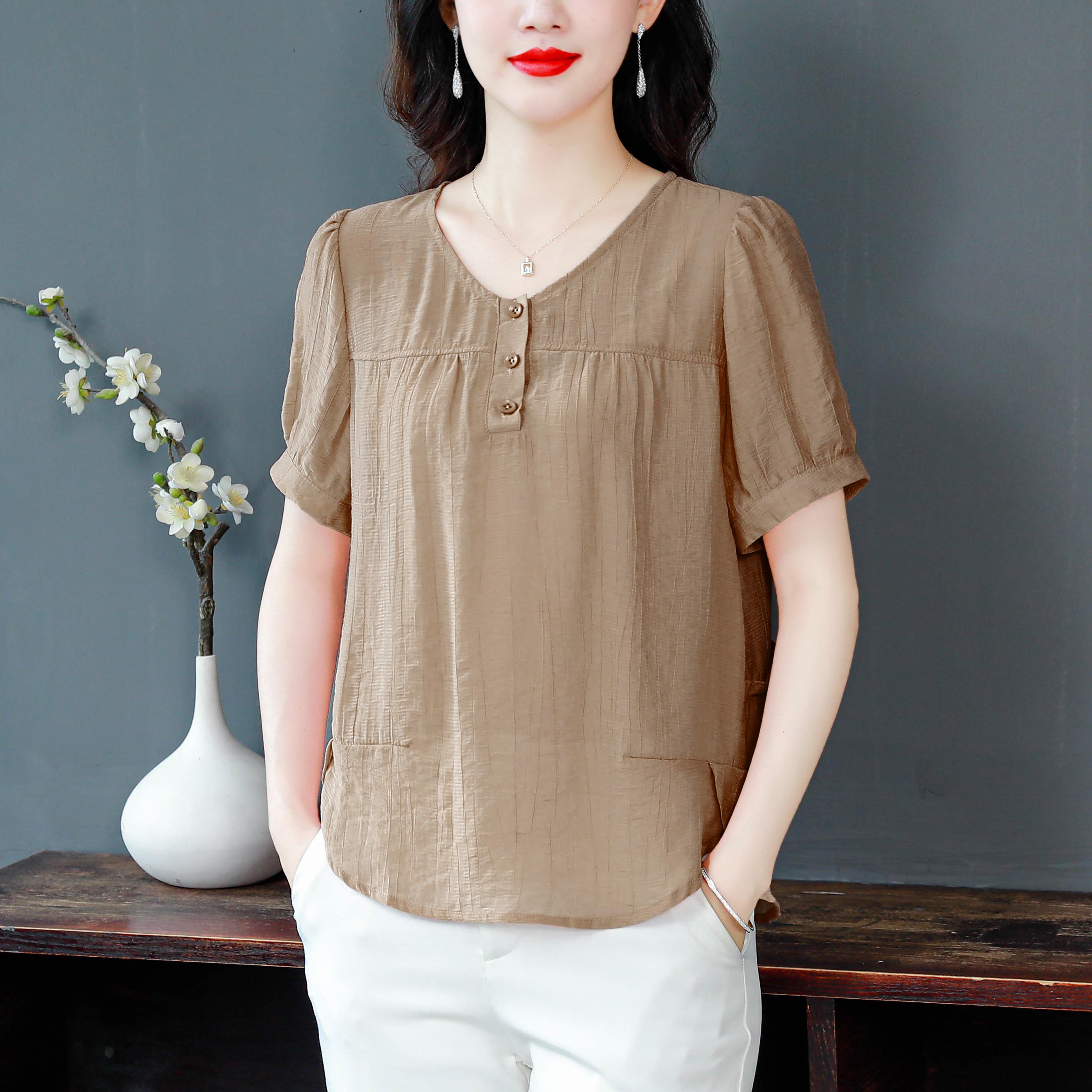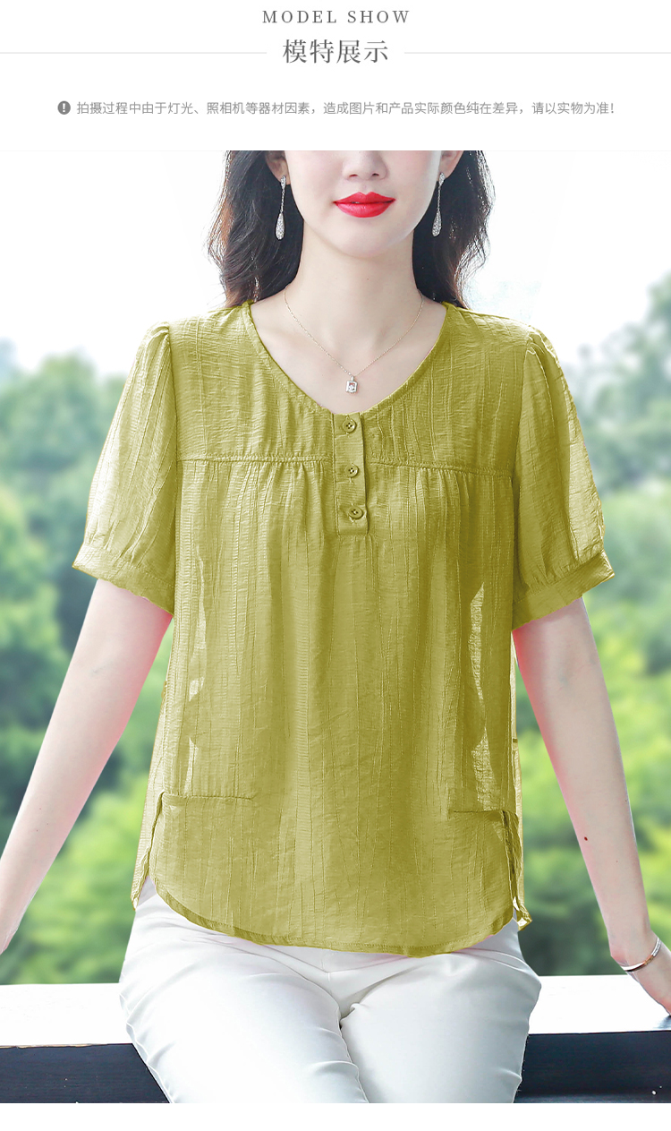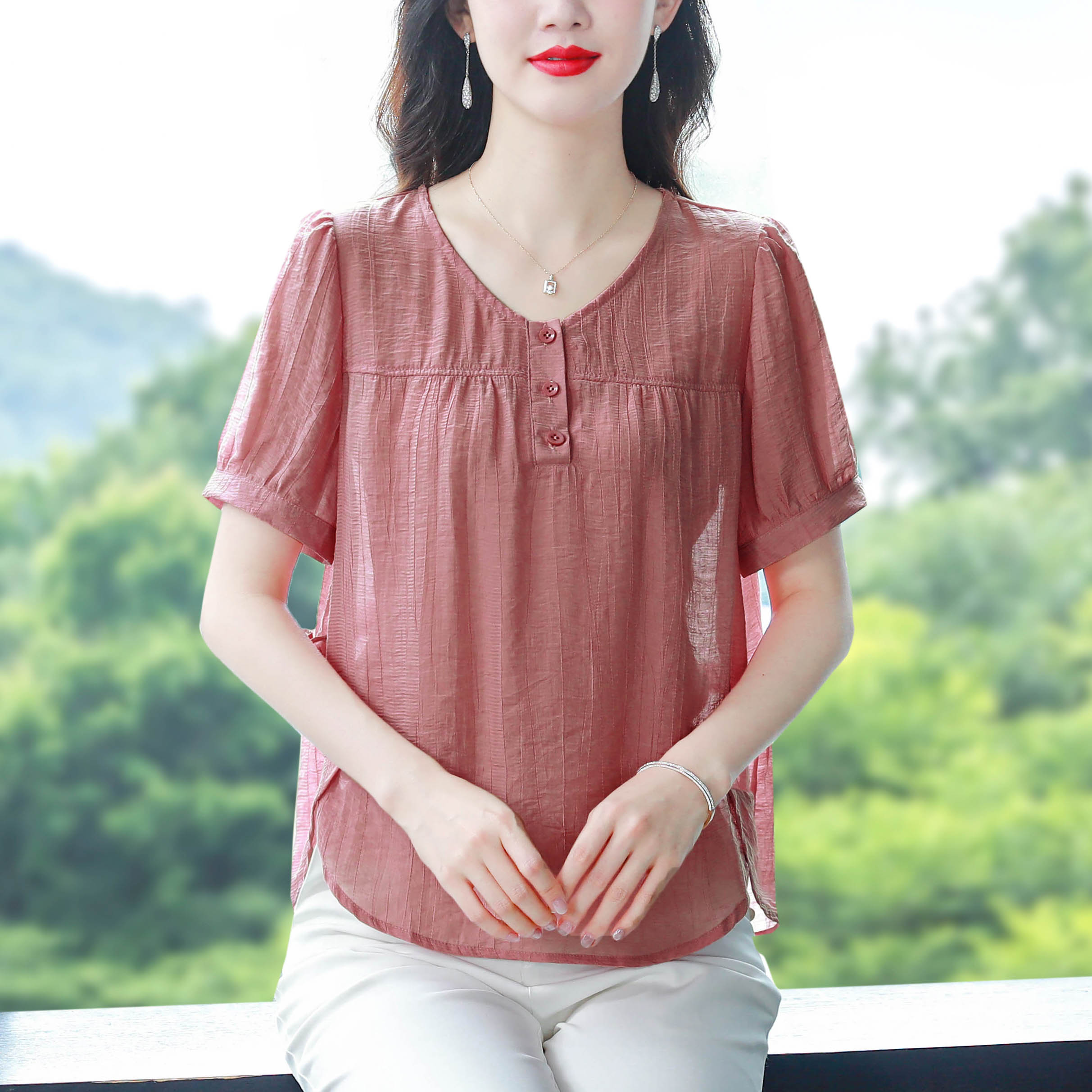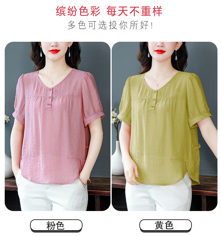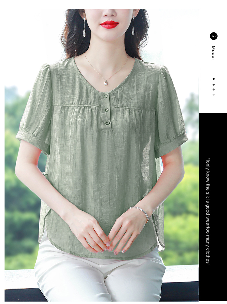 RY3525# 夏新款天丝棉麻时尚洋气大码女上衣遮肚子显瘦圆领开扣短袖