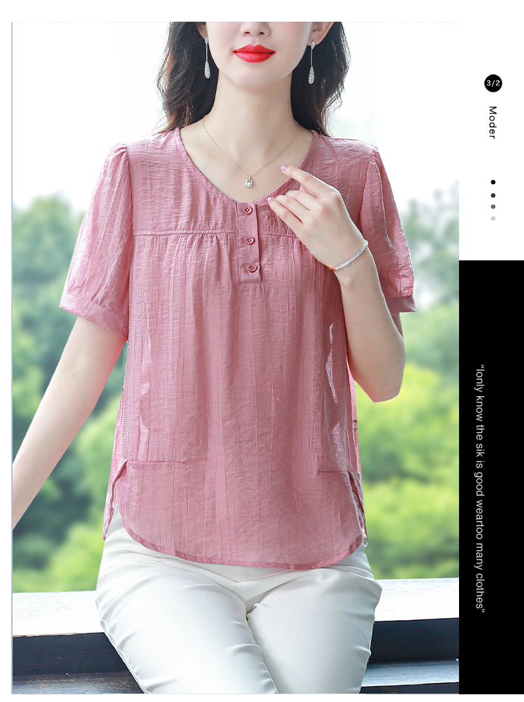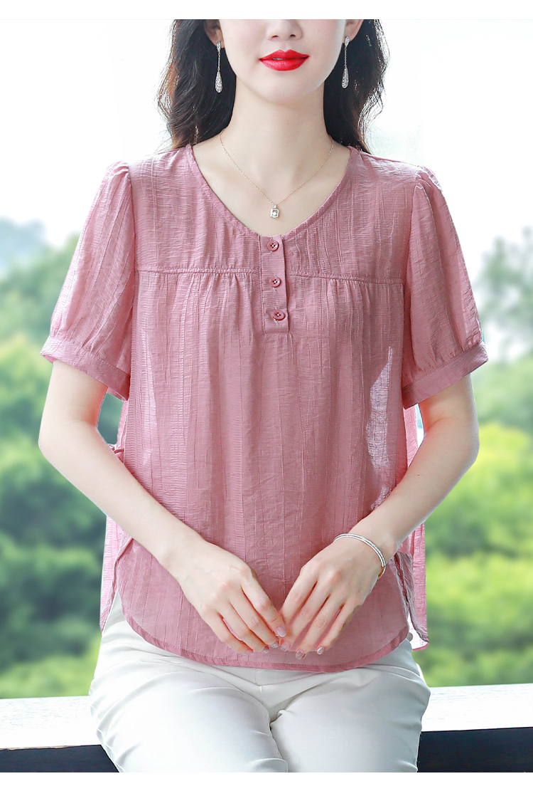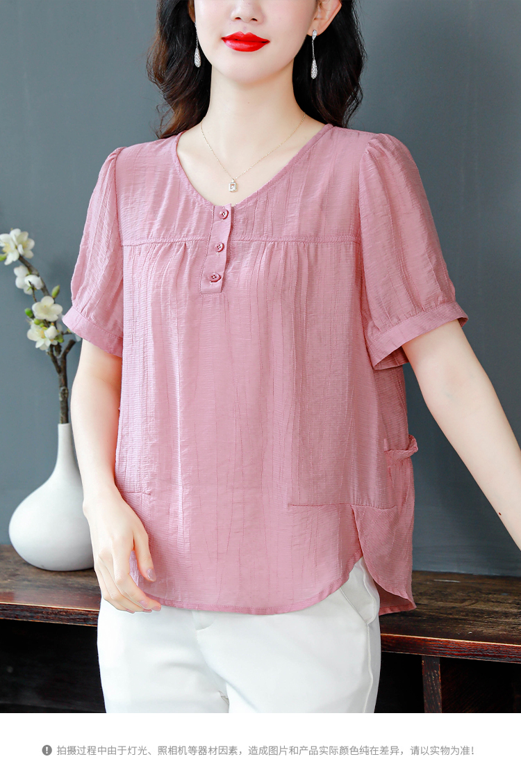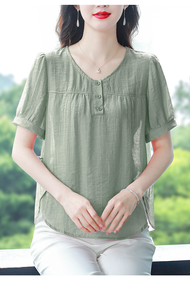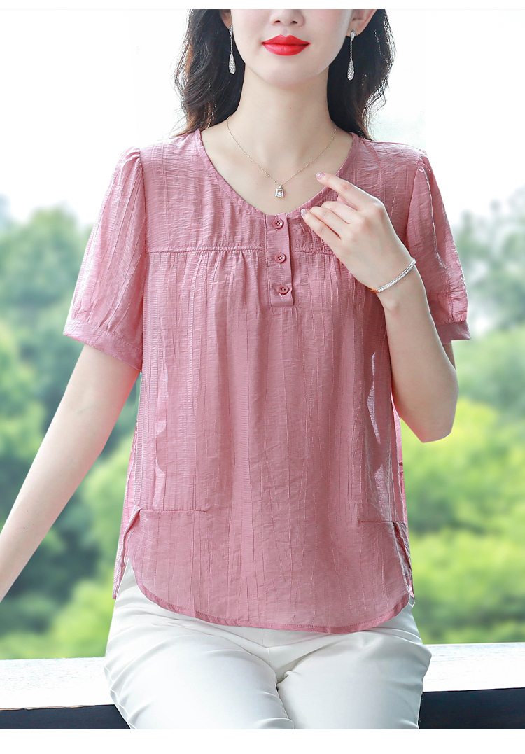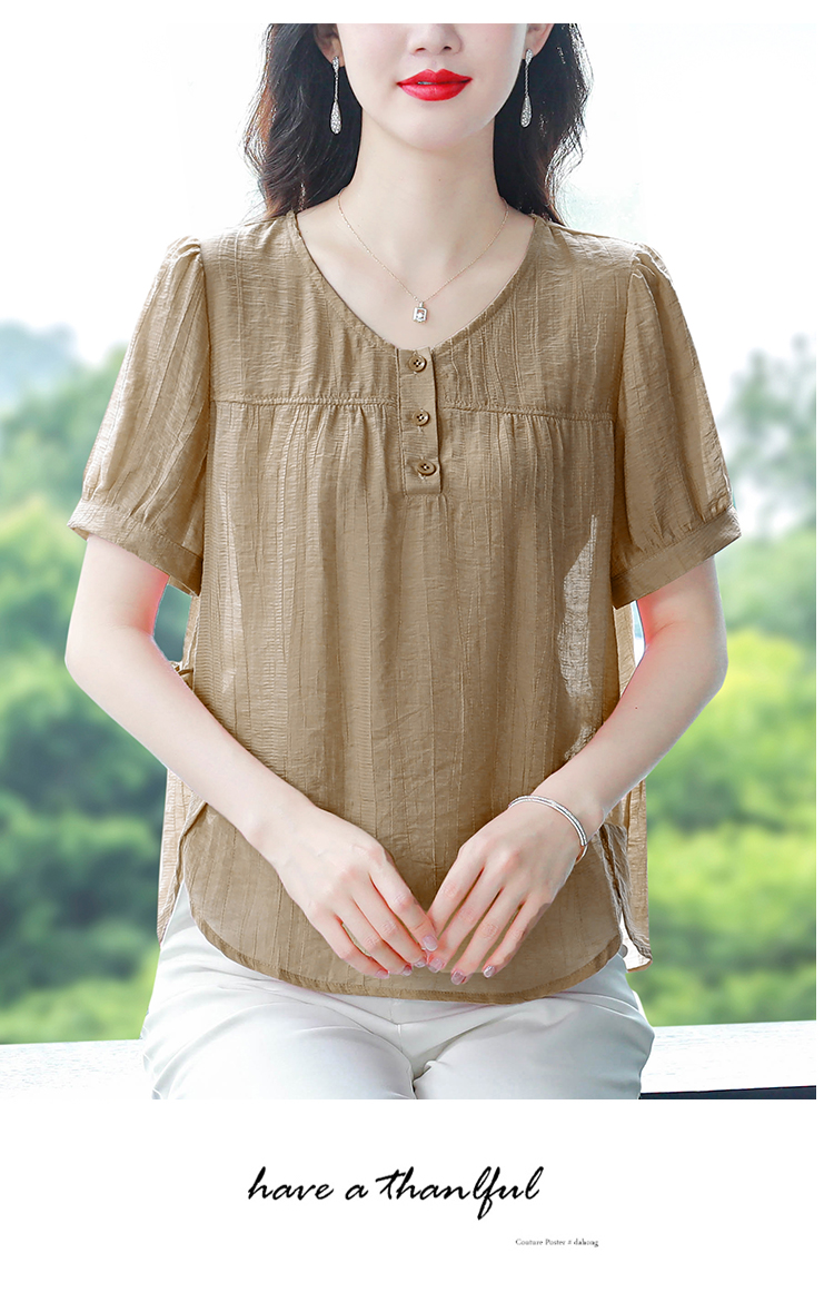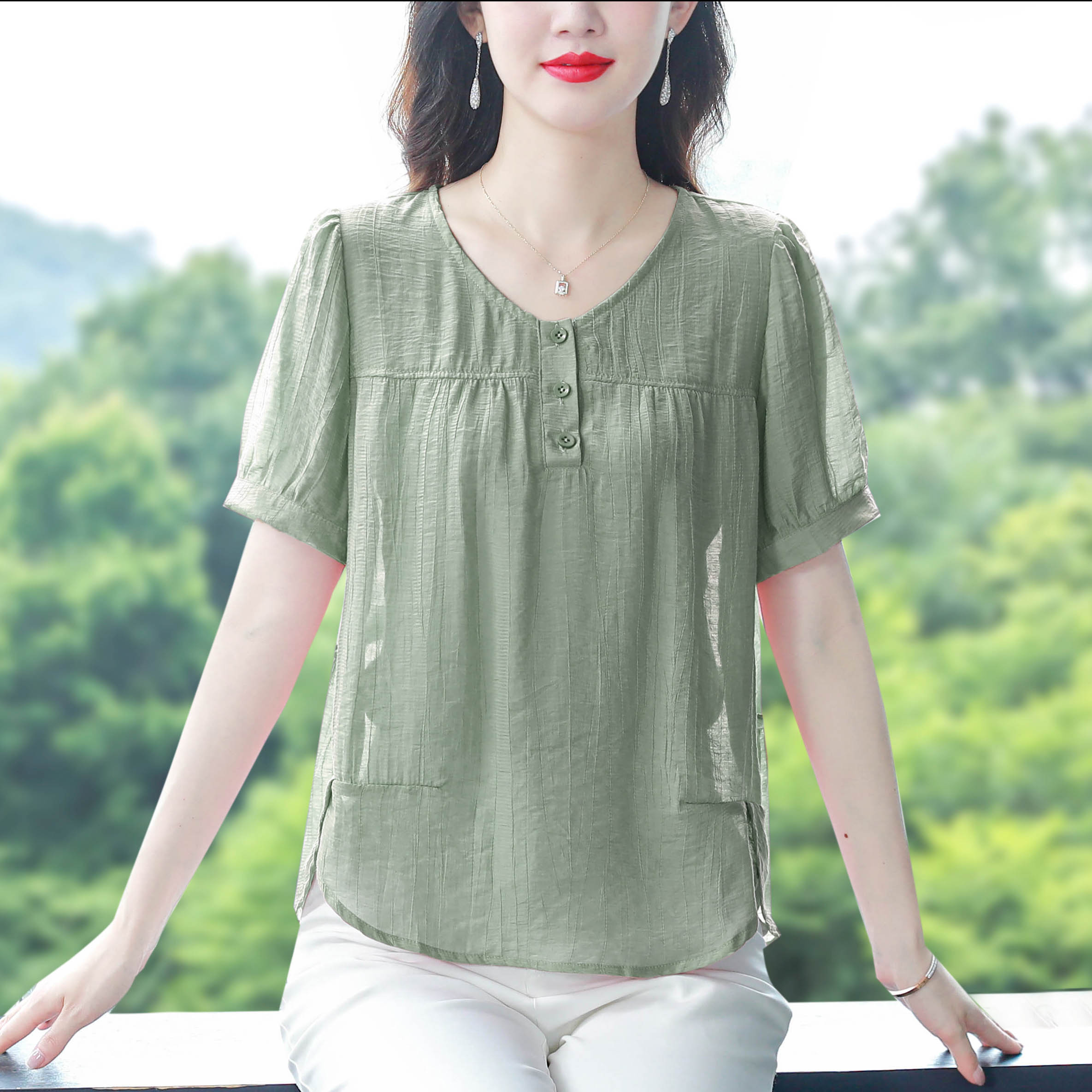 RY3525# 夏新款天丝棉麻时尚洋气大码女上衣遮肚子显瘦圆领开扣短袖