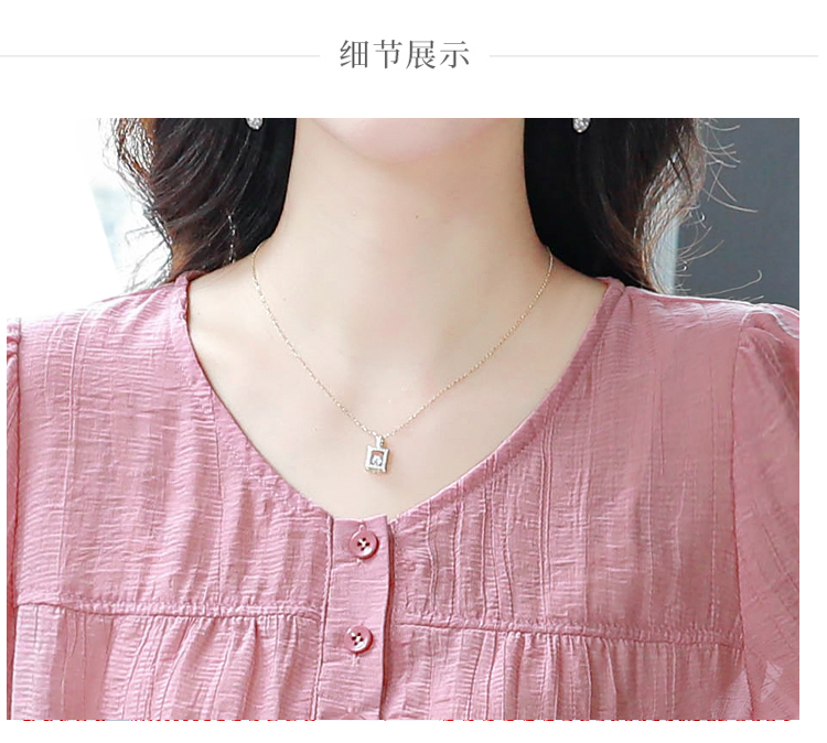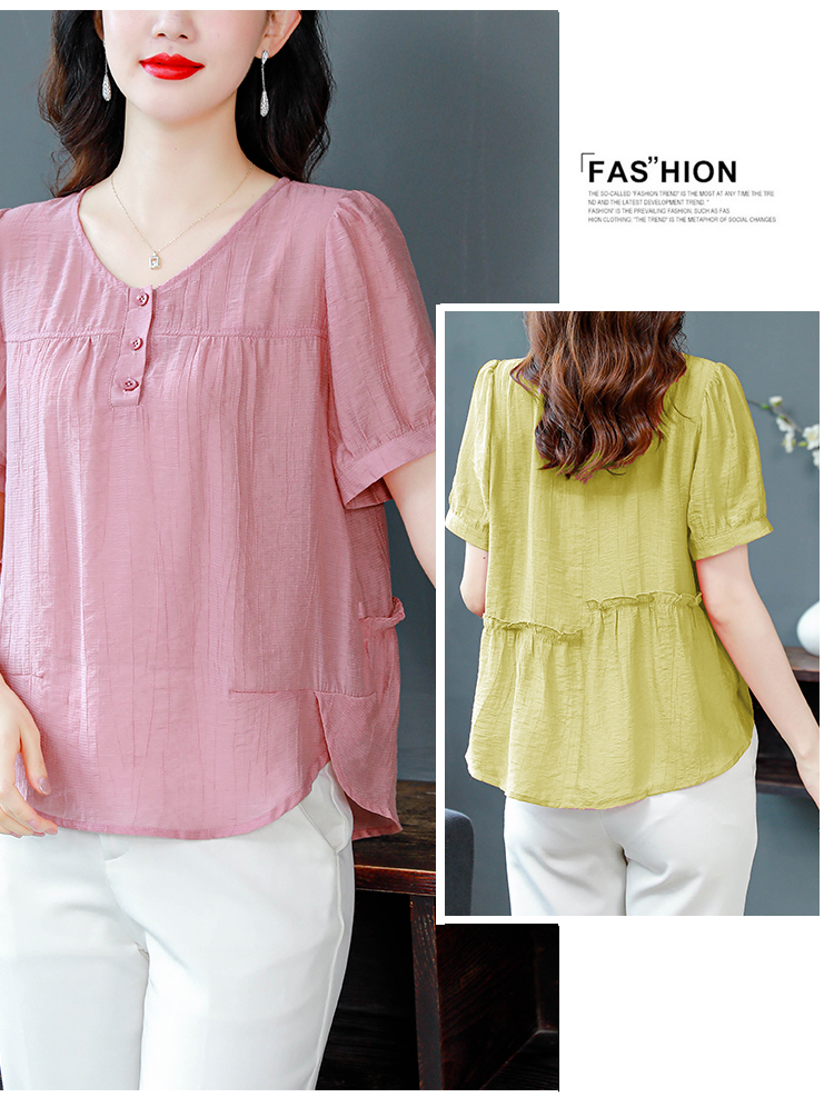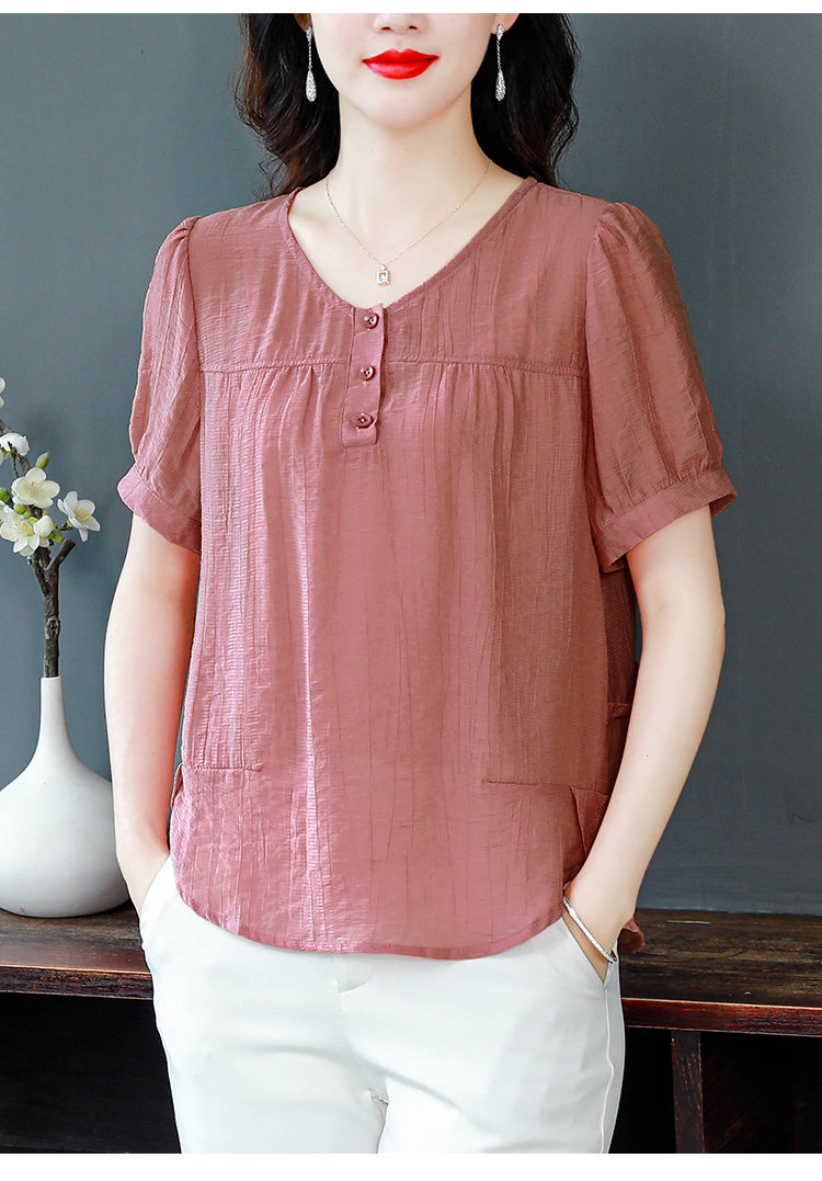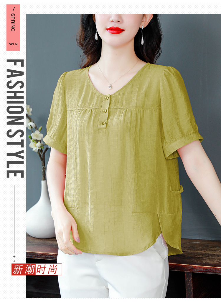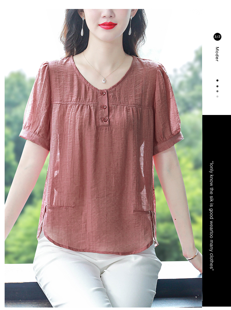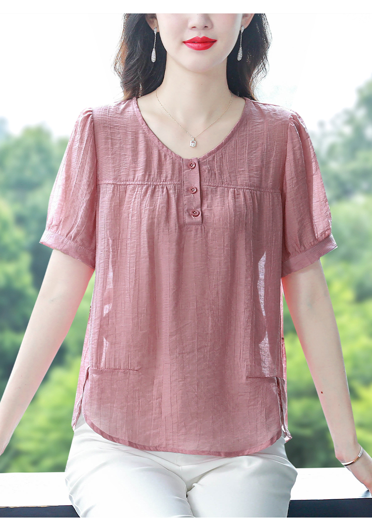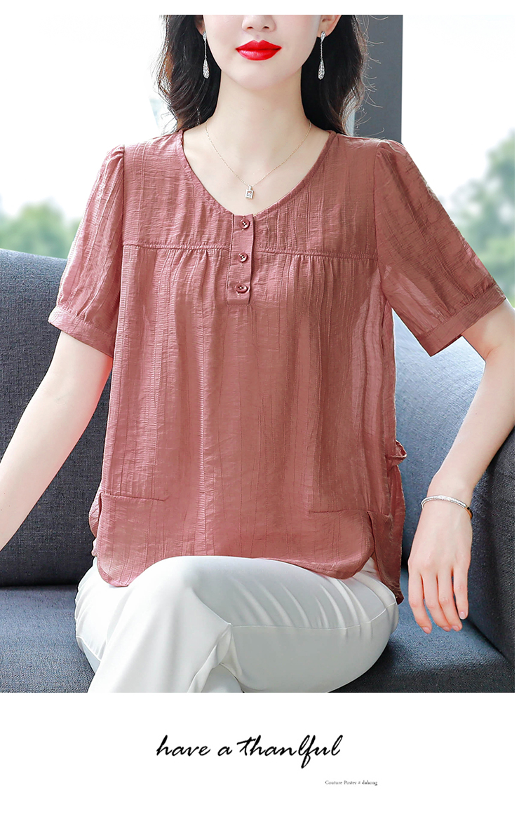 RY3525# 夏新款天丝棉麻时尚洋气大码女上衣遮肚子显瘦圆领开扣短袖