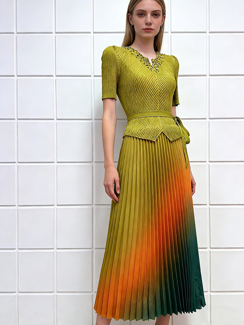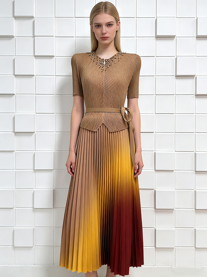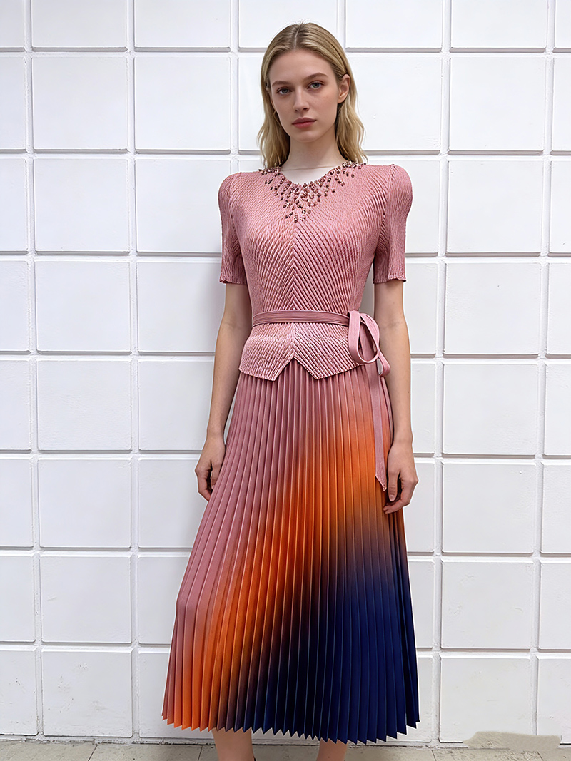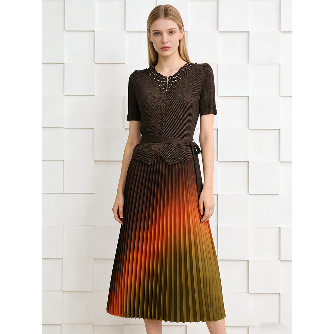 RY3557# 三宅外贸东南亚风褶皱钉珠打钻龙鳞褶上衣印花绑带收腰宽松百褶裙