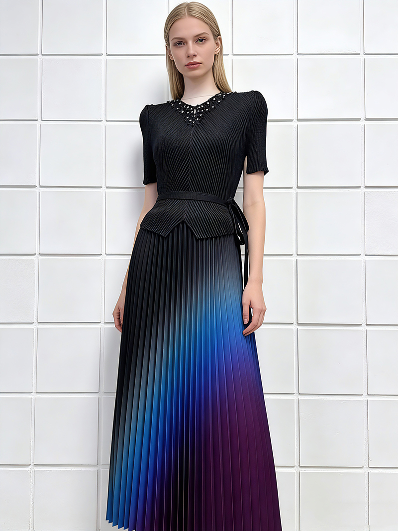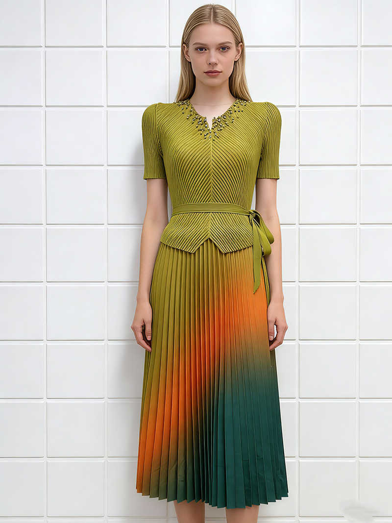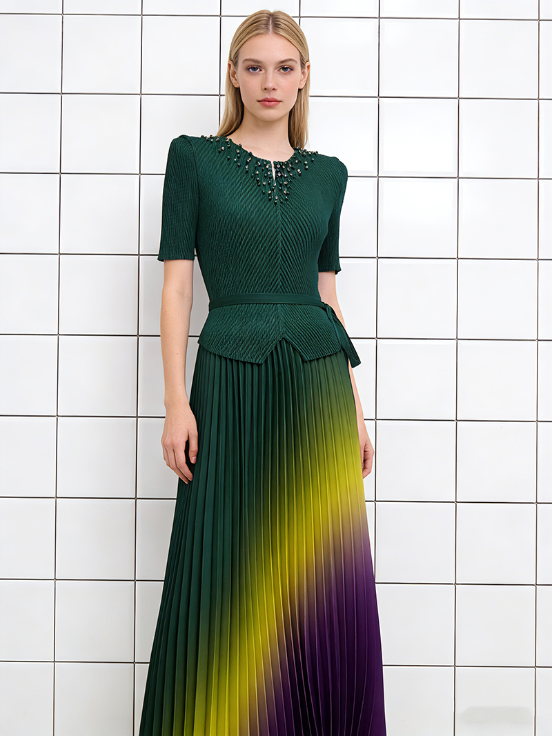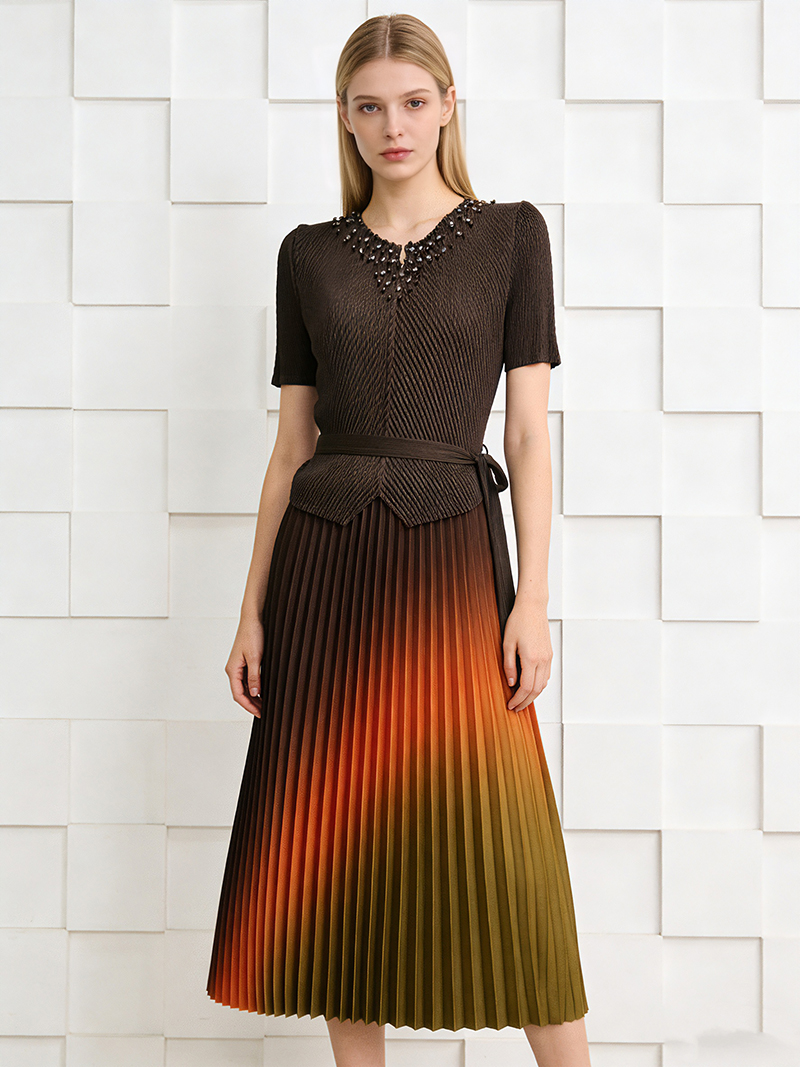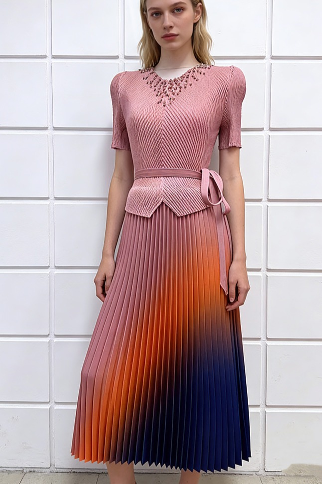 RY3557# 三宅外贸东南亚风褶皱钉珠打钻龙鳞褶上衣印花绑带收腰宽松百褶裙