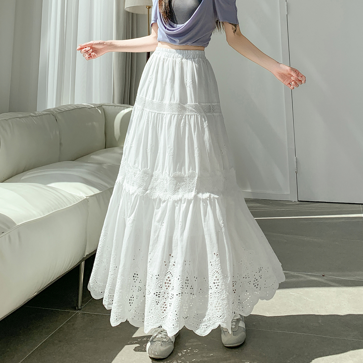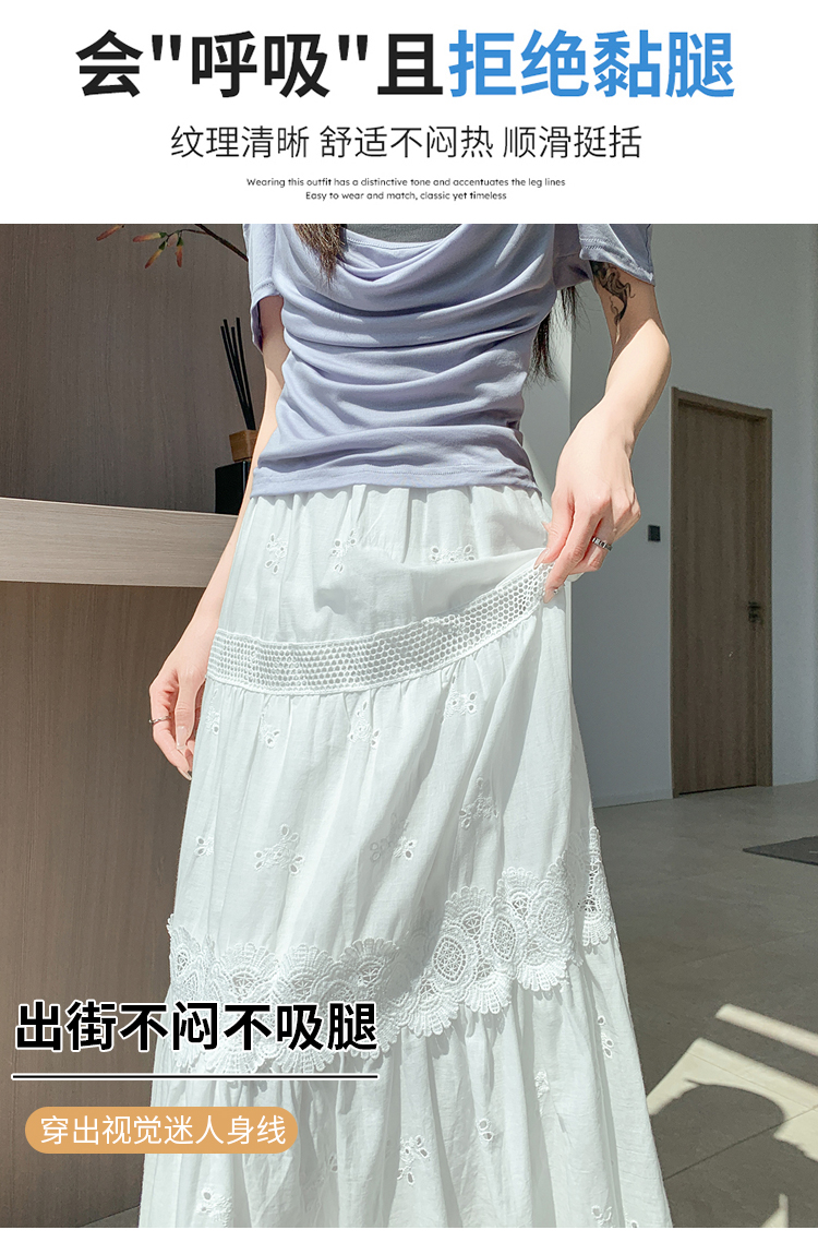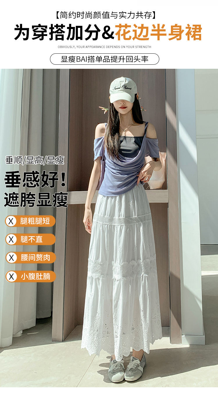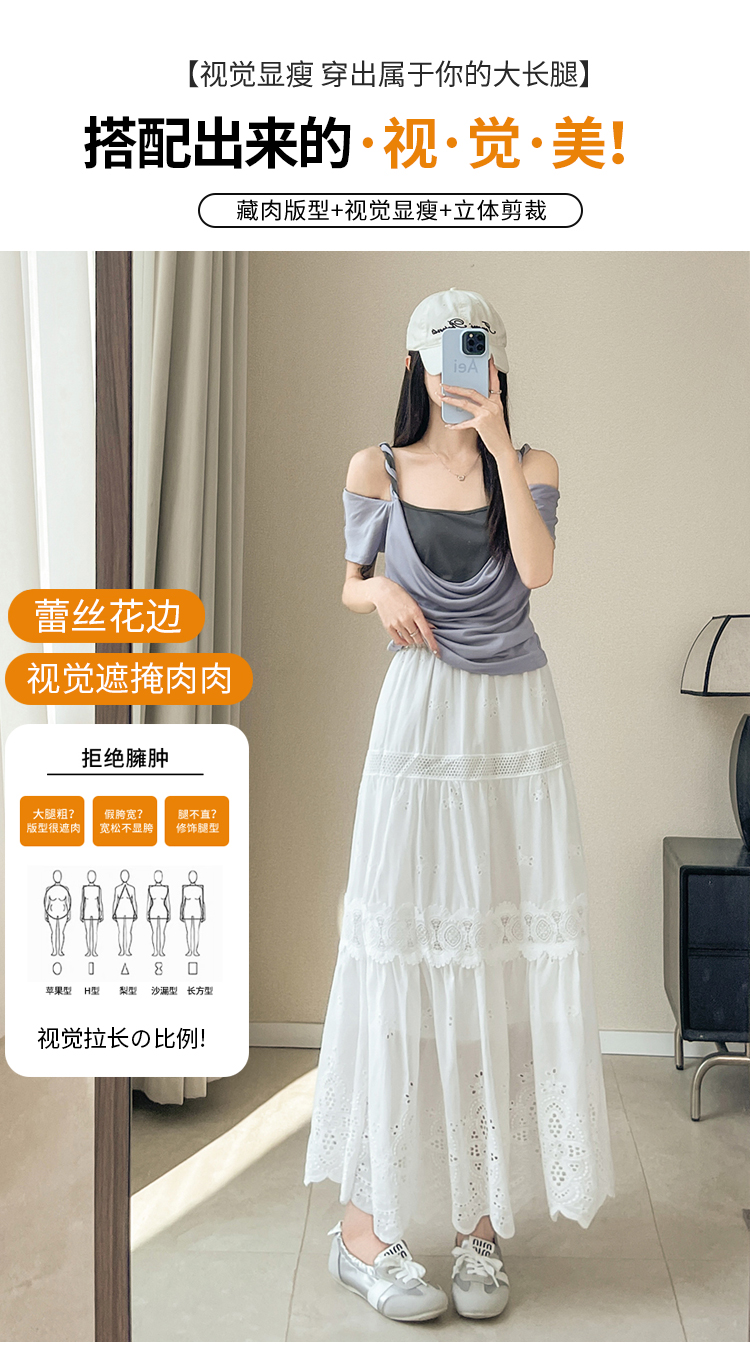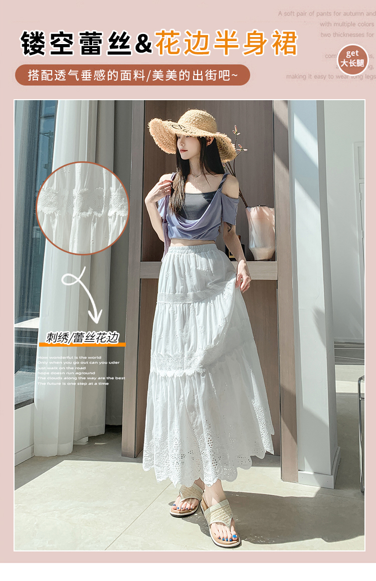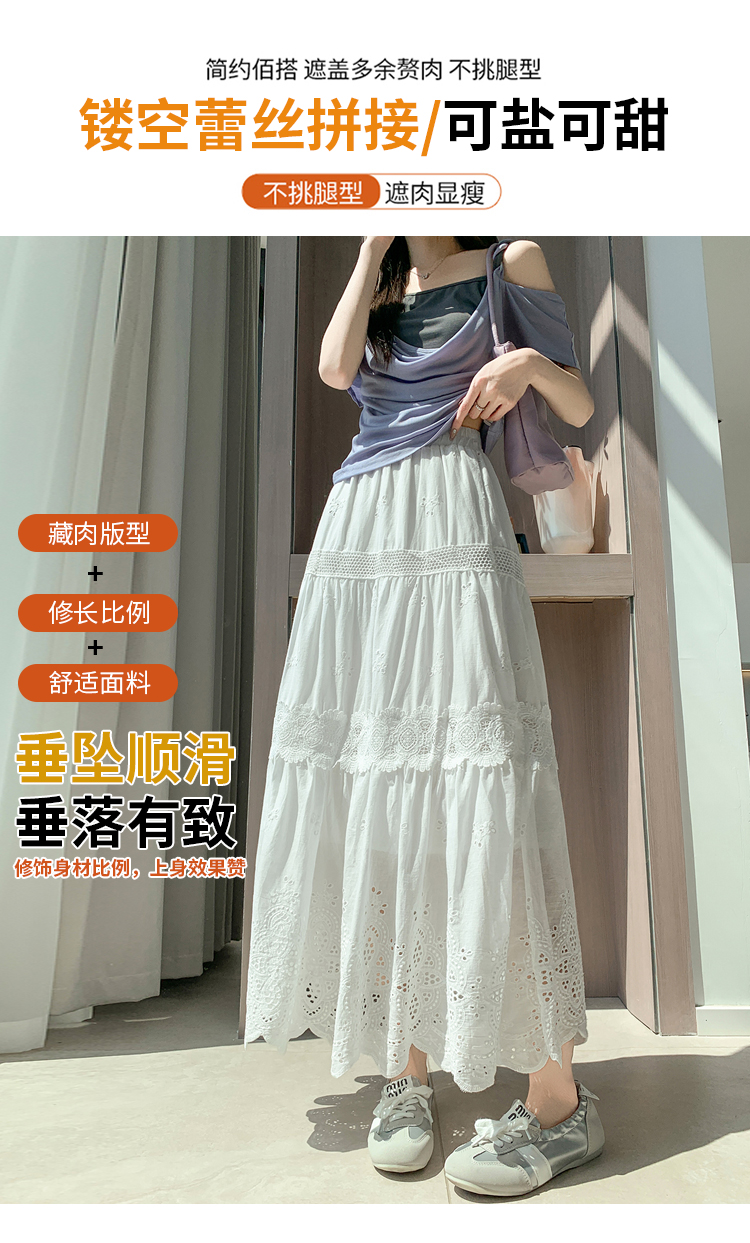 RY3580# 实拍白色蕾丝花边百褶蛋糕半身裙女夏季镂空垂感长裙a字大摆伞裙