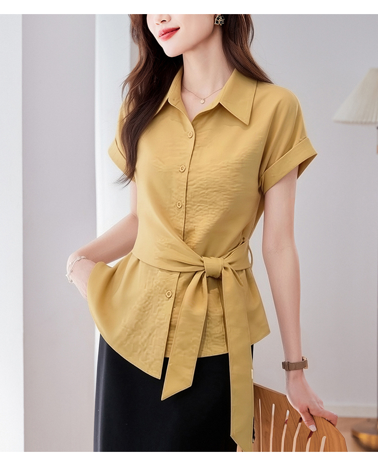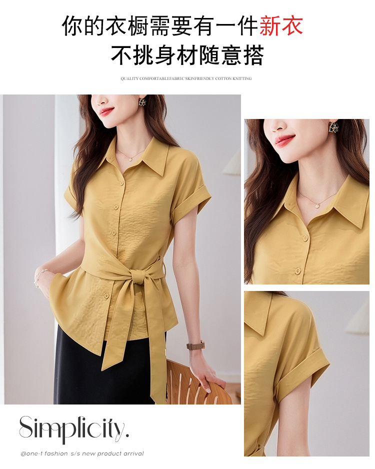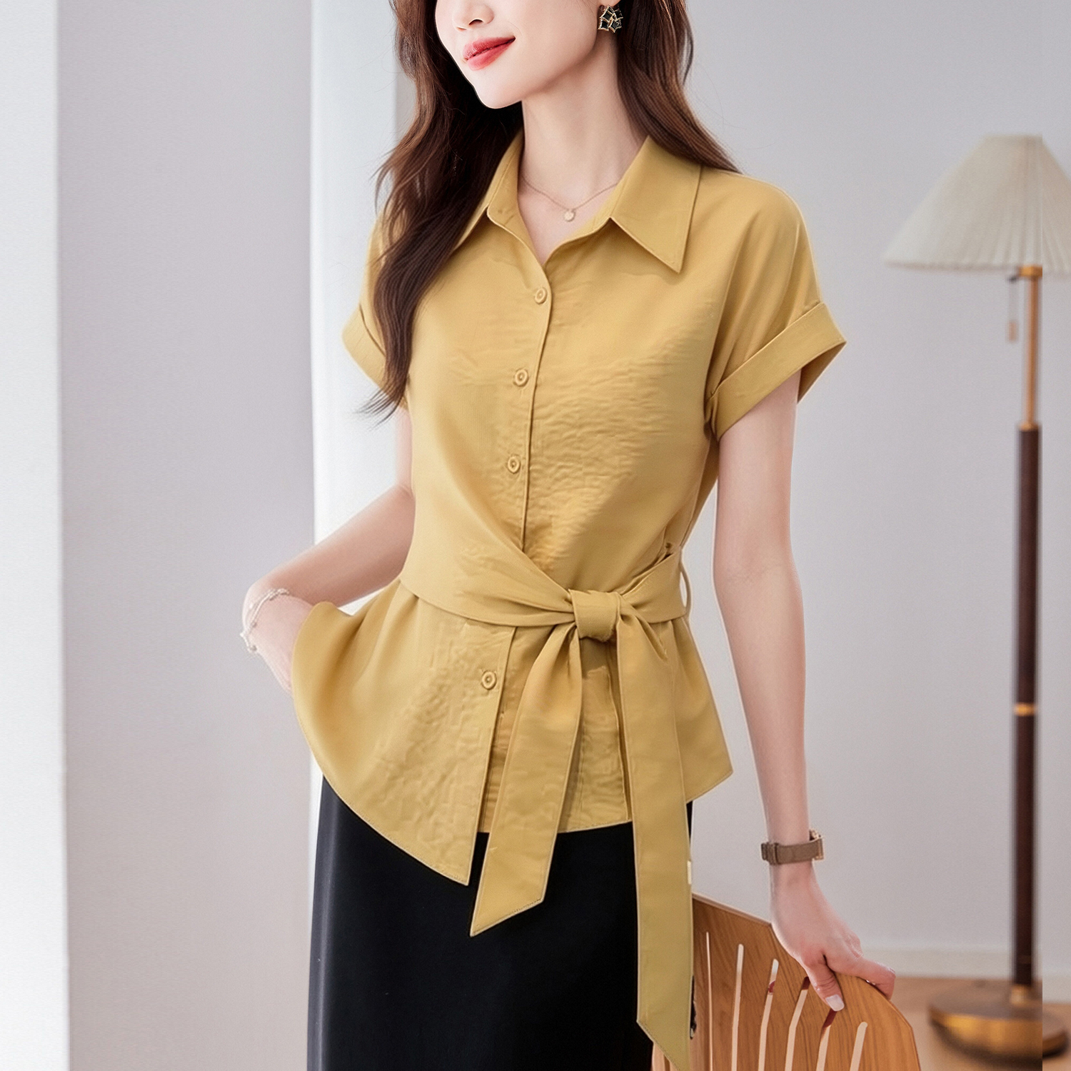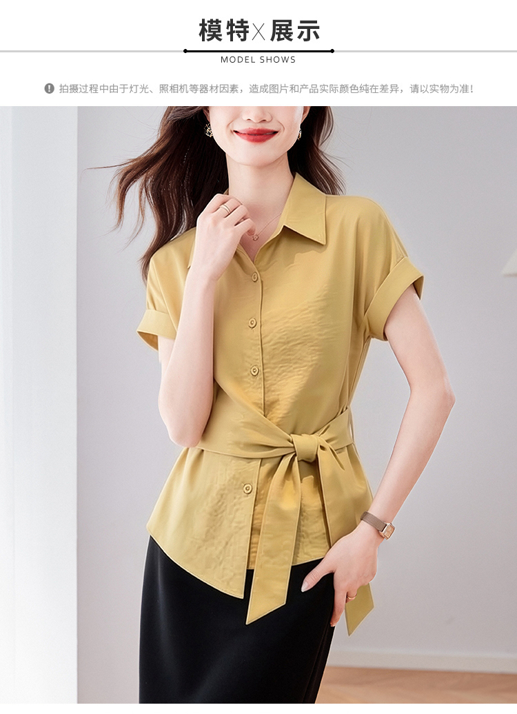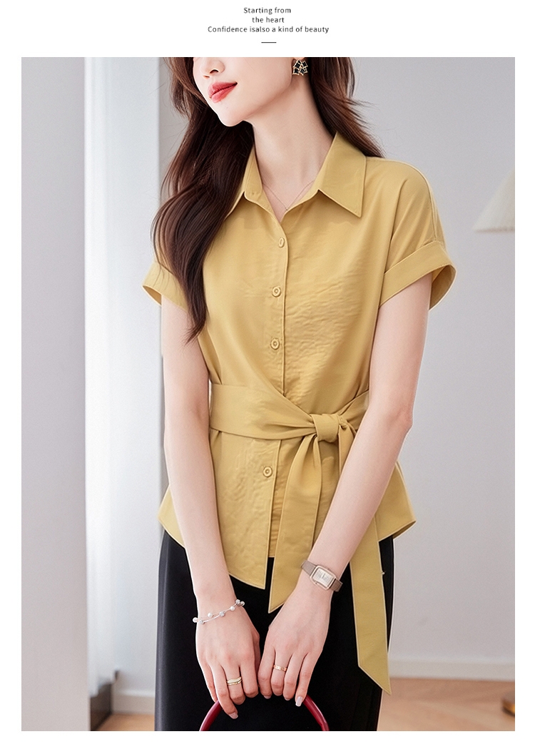 RY3614# 实拍独特漂亮气质黄色收腰短袖衬衫2026夏季新款休闲百搭显瘦上衣