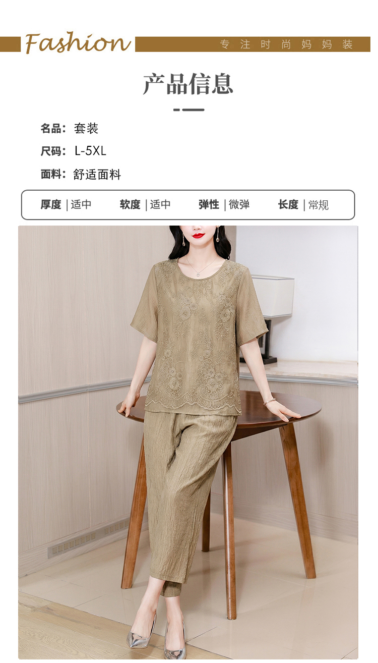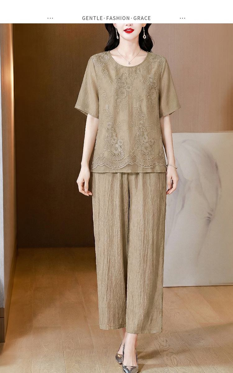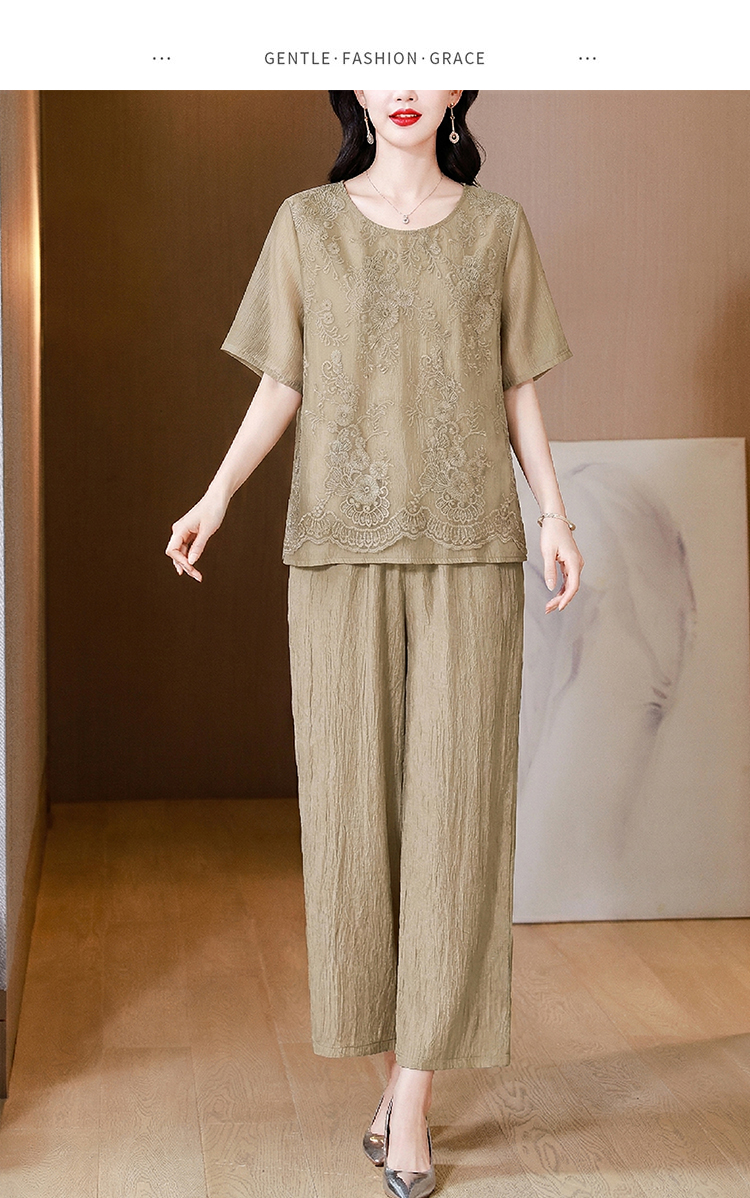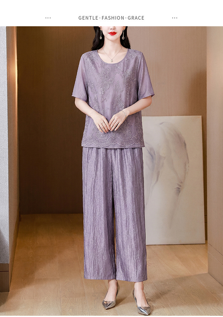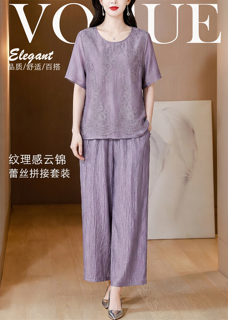 RY3618# 中年妈妈装2026夏装薄款套装阔太太洋气蕾丝拼接短袖阔腿裤两件套