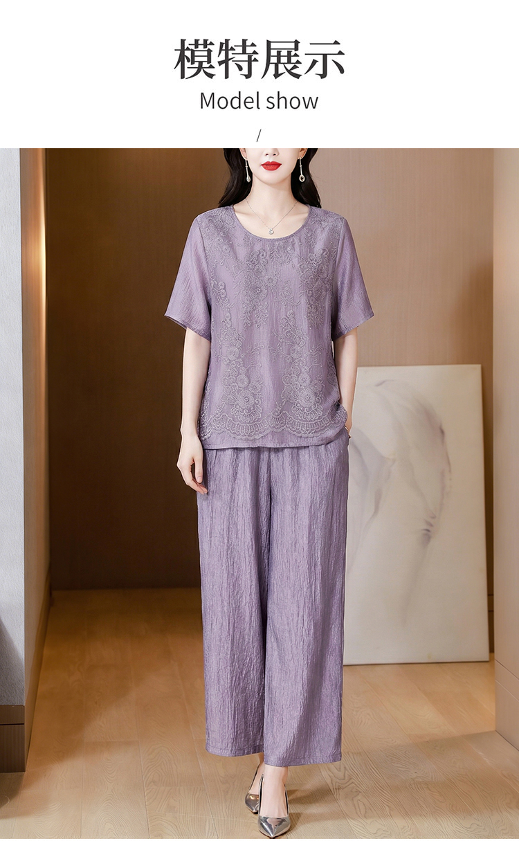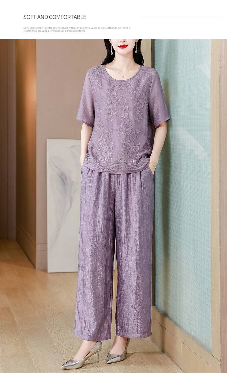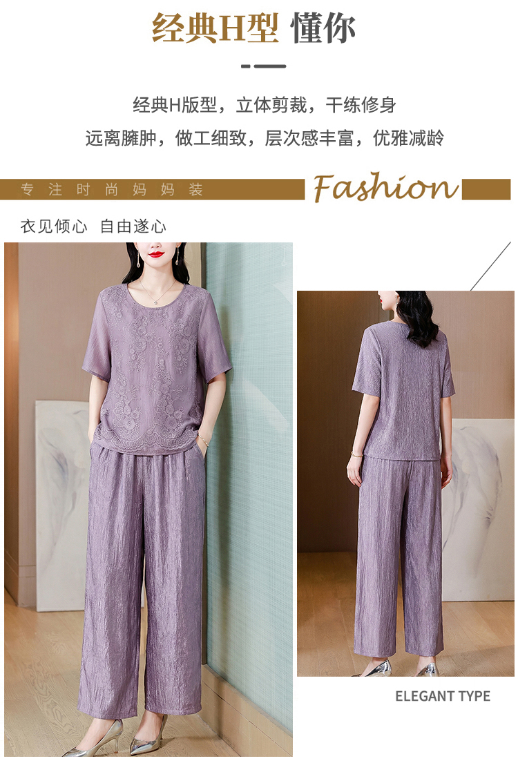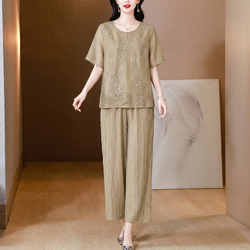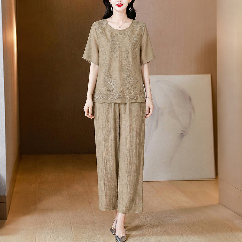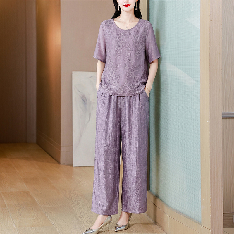 RY3618# 中年妈妈装2026夏装薄款套装阔太太洋气蕾丝拼接短袖阔腿裤两件套