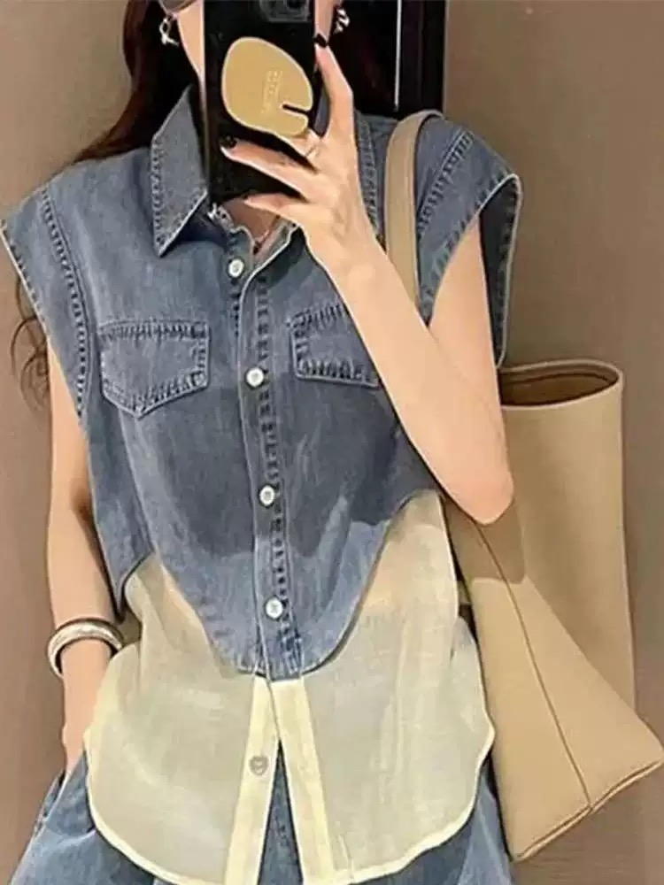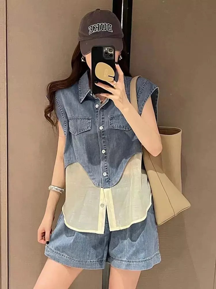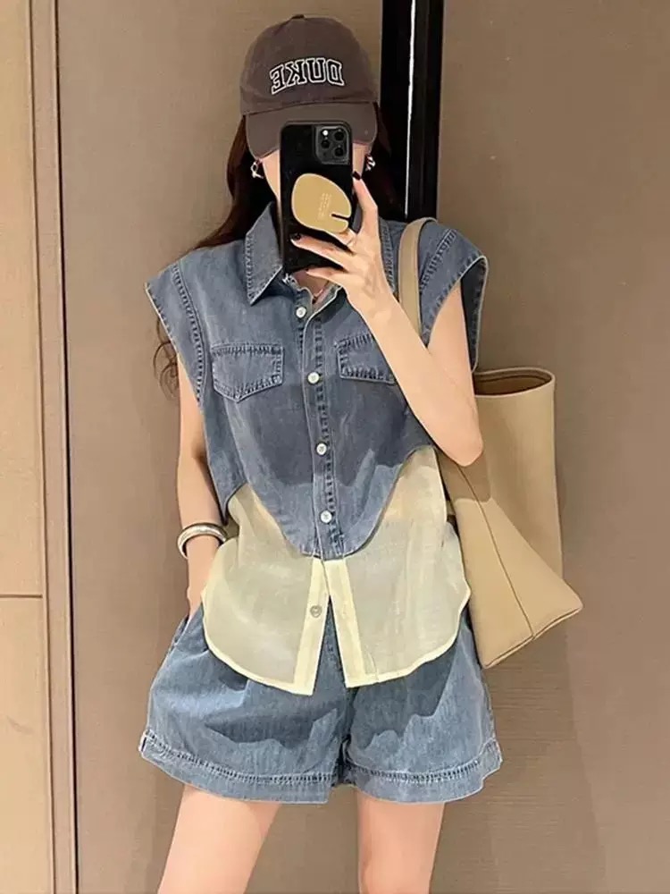 RY3630# 夏季穿搭一整套2026新款减龄洋气牛仔拼接无袖搭配休闲短裤两件套