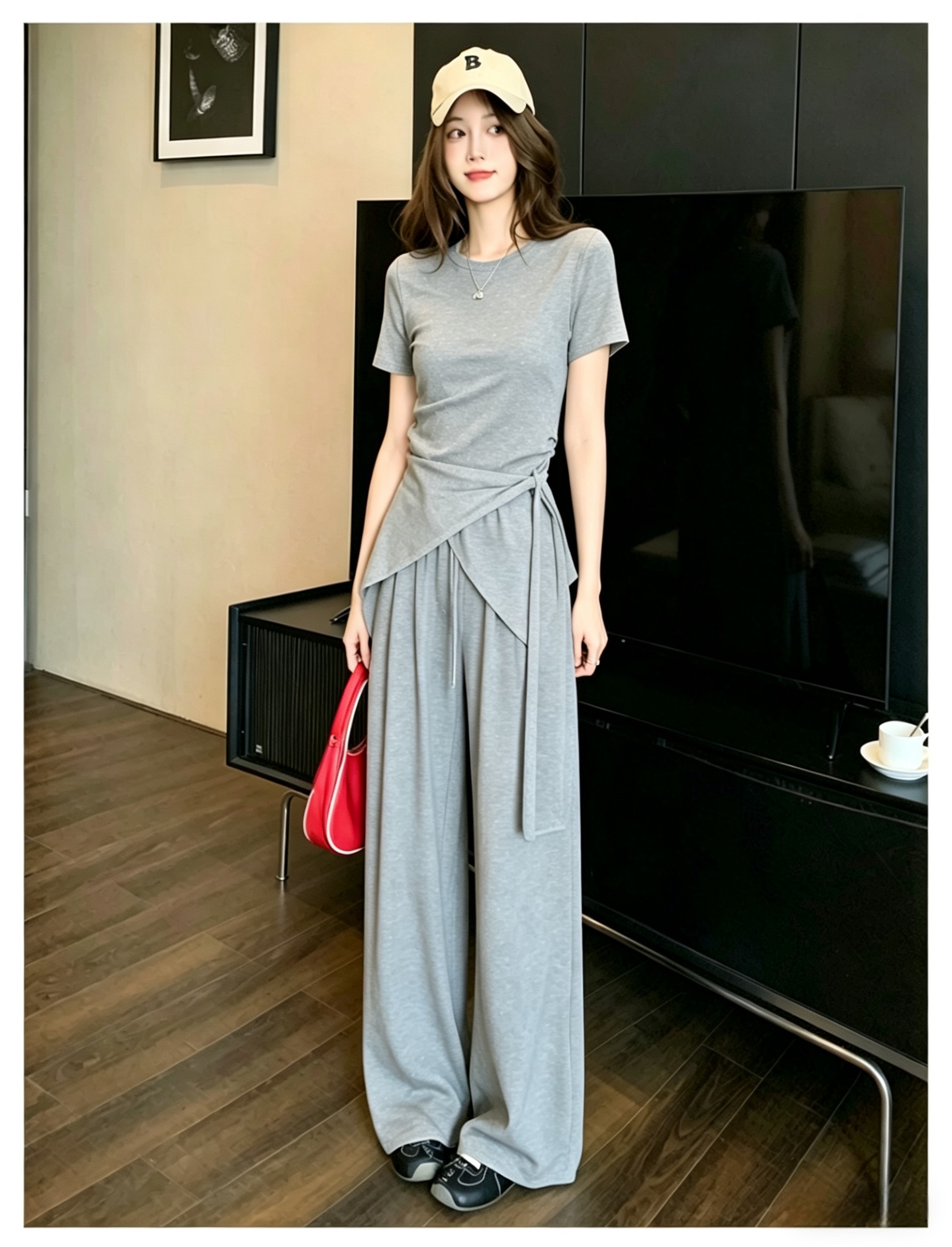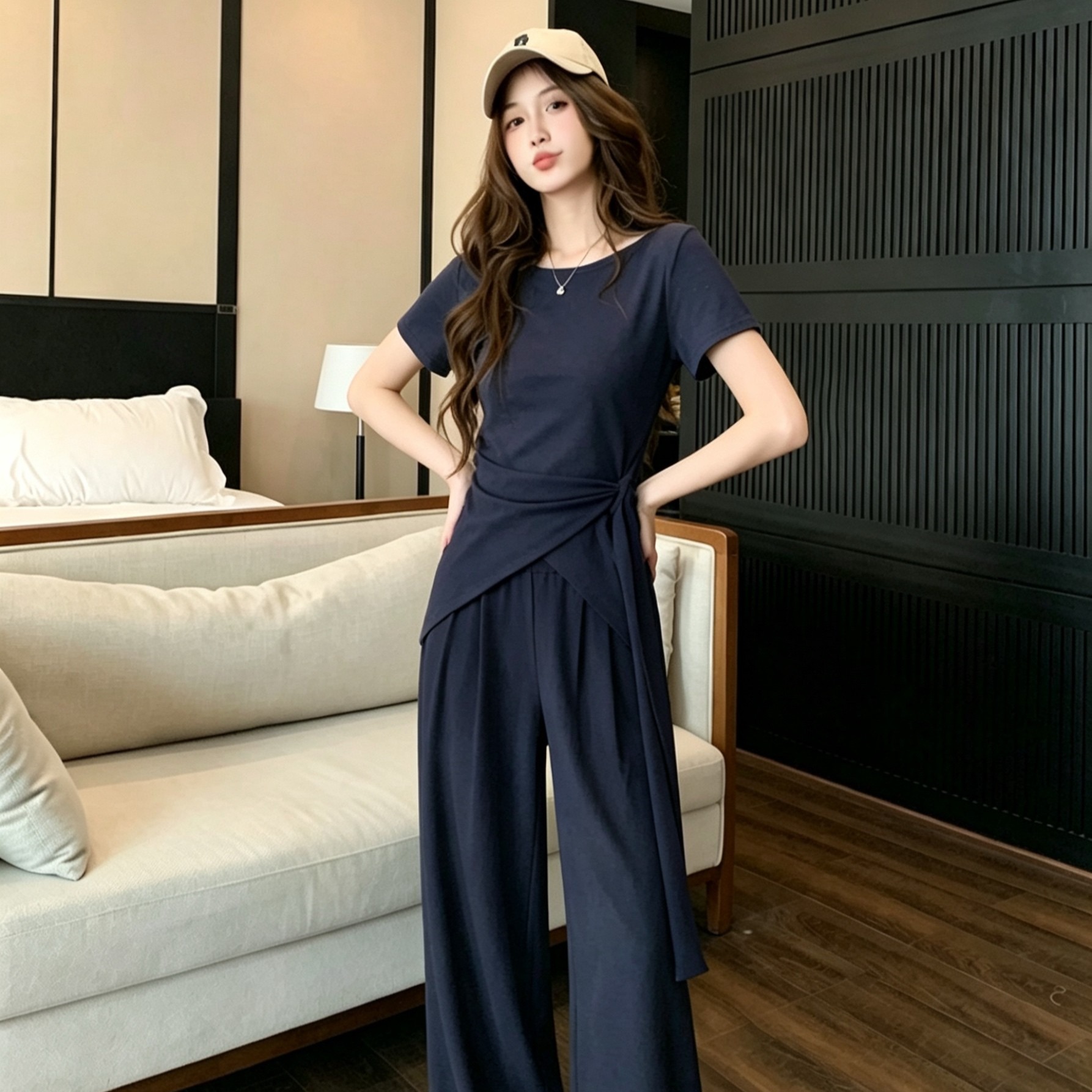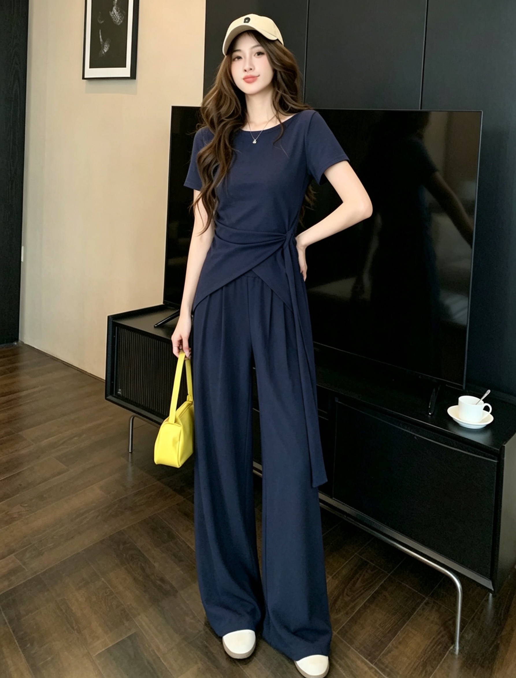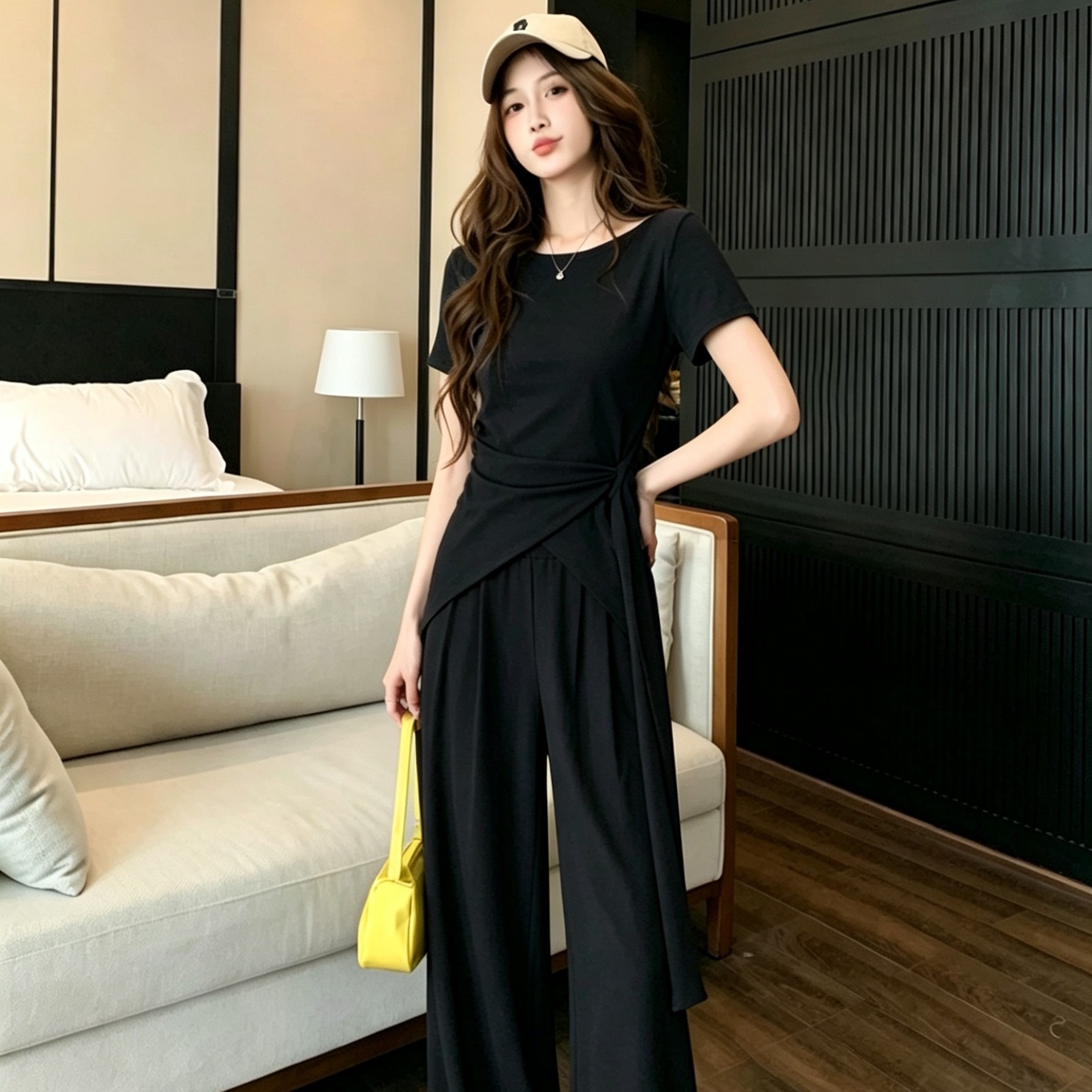 RY3736# 2026夏季新款设计不规则显瘦短袖上衣女高腰休闲阔腿裤两件套套装