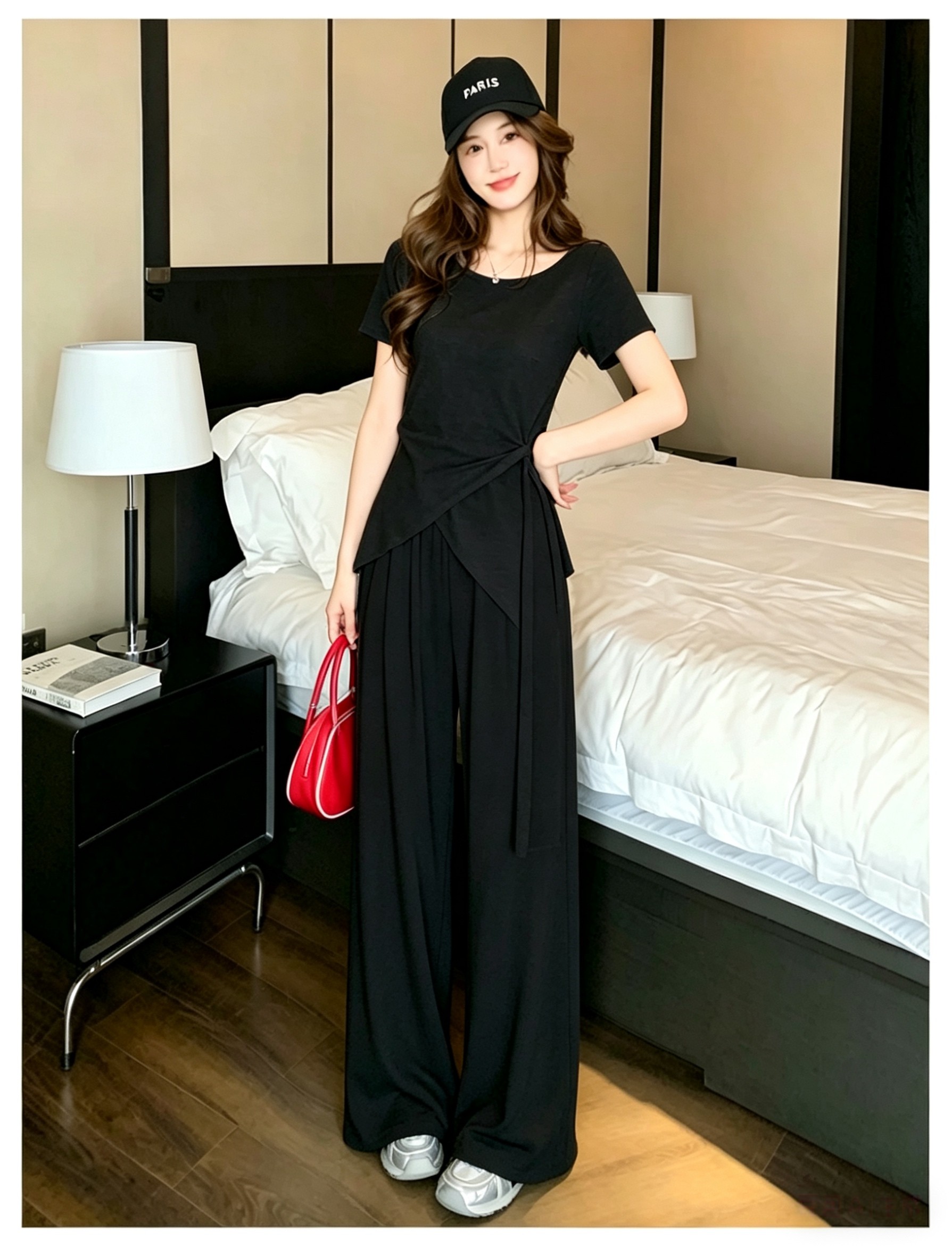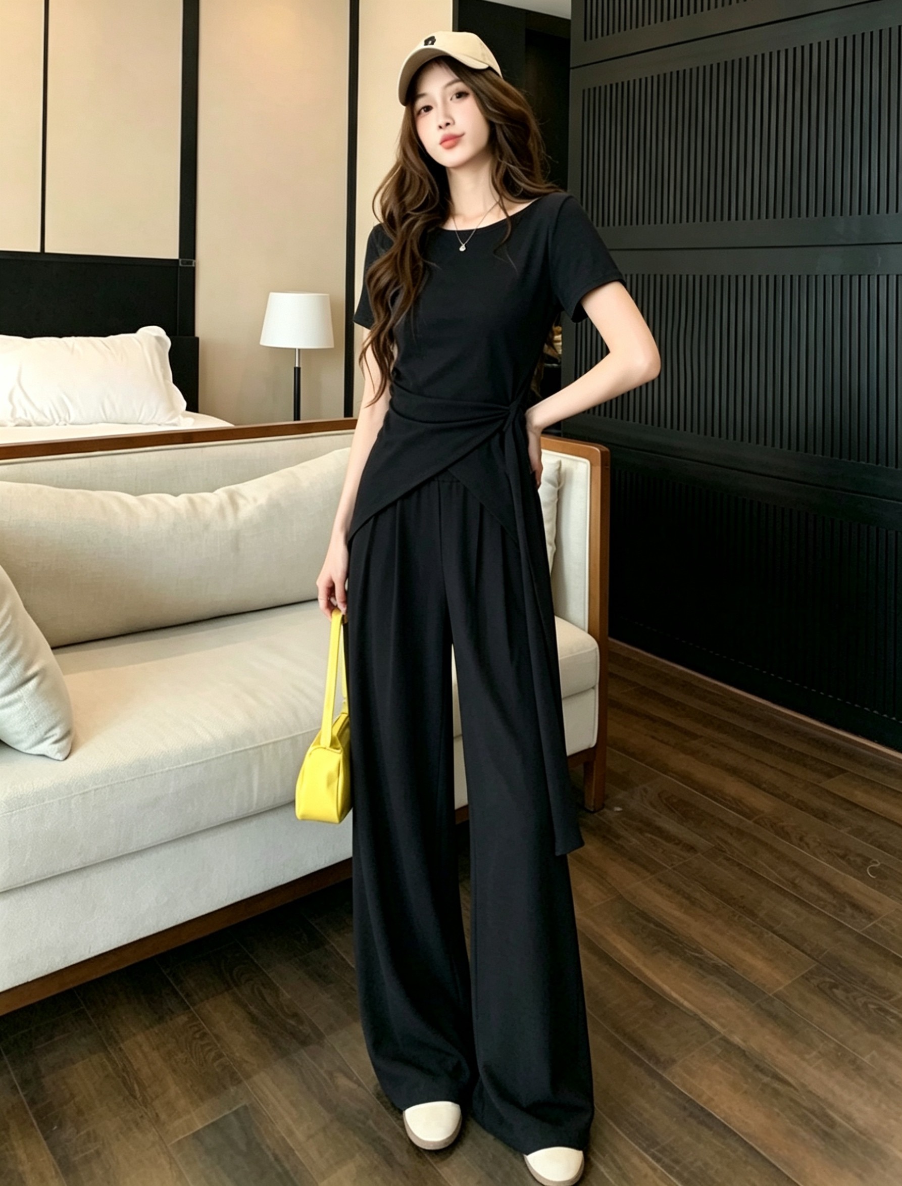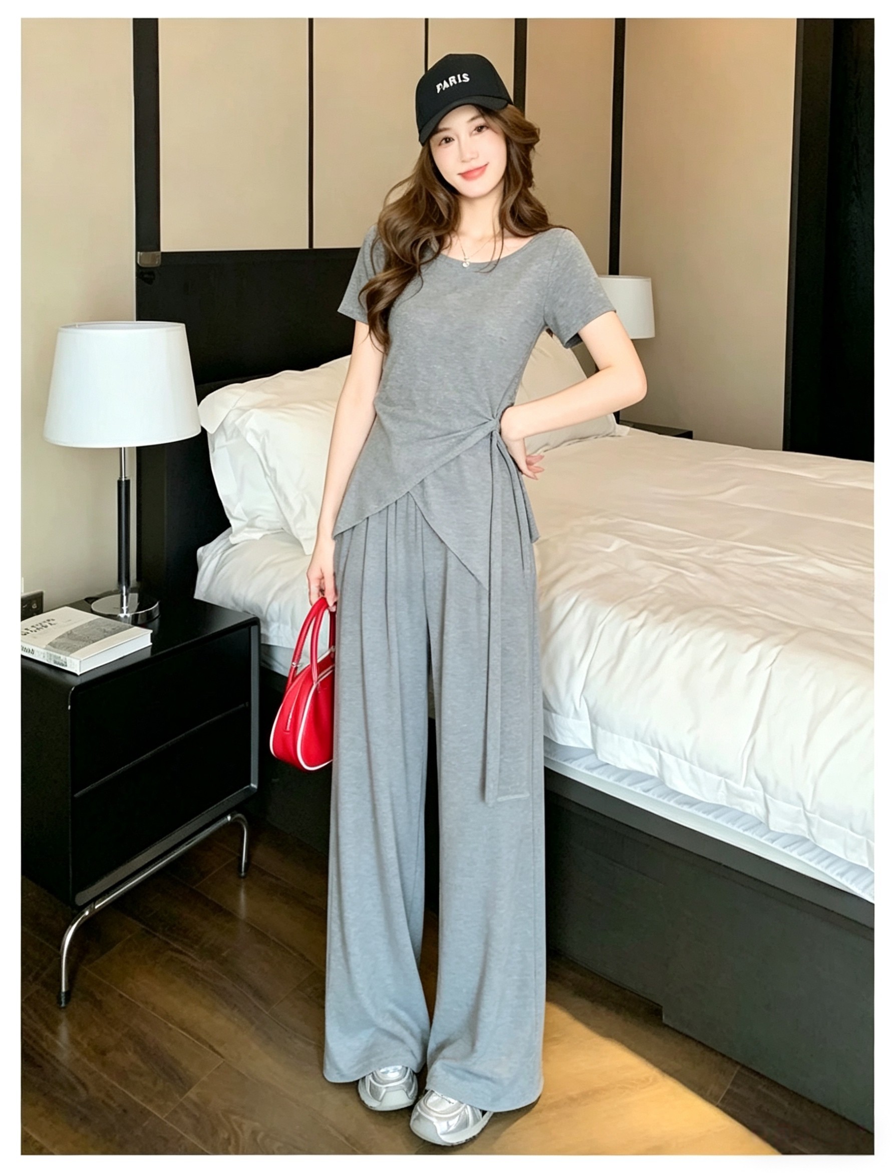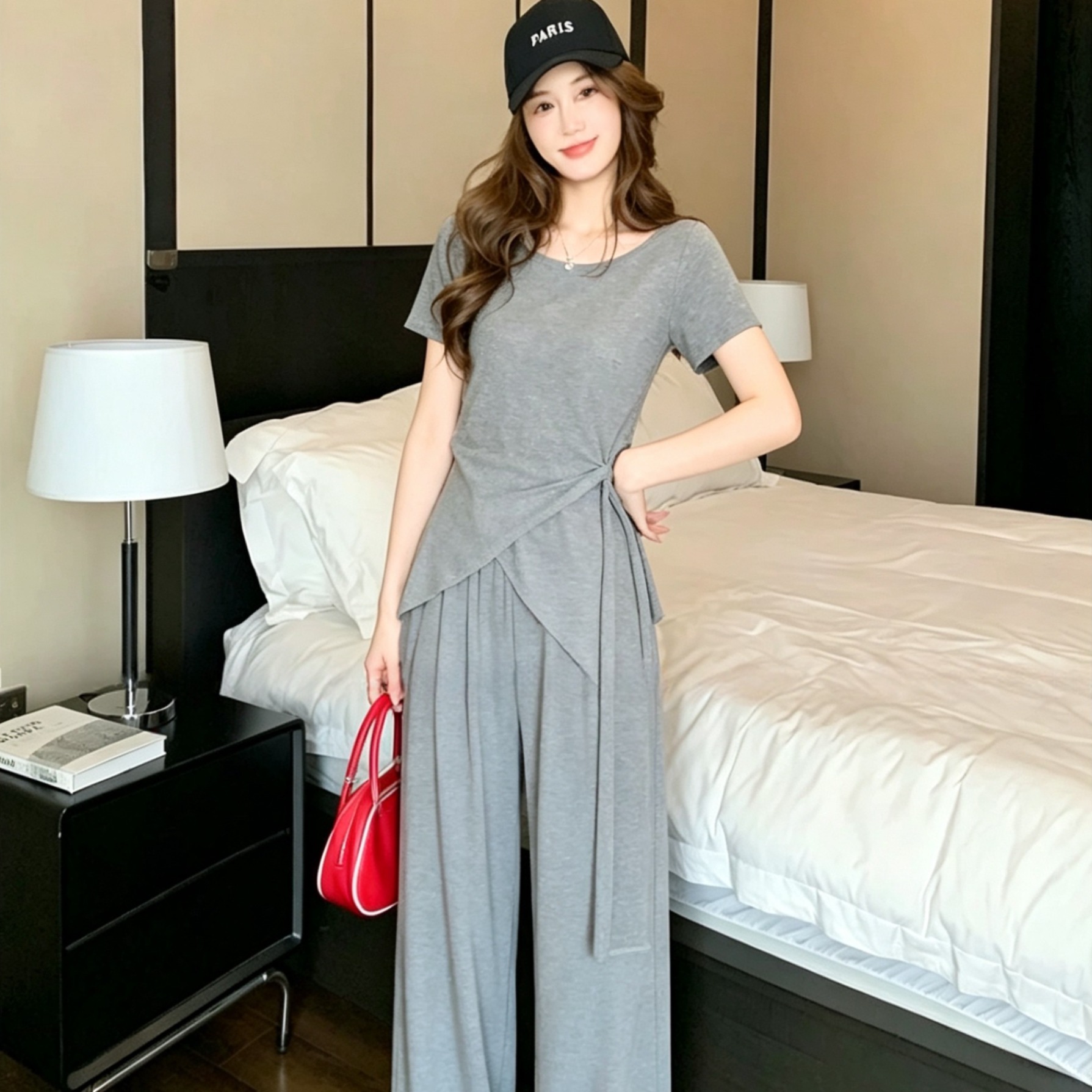 RY3736# 2026夏季新款设计不规则显瘦短袖上衣女高腰休闲阔腿裤两件套套装